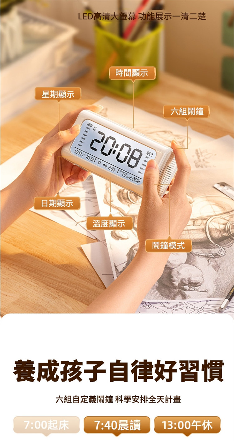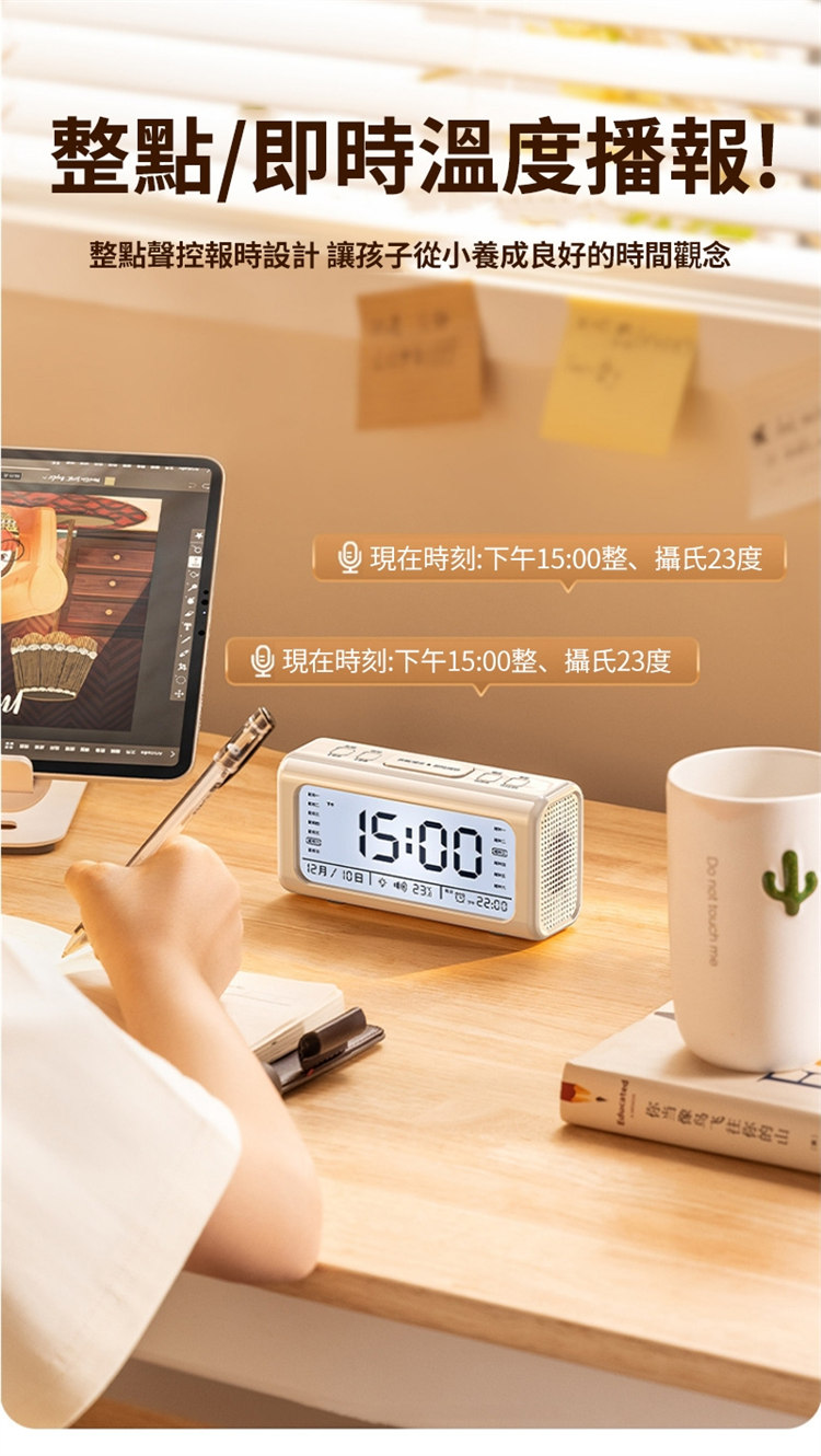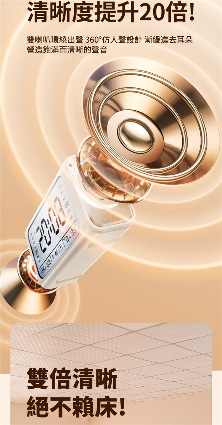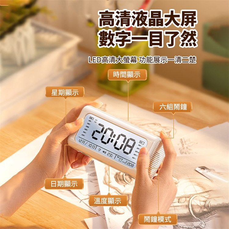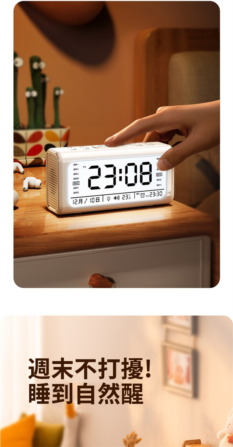 航空級全功能雙核播報電子鬧鐘 | 雙喇叭人聲級播報 | 六組獨立鬧鐘 | 航母級續航 | 日曆星期溫度顯示 | 夜間一鍵亮屏 | 零誤差專業級電子時鐘鬧鐘