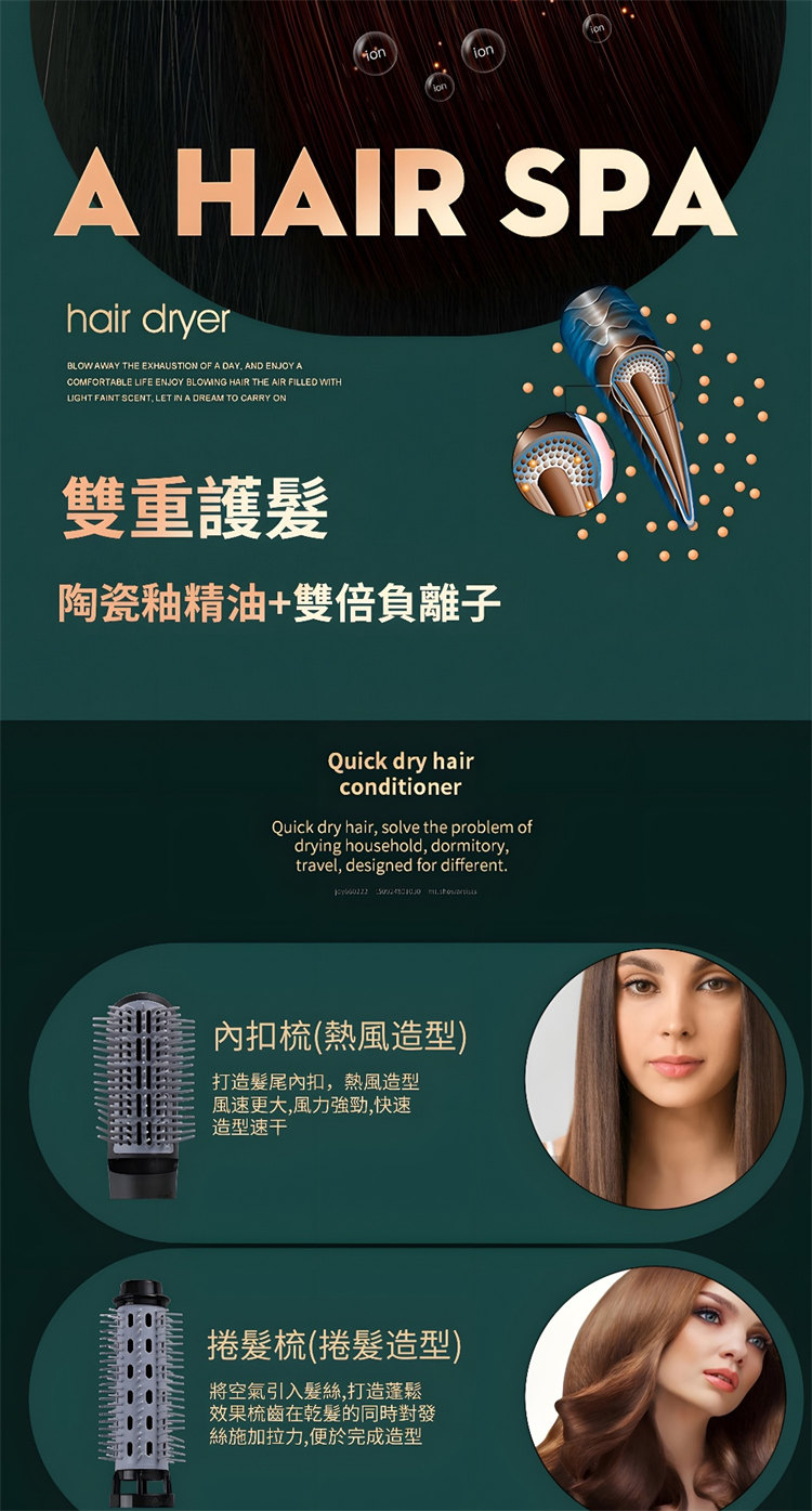 SPA級懶人負離子造型吹風梳 | 直髮捲髮造型三合一 | 雙倍水潤不傷髮 | 吹梳一體恆溫護髮 | 15000大風力速乾 | 三檔調節安全控溫 | 黑科技吹風機