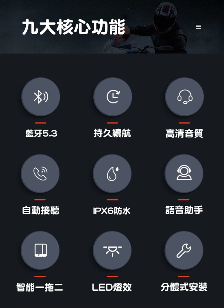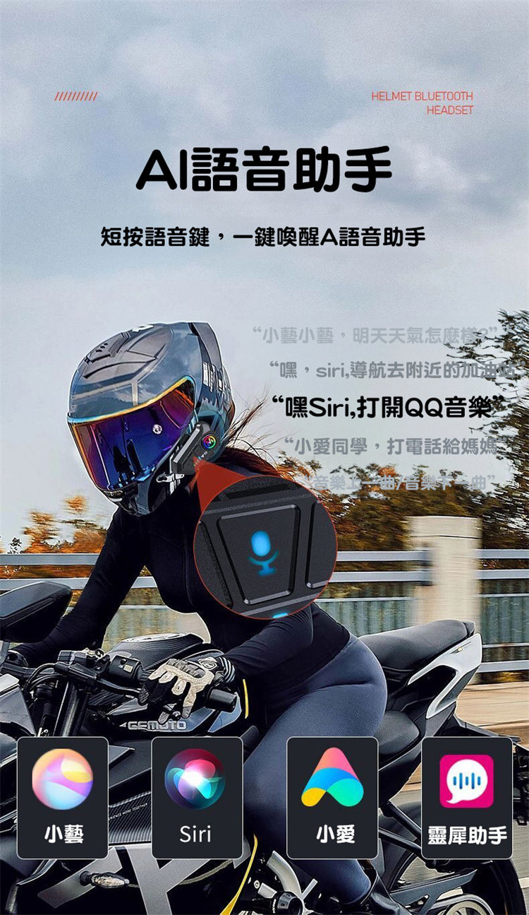 專業級安全帽無線藍牙耳機 | 全新藍牙5.3 | IPX6級防塵防塵 | 超長續航暢聽一整天 | 雙重智慧降噪 | 3D震撼HIFI音質 | AI語音助手 | LED炫彩燈效