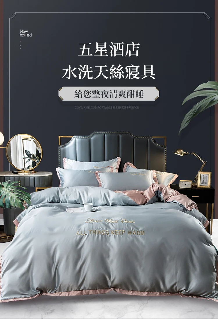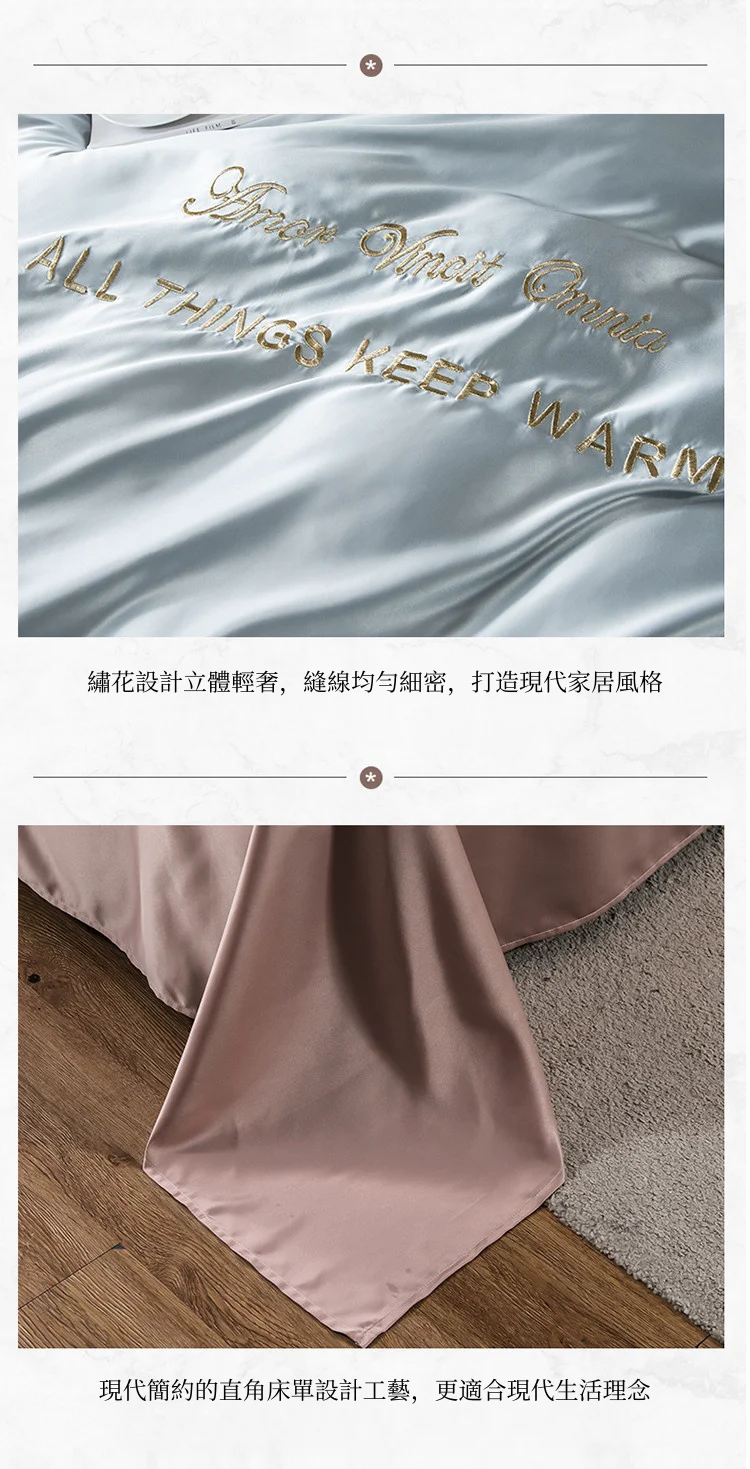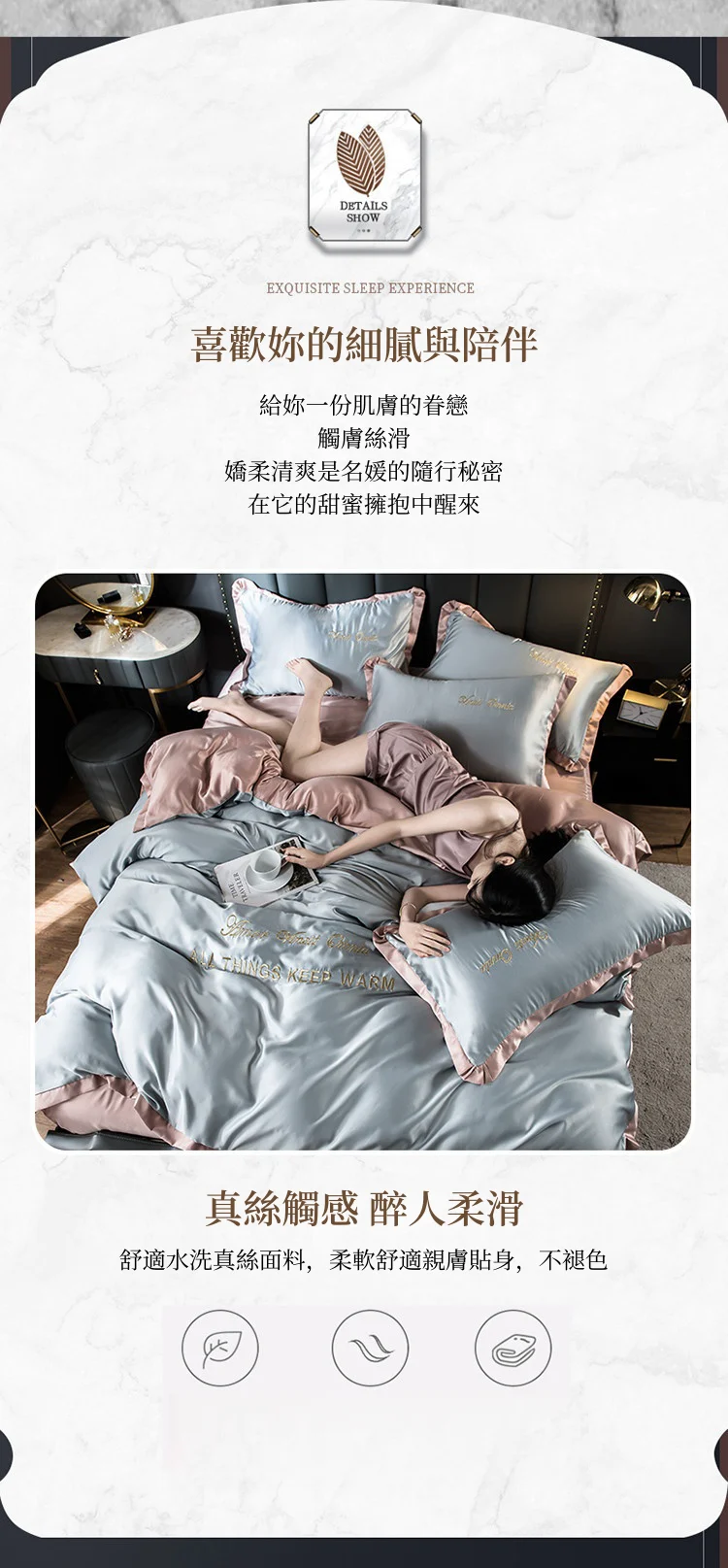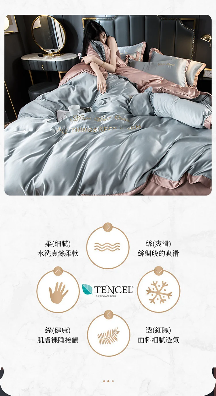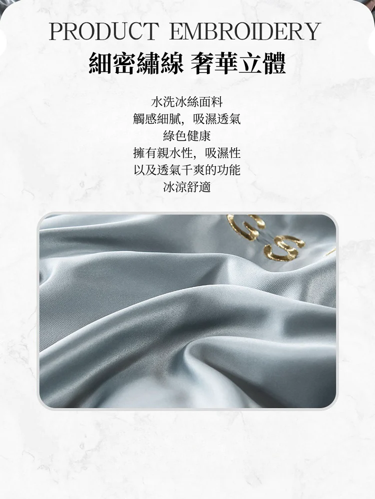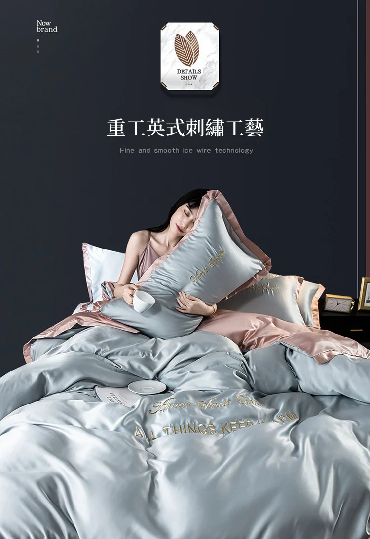 奢級五星酒店水洗天絲四件套組 | 可水洗天絲涼而不冰 | 觸膚絲滑清爽裸感 | 健康活性印染工藝 | 重工英式刺繡 | 冰絲床單床包背包枕套四件組