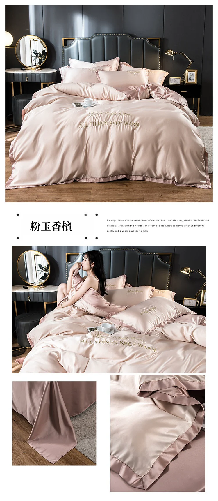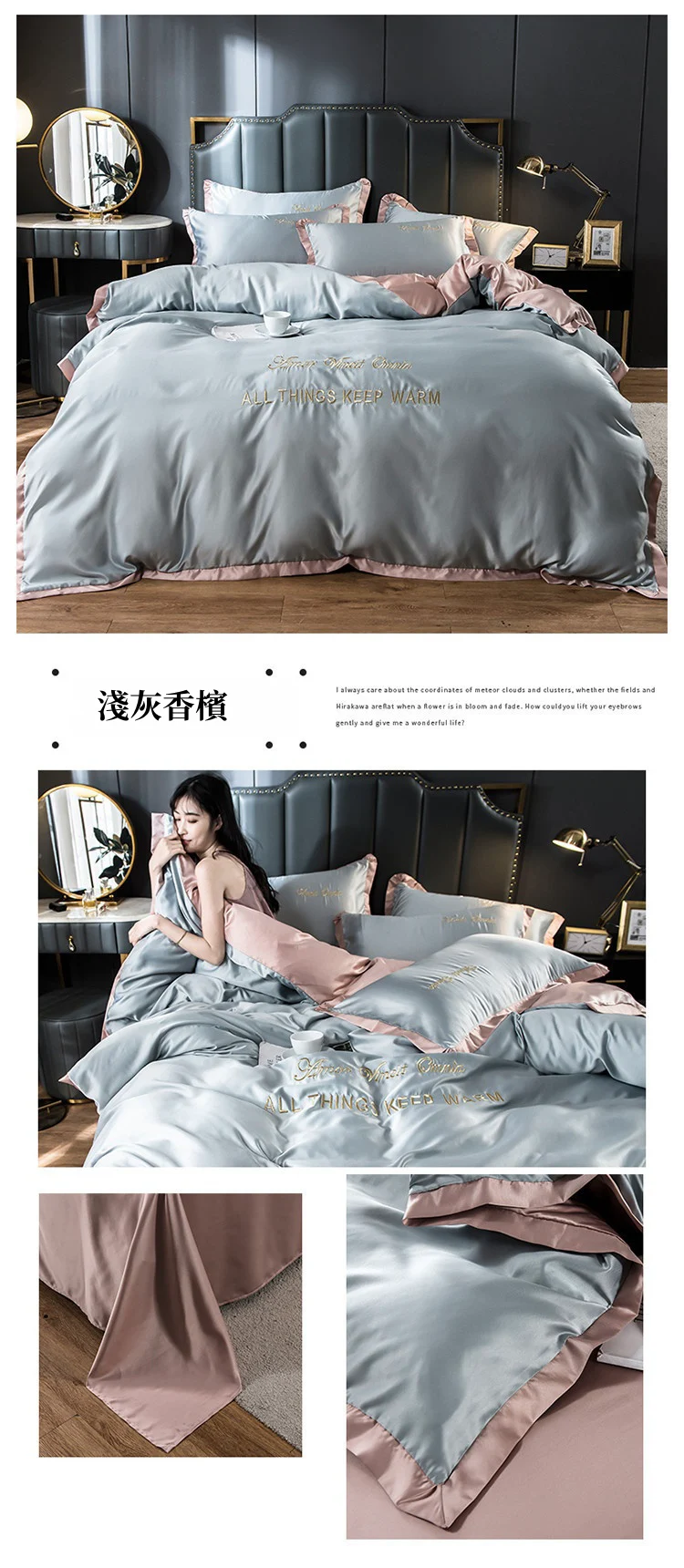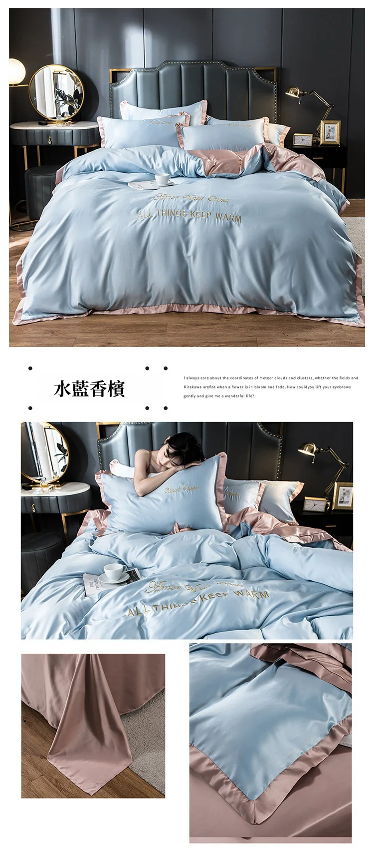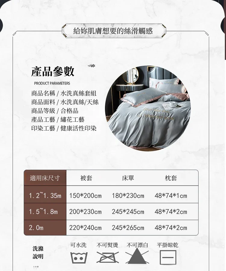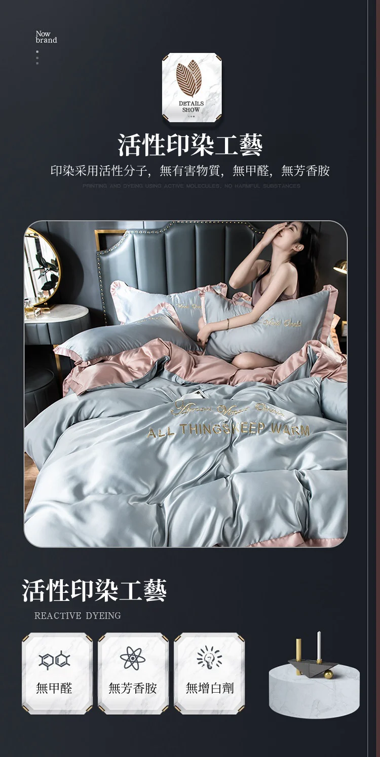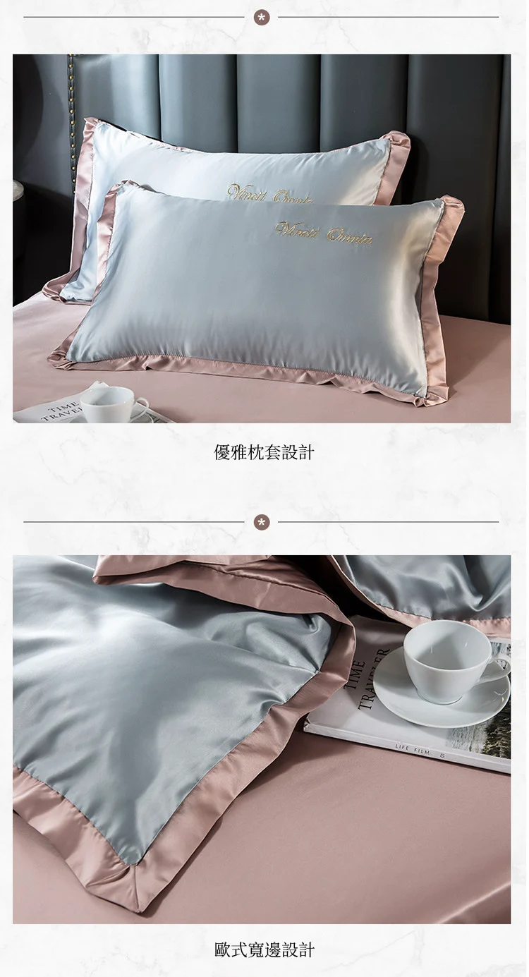 奢級五星酒店水洗天絲四件套組 | 可水洗天絲涼而不冰 | 觸膚絲滑清爽裸感 | 健康活性印染工藝 | 重工英式刺繡 | 冰絲床單床包背包枕套四件組