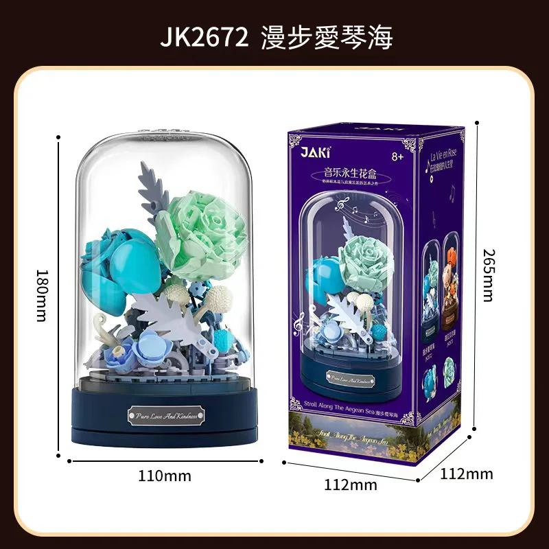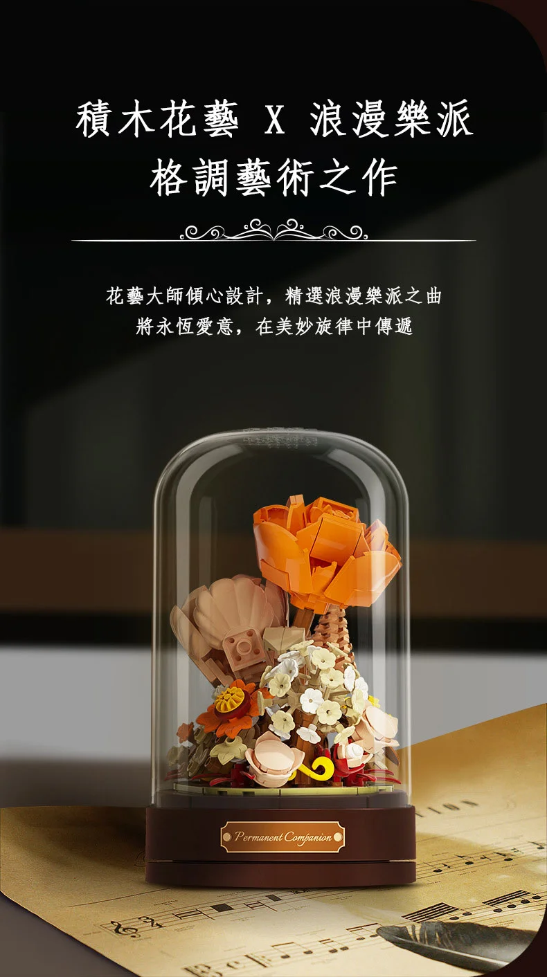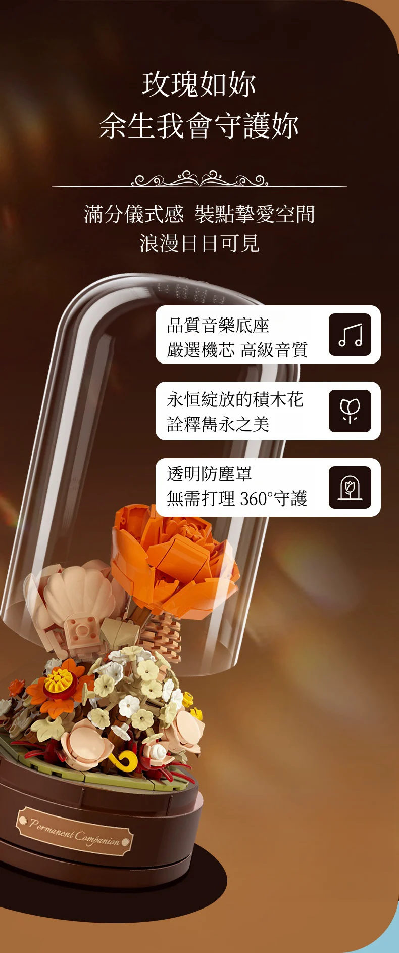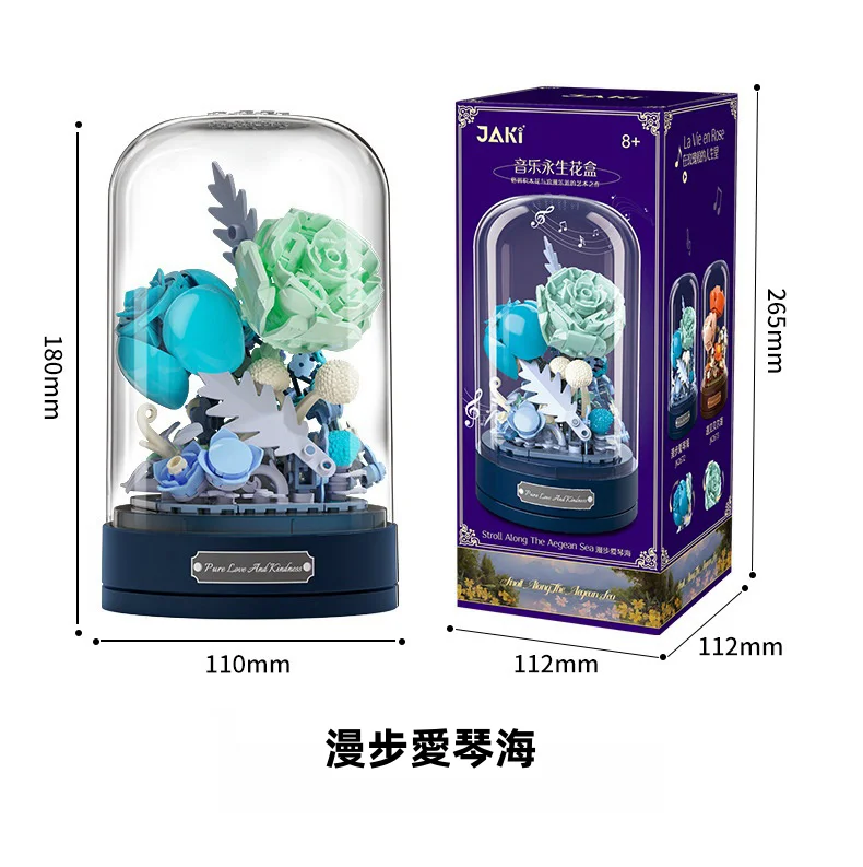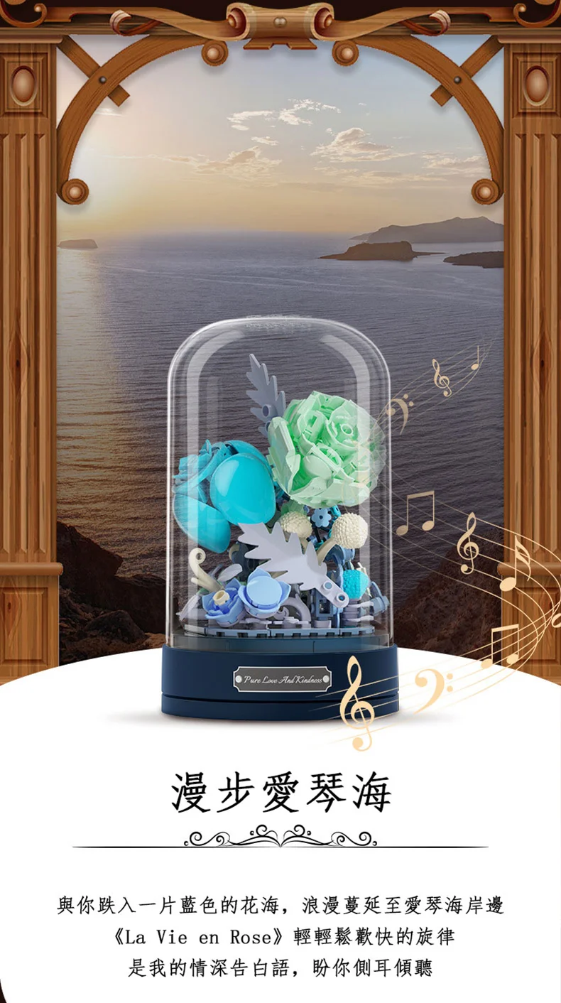 漫步愛琴海 | 永恆積木之花水晶音樂盒 | 花藝大師浪漫花語 | 品質機芯高級音質 | 360高透防塵罩 | 收到超感動浪漫永生積木玫瑰水晶罩音樂盒