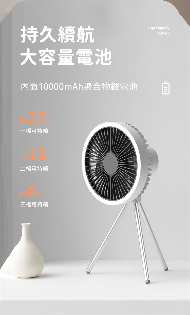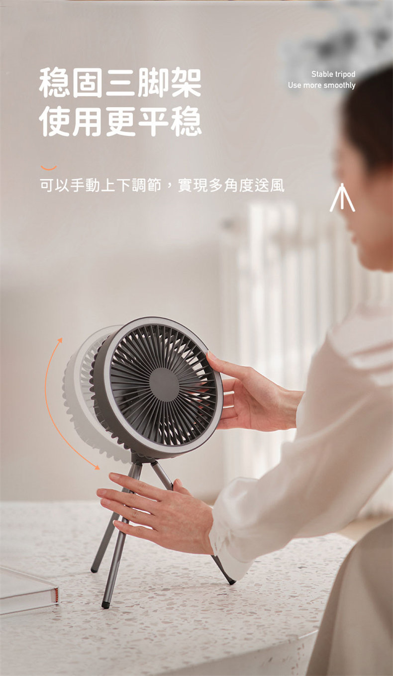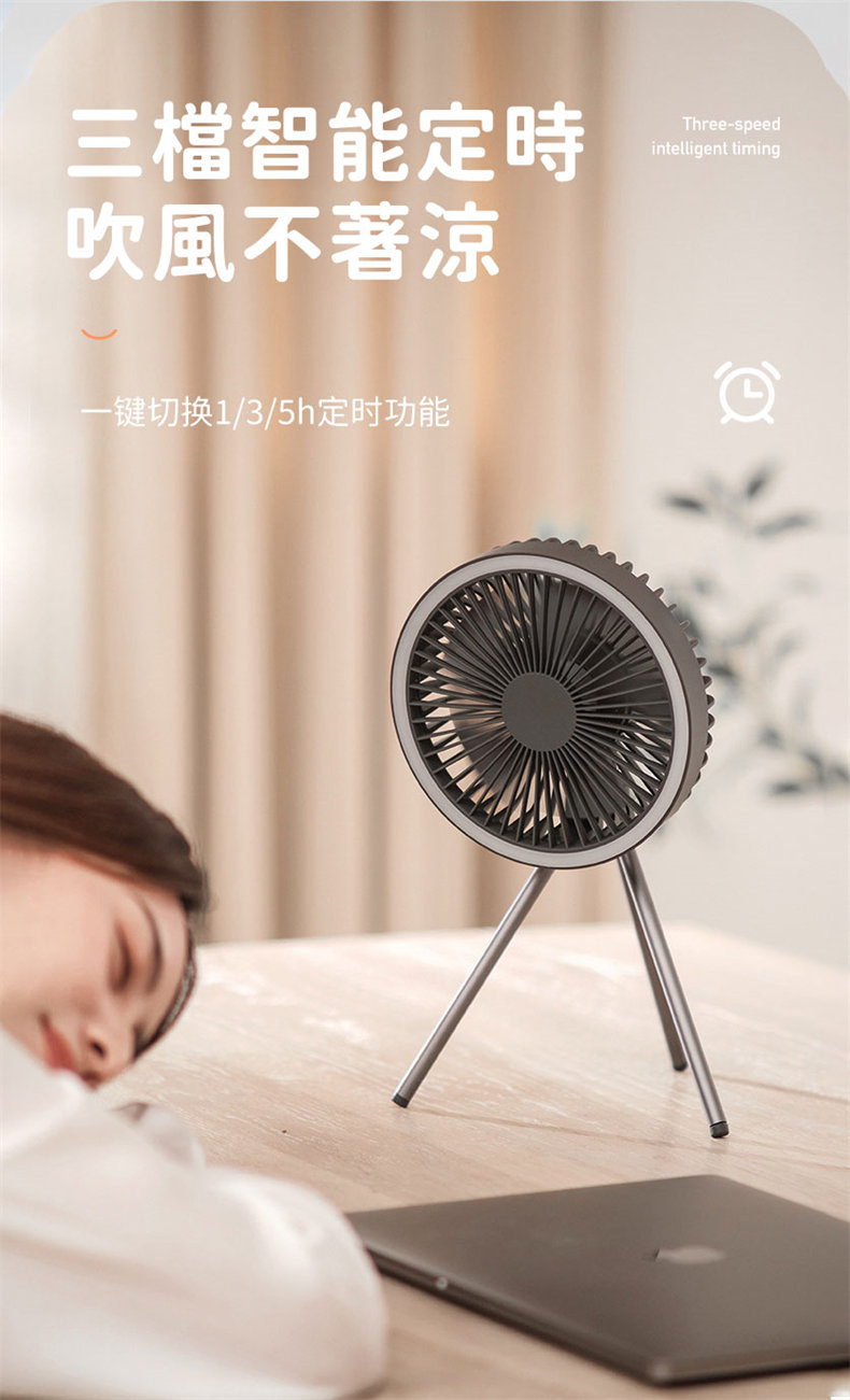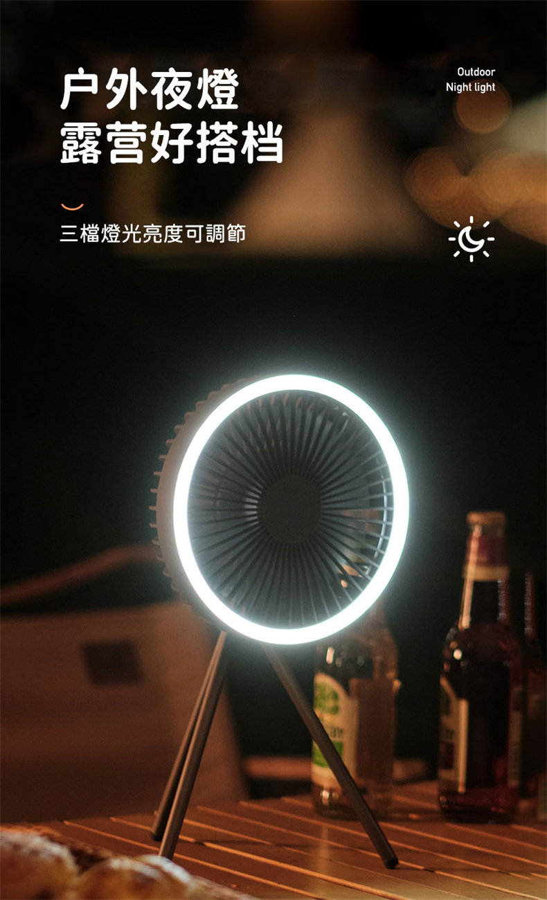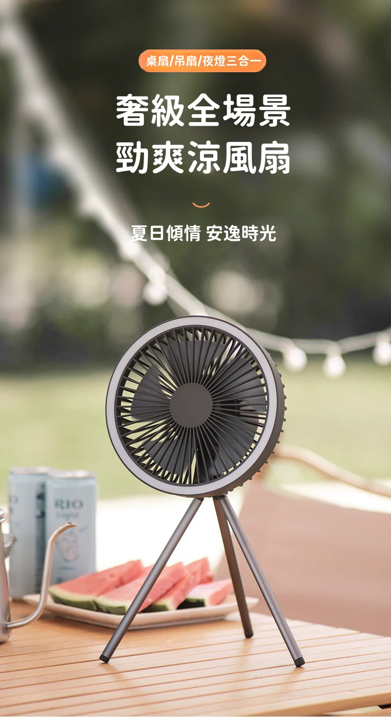 奢級勁涼全場景無線露營風扇 | 航母級27H續航 | 桌扇吊扇夜燈三合一 | 三檔亮度環形夜燈 | 穩固三角架支撐 | 三檔定時功能 | 超靜音不打擾