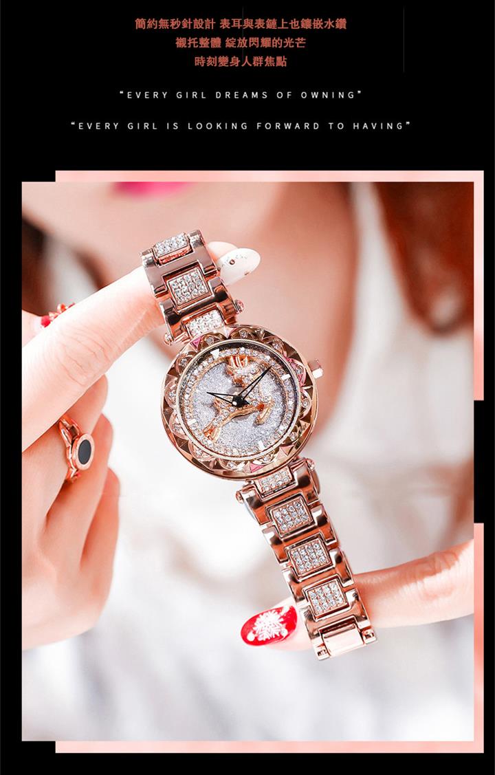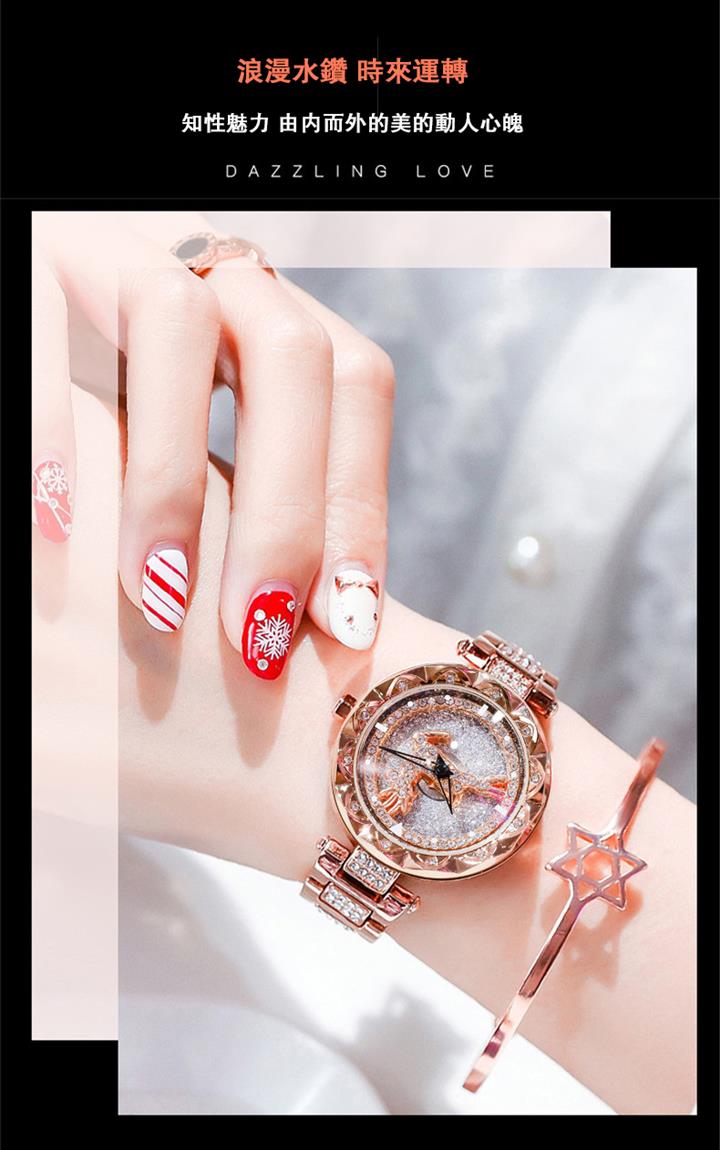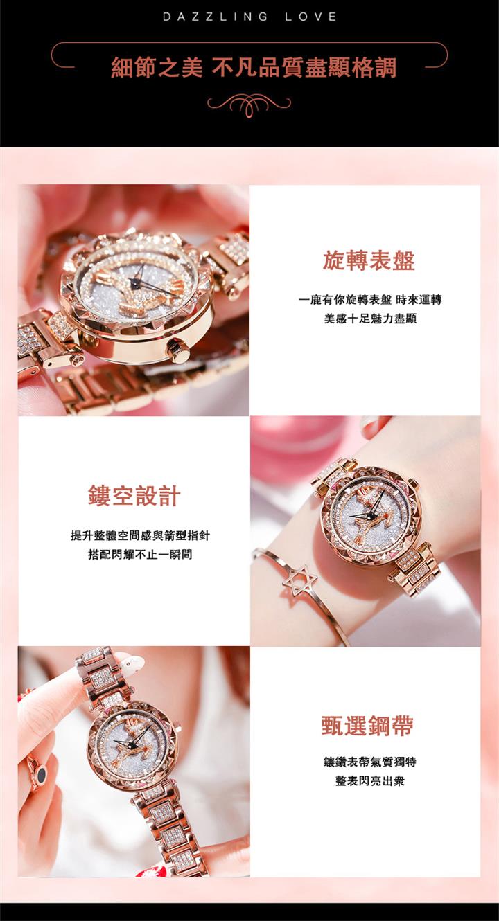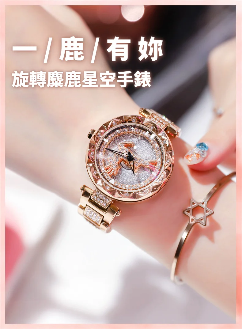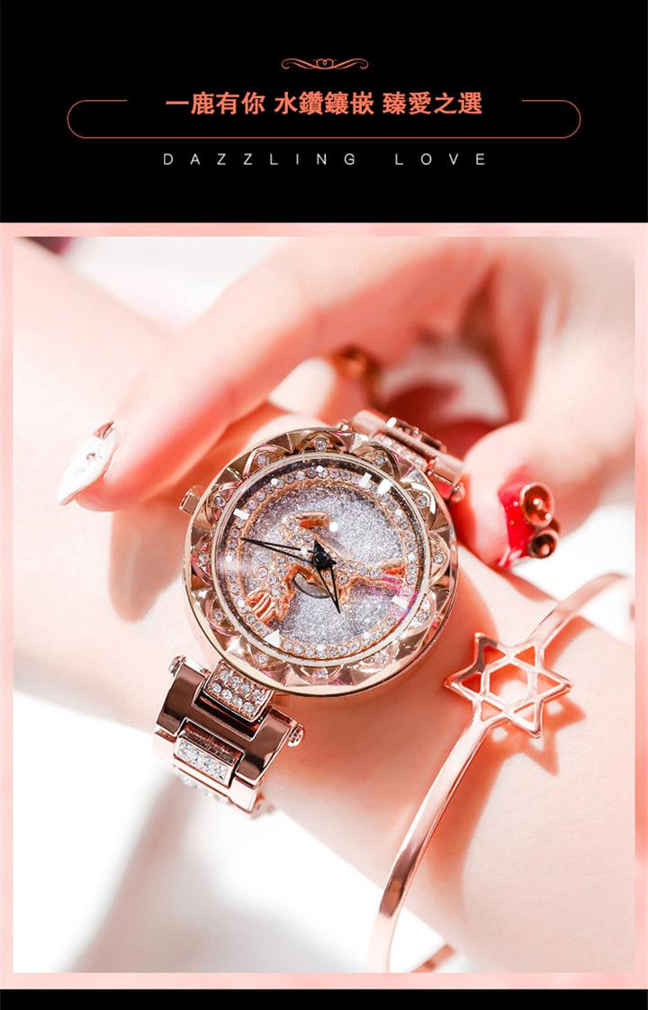 一鹿有妳炫目滿鑽星空手錶 | 旋轉麋鹿開運錶盤 | 鍍膜耐磨水晶表鏡 | 實心鑲鑽合金錶帶 | 時來運轉浪漫麋鹿鑲鑽超美女士石英手錶