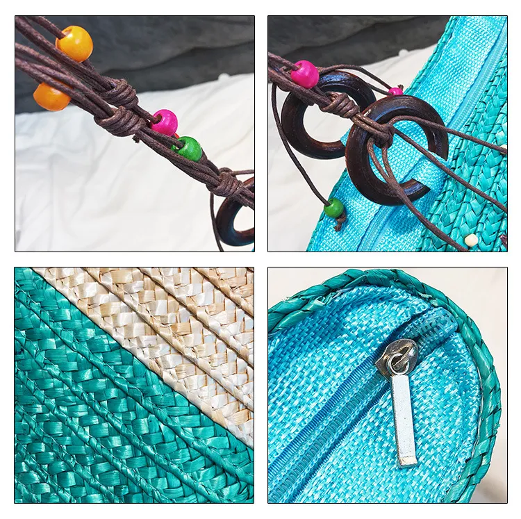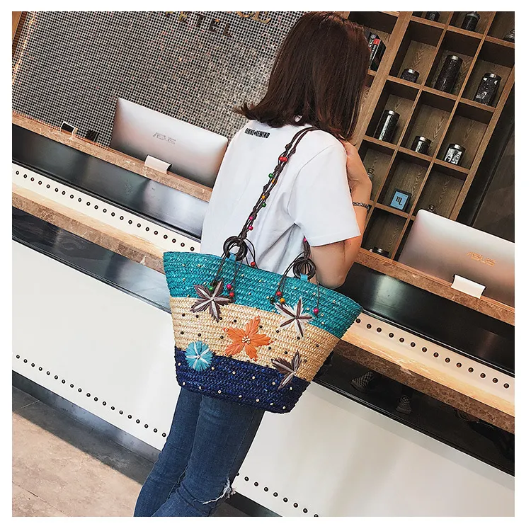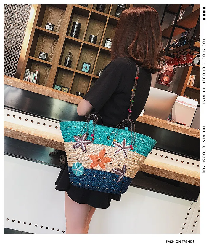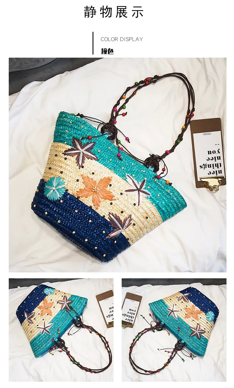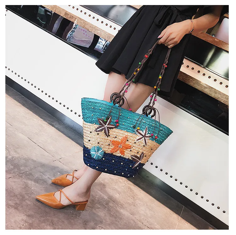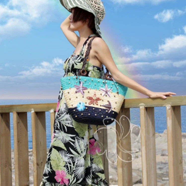 夏日海灘波西米亞草編肩背托特包 | 純手工編織工藝 | 可愛海洋感配飾 | 大容量拉鍊內袋 | 純情美式西海岸度假風女士草編托特包側背斜背包