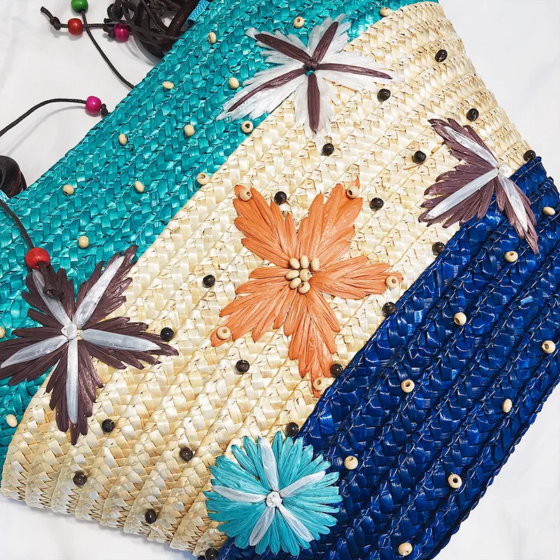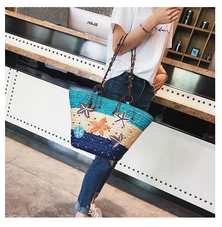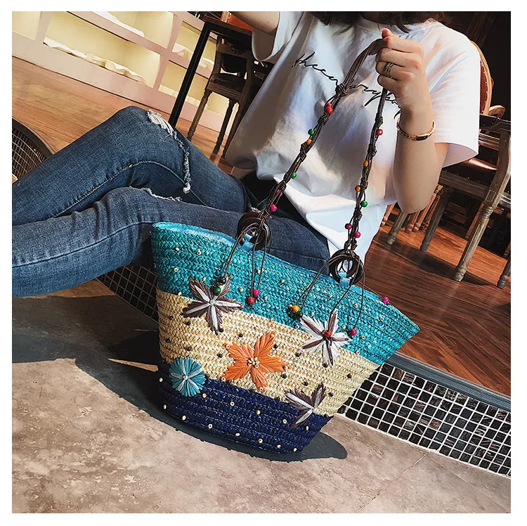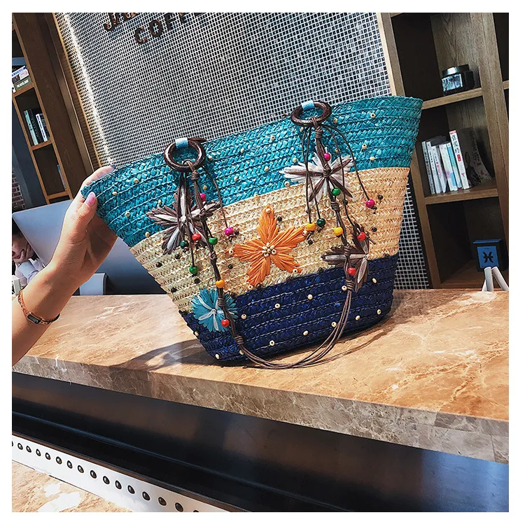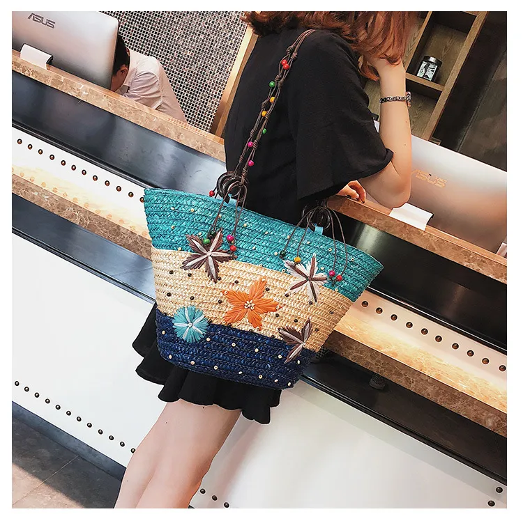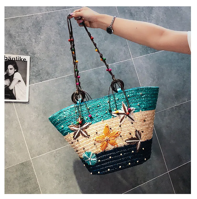 夏日海灘波西米亞草編肩背托特包 | 純手工編織工藝 | 可愛海洋感配飾 | 大容量拉鍊內袋 | 純情美式西海岸度假風女士草編托特包側背斜背包