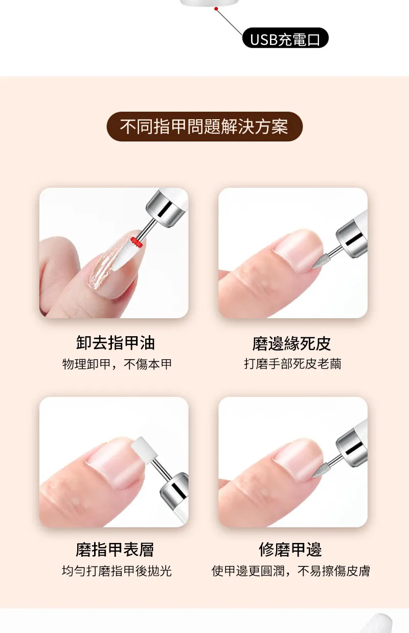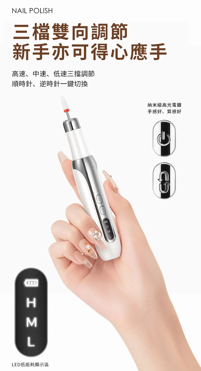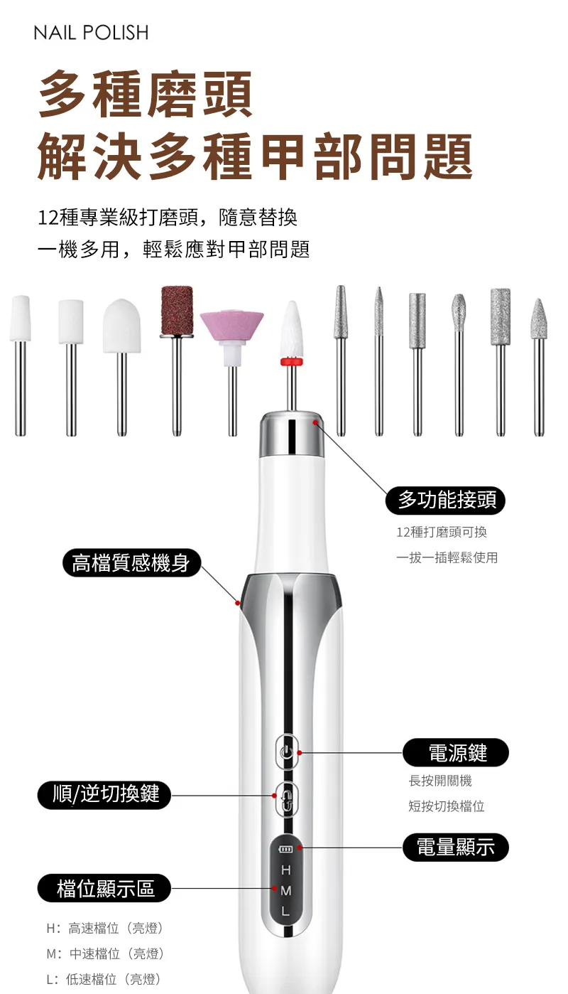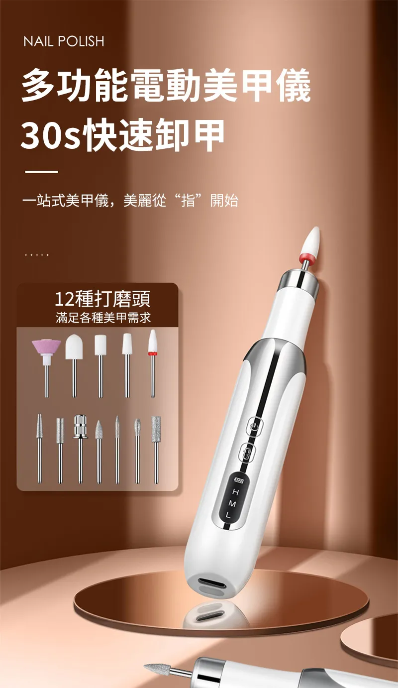 美學沙龍級全功能電動美甲機 | 30秒打造光感美甲 | 卸磨拋修去死皮全功能 | 三檔雙向強勁低音馬達 | 雙模快充超長續航 | 附送12種打磨頭修甲儀