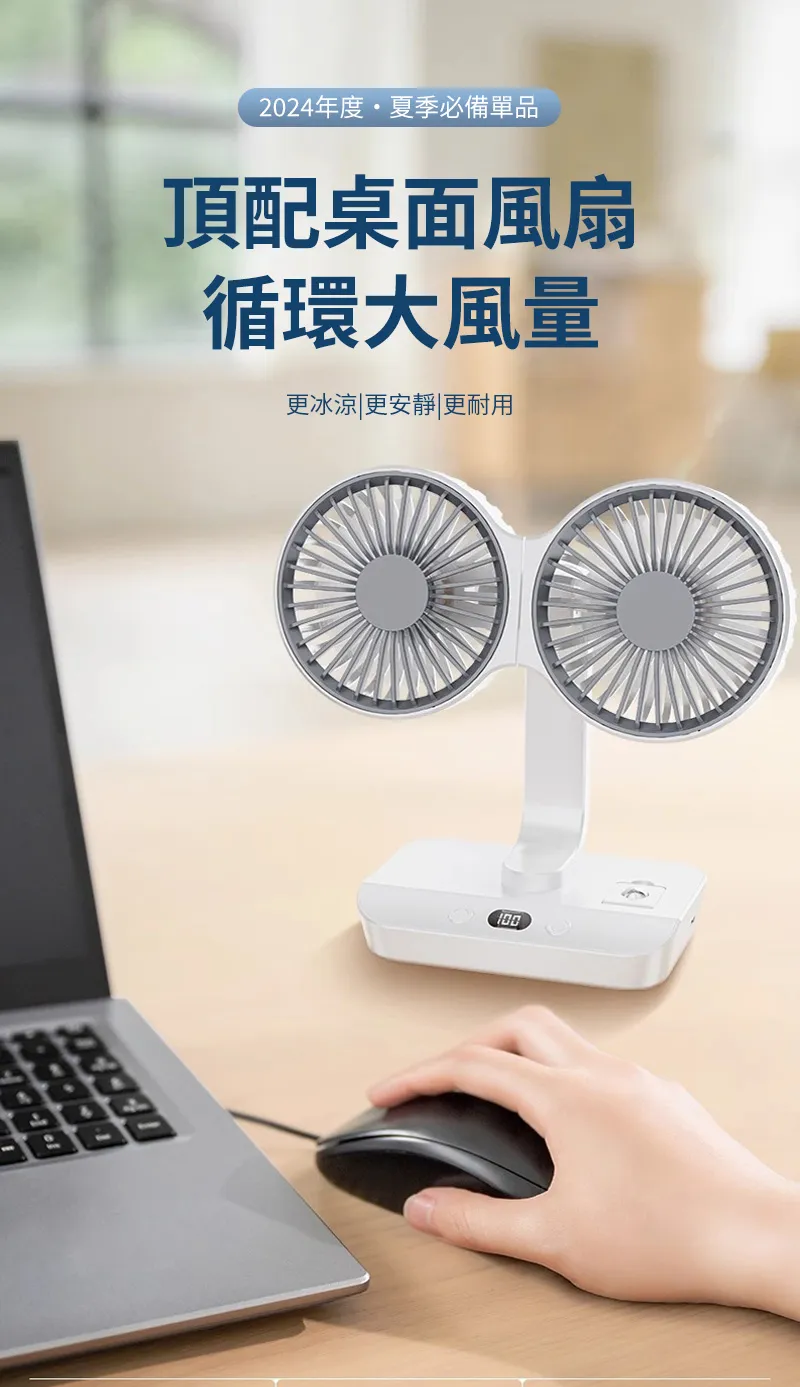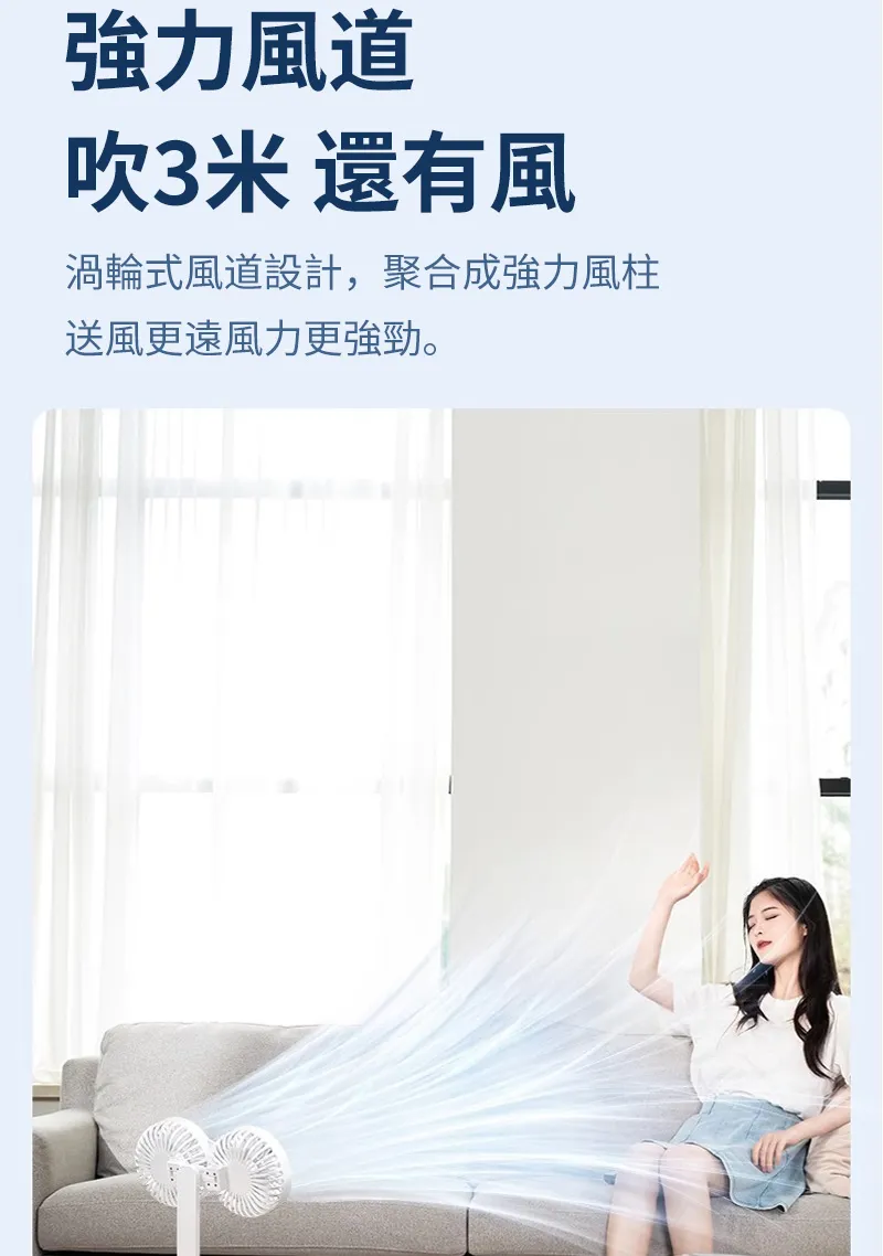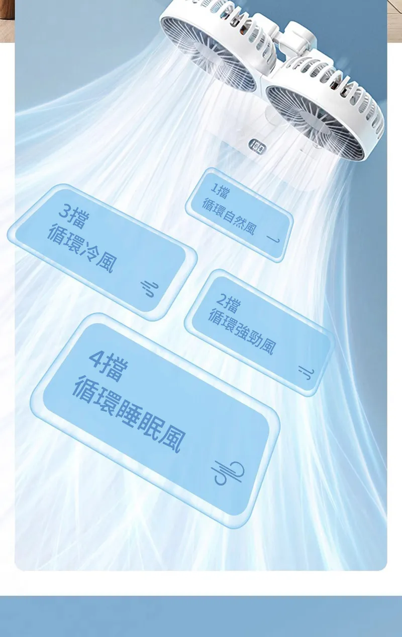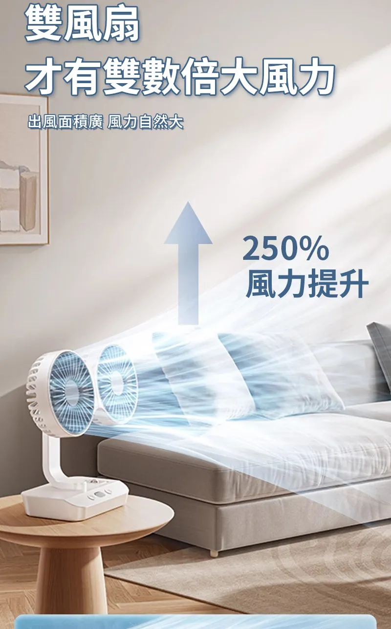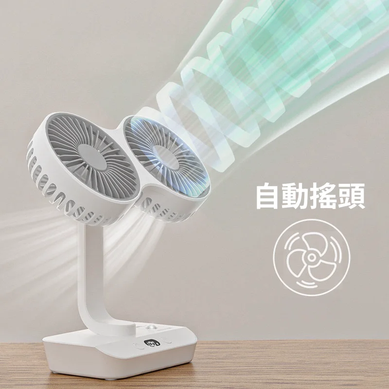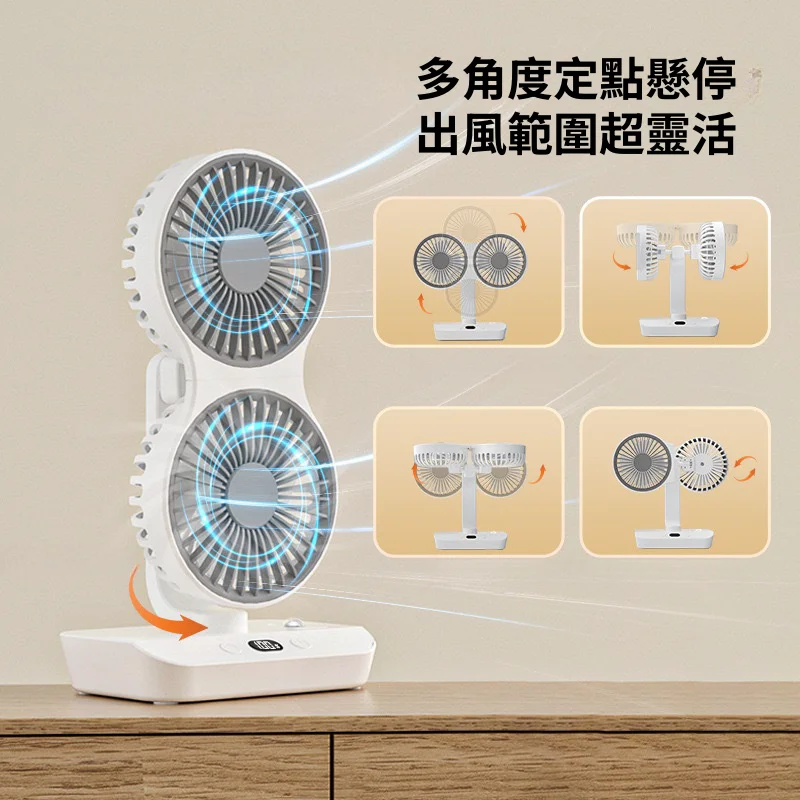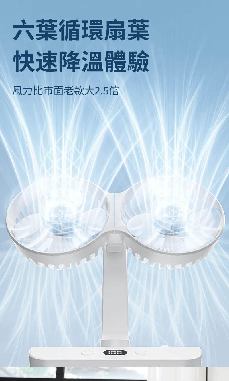 頂配旗艦颶風級雙頭風扇 | 多角度定點懸停 | 雙馬達3米大風 | 六葉渦輪扇葉 | 四檔風速可調 | 舒爽自動搖頭 | 無線超長續航 | USB桌掛兩用風扇