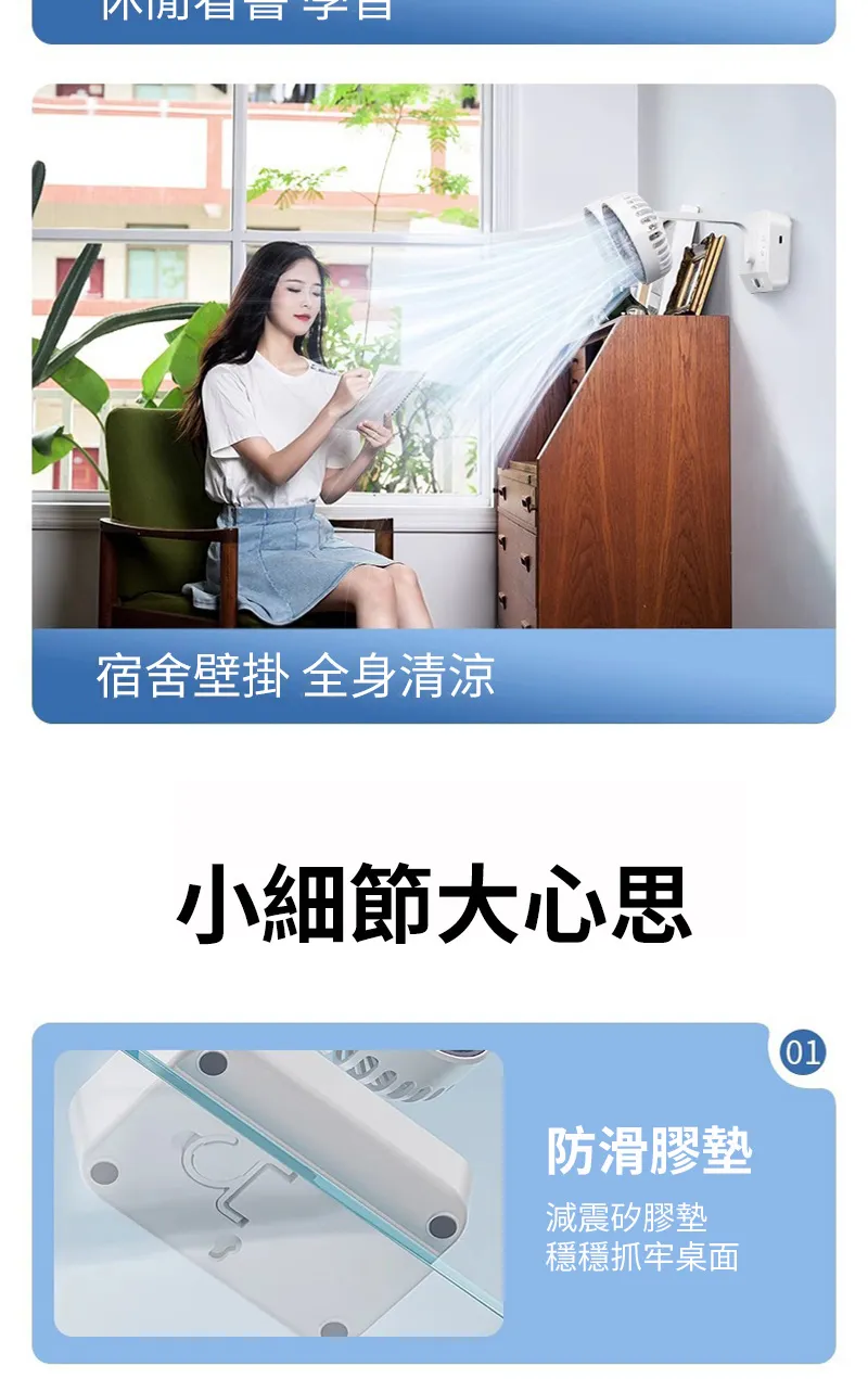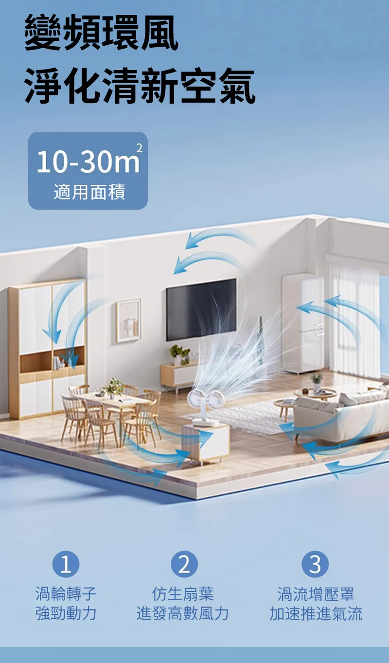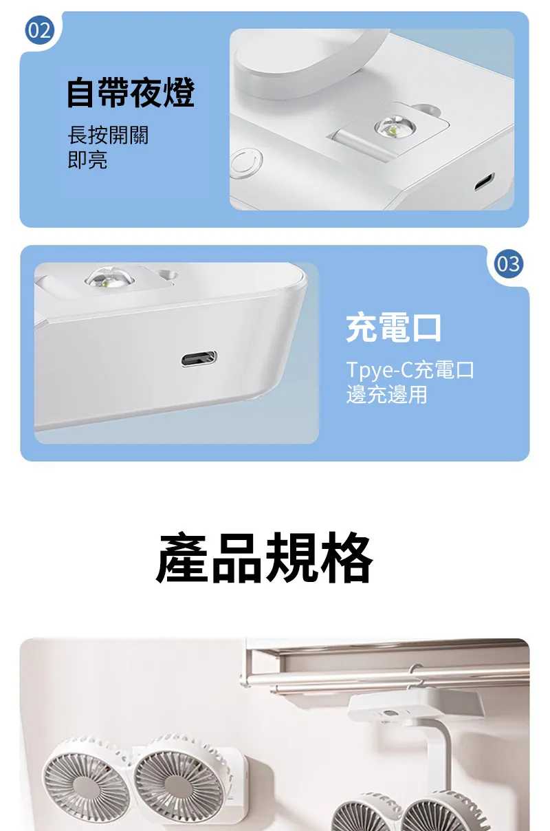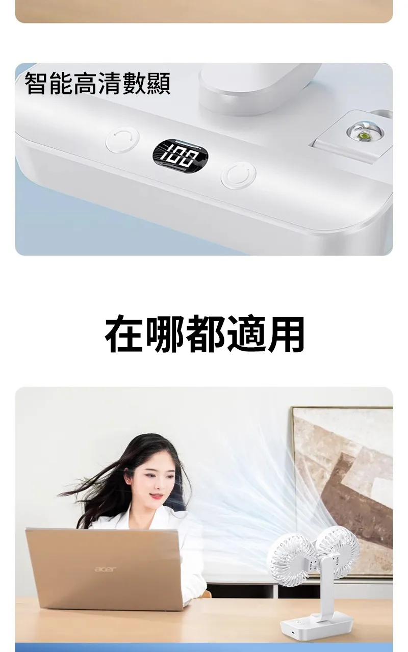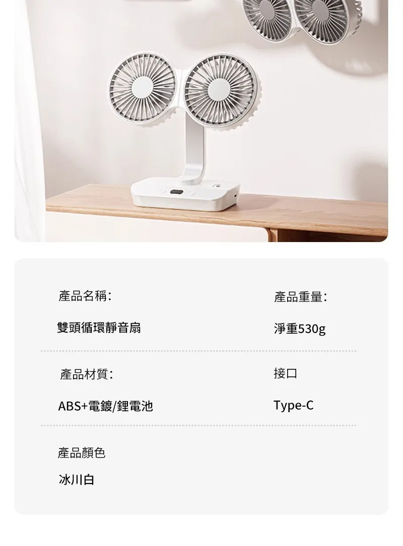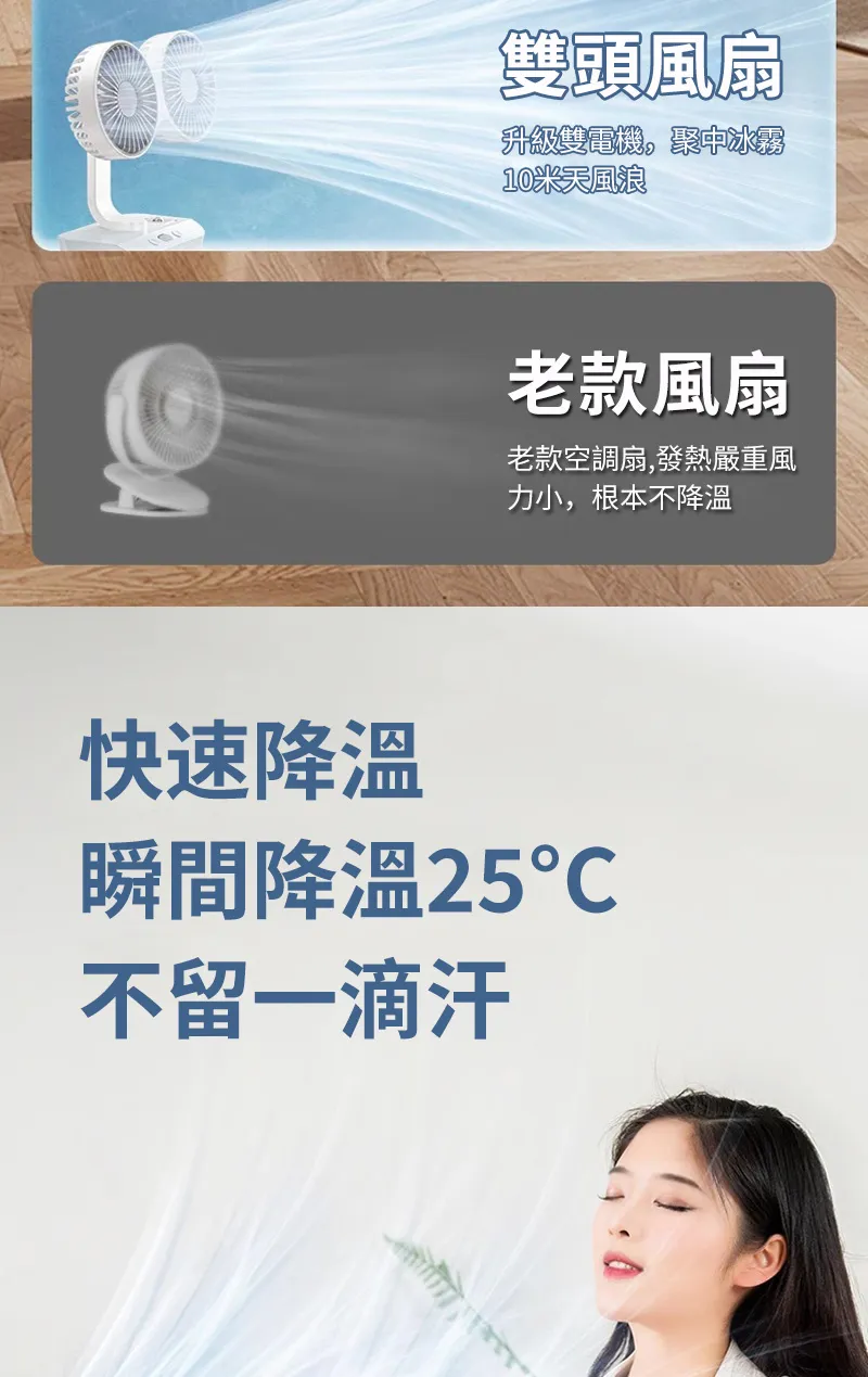頂配旗艦颶風級雙頭風扇 | 多角度定點懸停 | 雙馬達3米大風 | 六葉渦輪扇葉 | 四檔風速可調 | 舒爽自動搖頭 | 無線超長續航 | USB桌掛兩用風扇