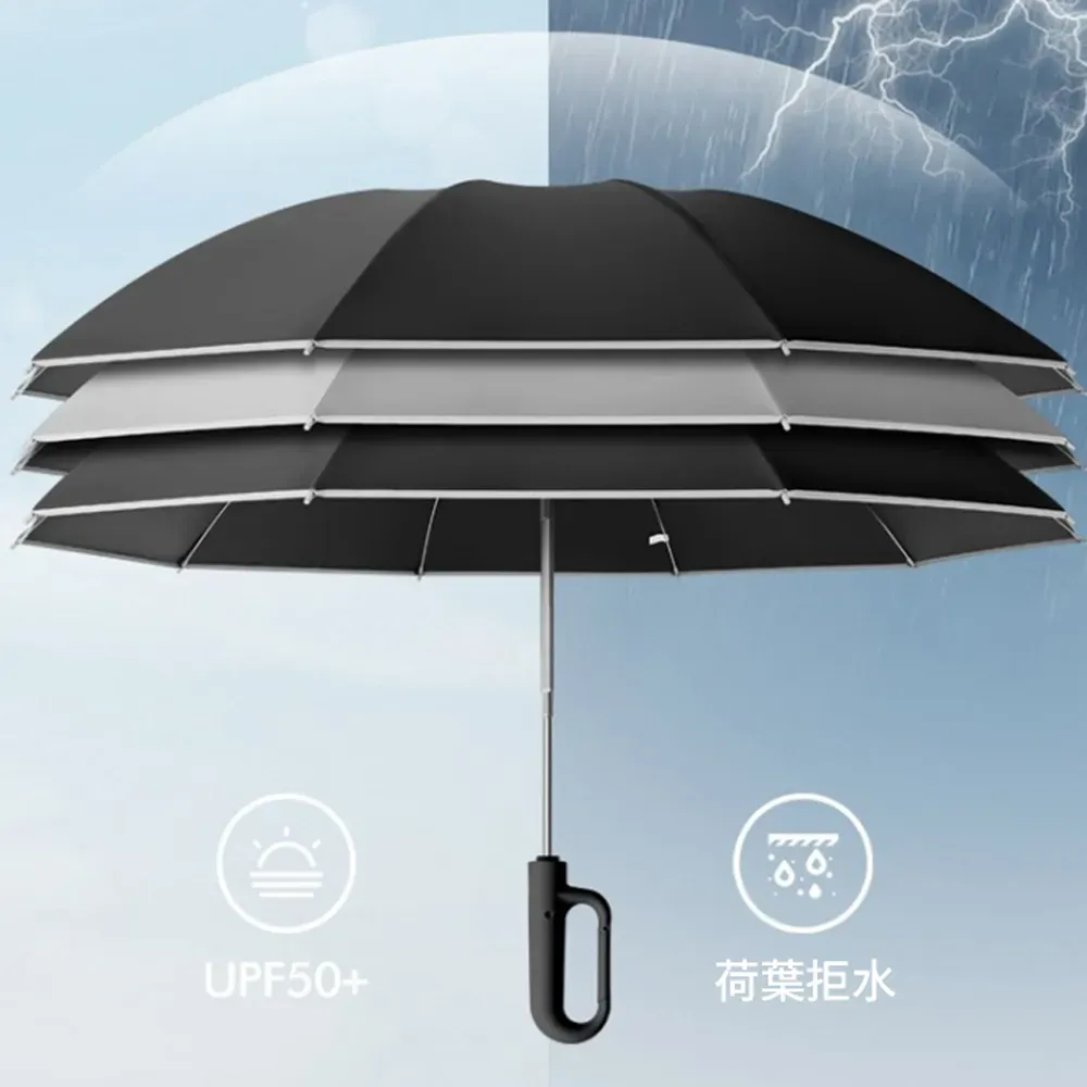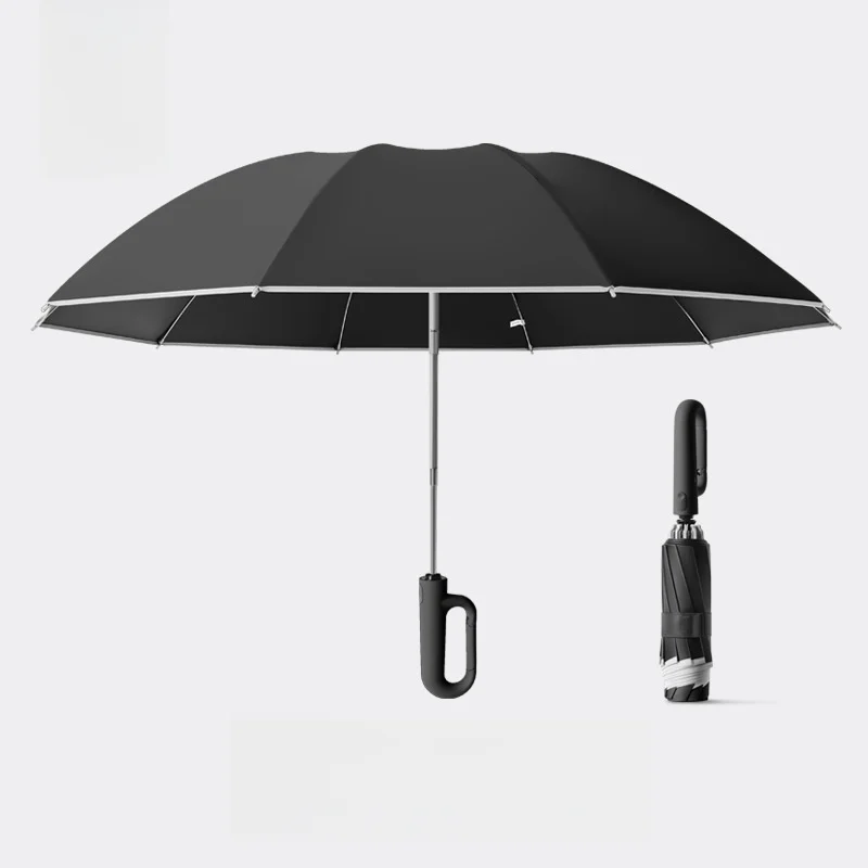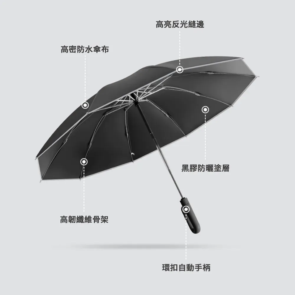 奢級UPF50+全功能黑膠折疊自動反向傘 | 高密黑膠晴雨兩用 | 颶風級十骨高韌纖維骨架 | 環扣自動手柄 | 反向收傘不濕身 | 反光天使安全環