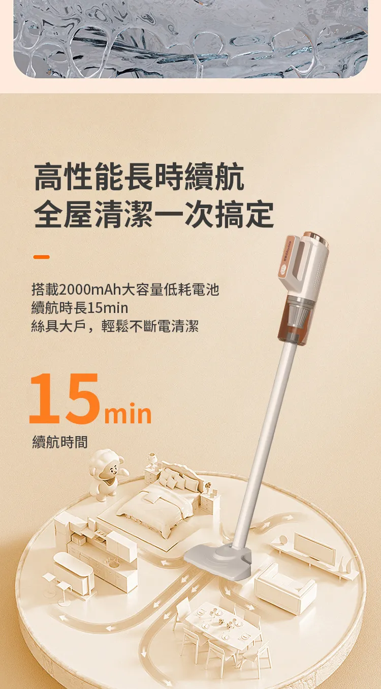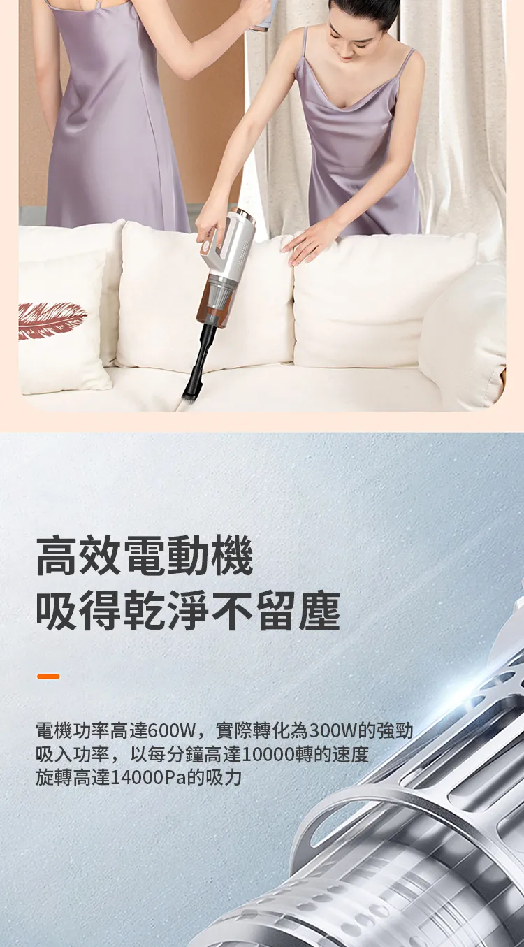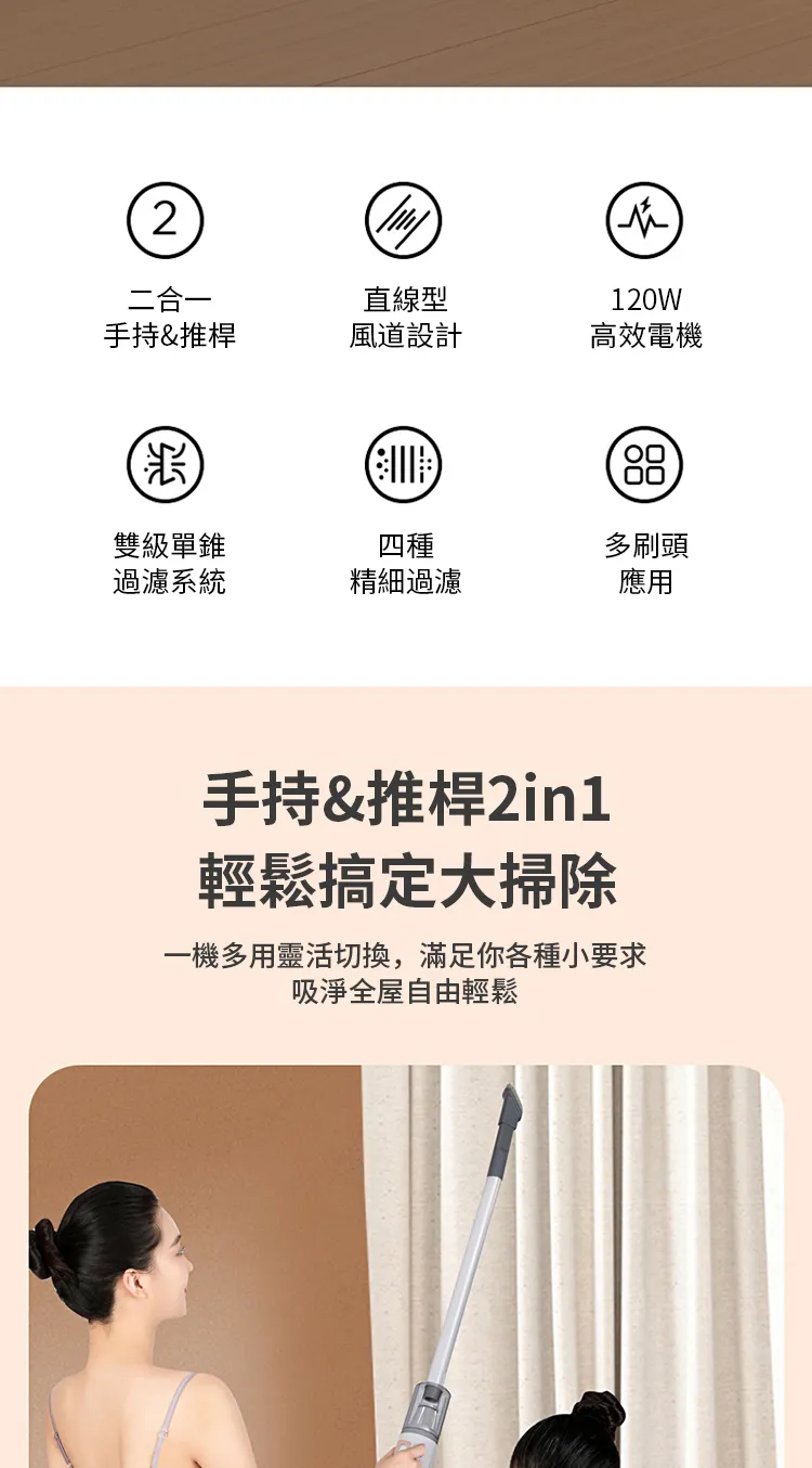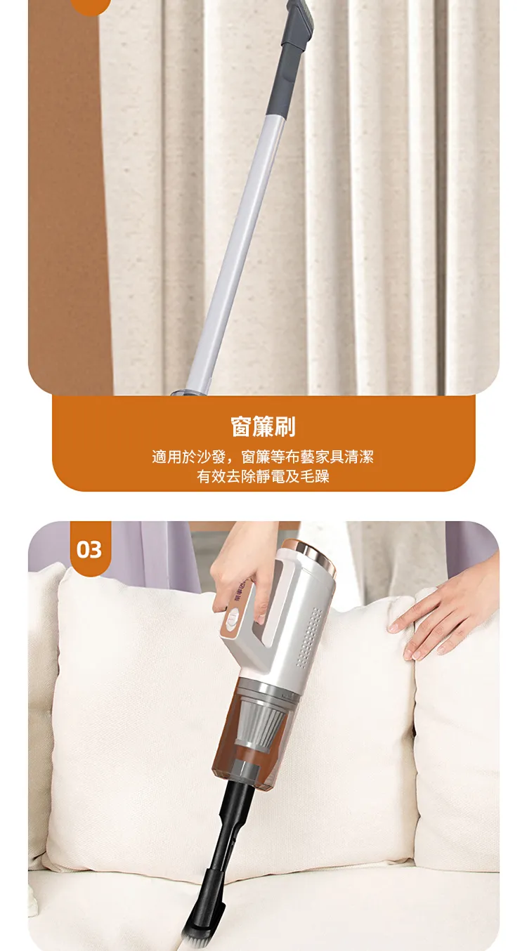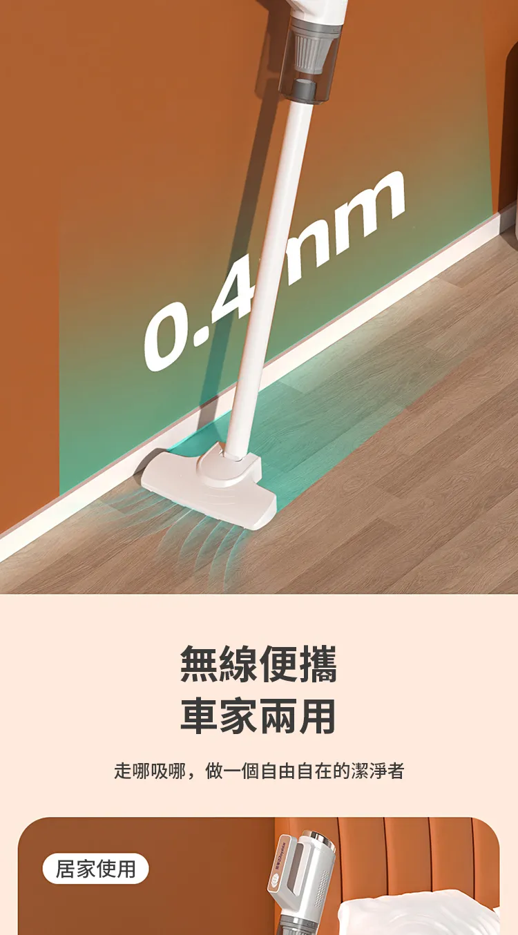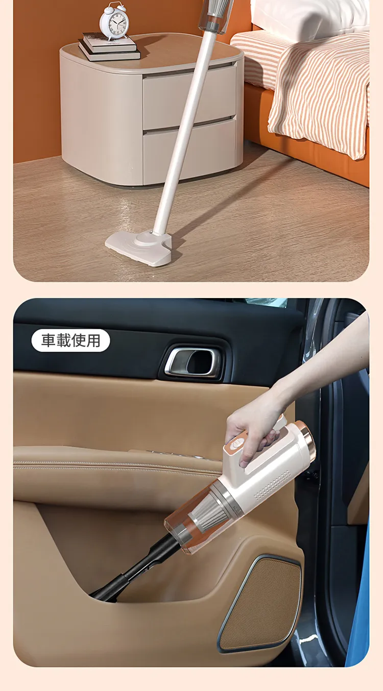 家政公司級全屋除塵無線吸塵器 | 手持推桿雙模式 | 直線風道颶風吸力 | 雙極單錐四重HEPA過濾 | 地刷窗簾刷扁刷三刷頭 | 居家車載兩用吸塵器