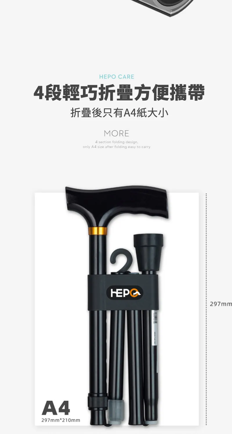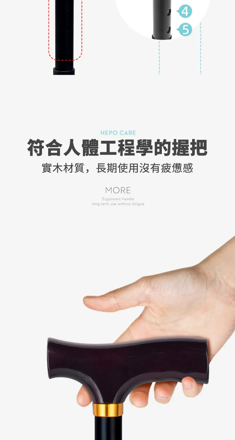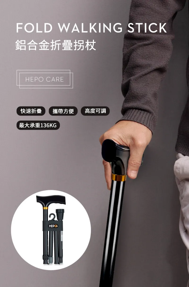 專業級HEPO高強鋁合金折疊拐杖 | 136KG超強承重 | 5檔高度可調 | 4段折疊好收納 | 專業逆並繼插接 | 人體工學實木握把 | TPR防滑耐磨腳墊 | 老人拐杖助力杖