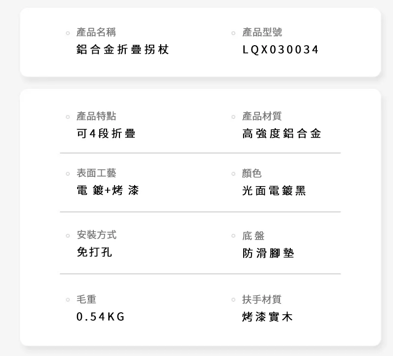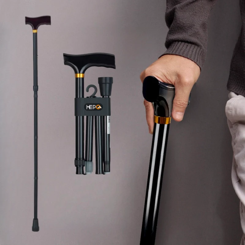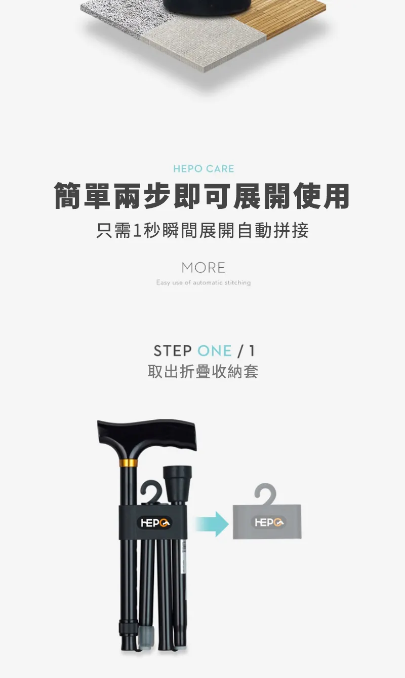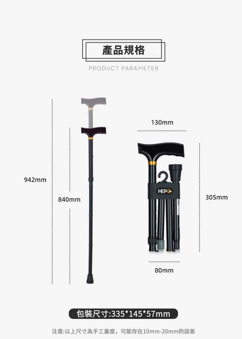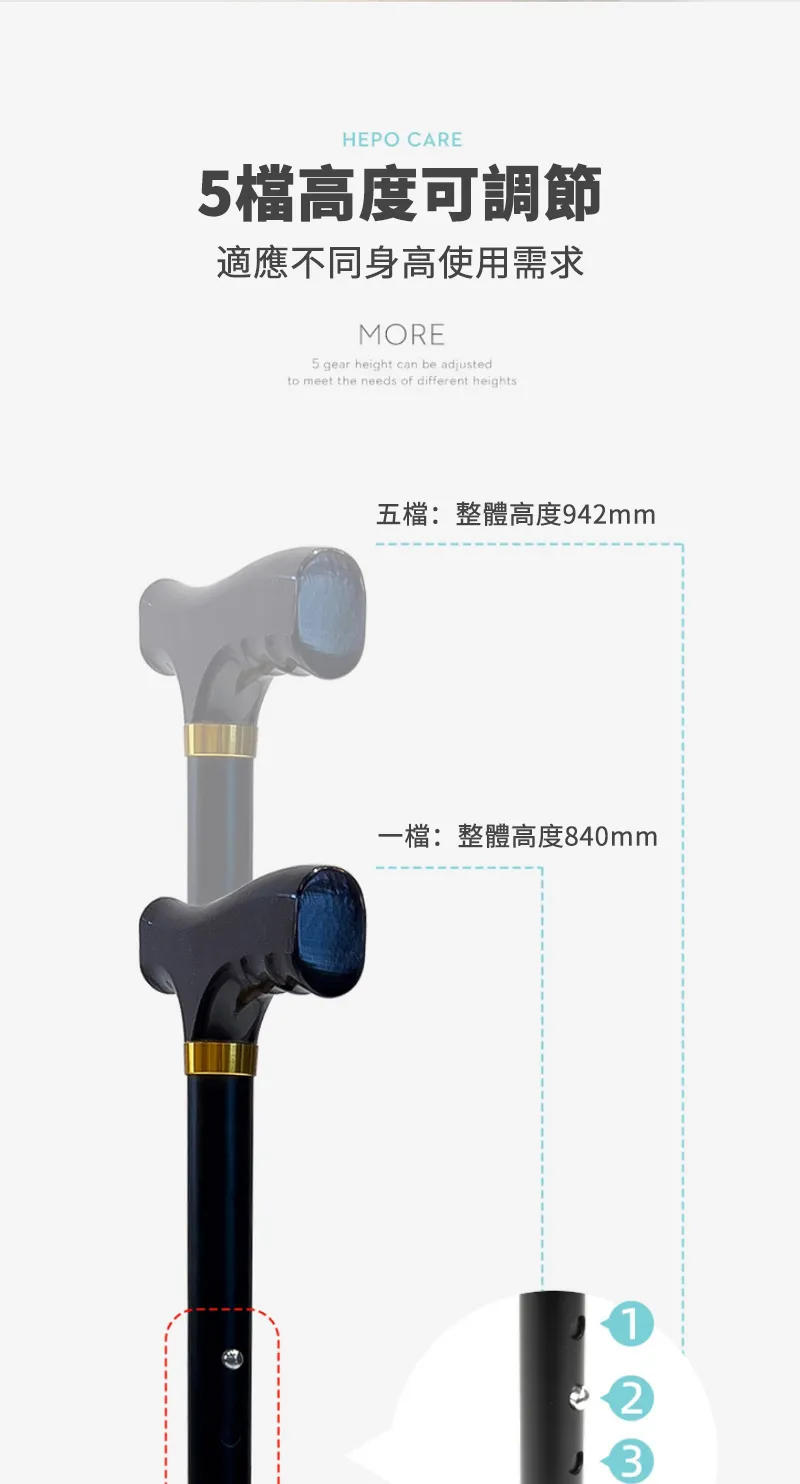 專業級HEPO高強鋁合金折疊拐杖 | 136KG超強承重 | 5檔高度可調 | 4段折疊好收納 | 專業逆並繼插接 | 人體工學實木握把 | TPR防滑耐磨腳墊 | 老人拐杖助力杖