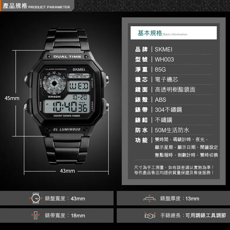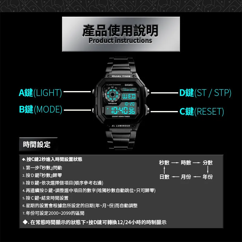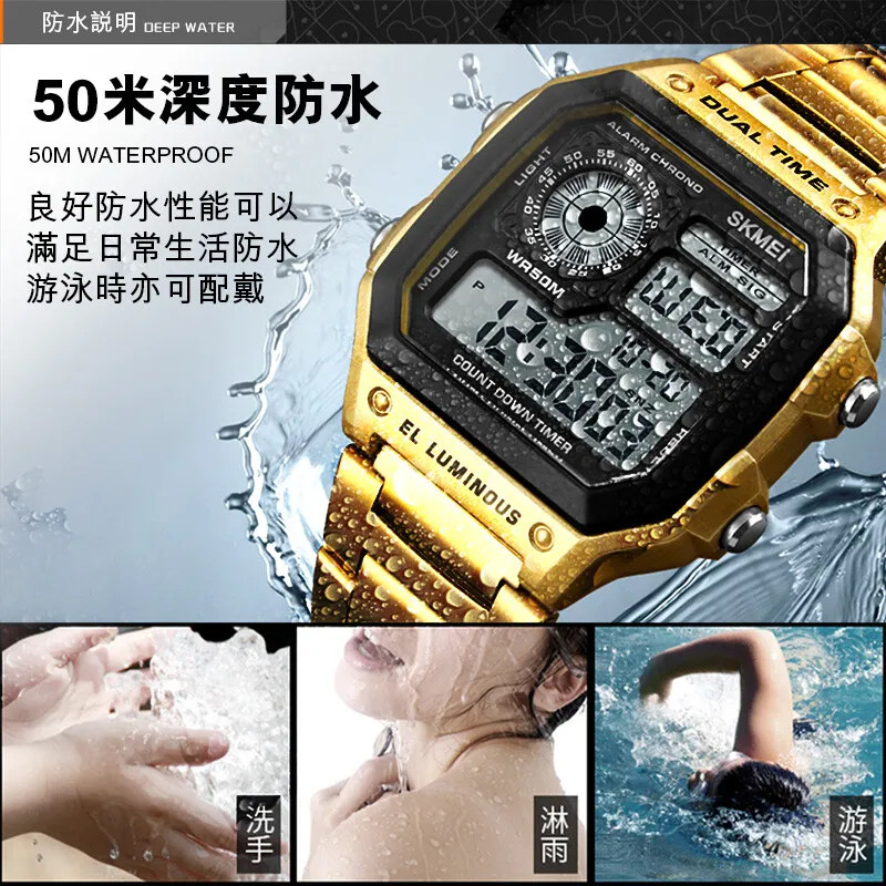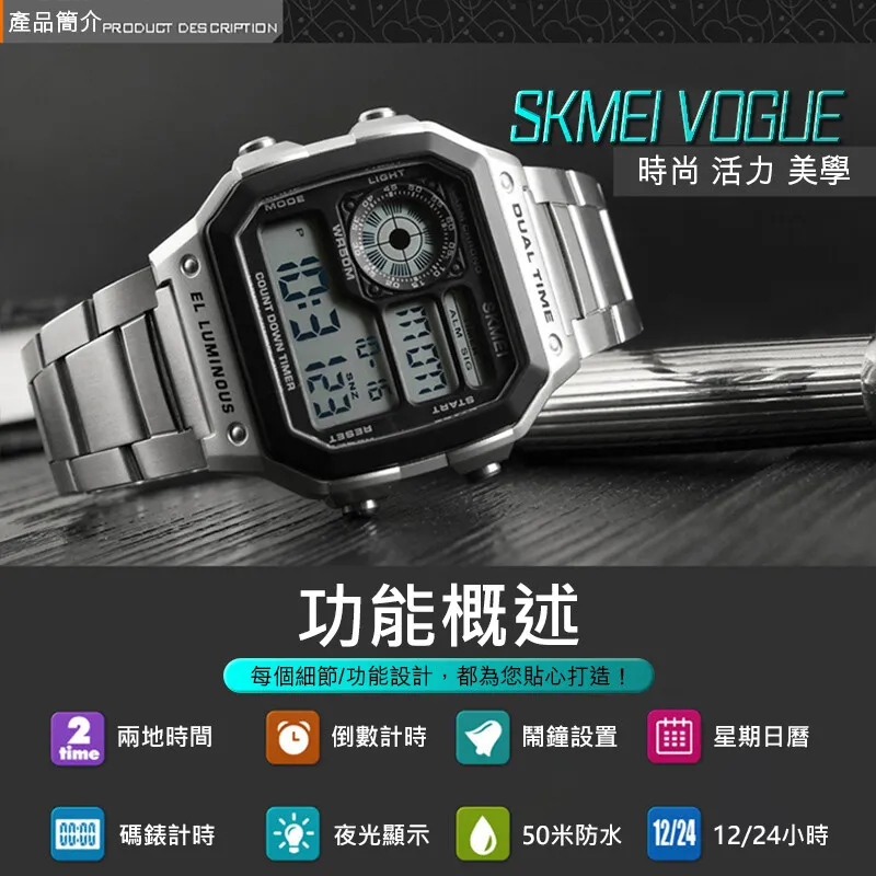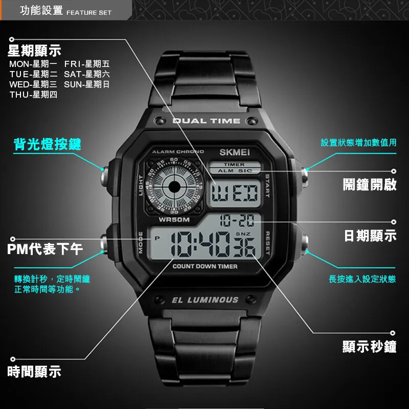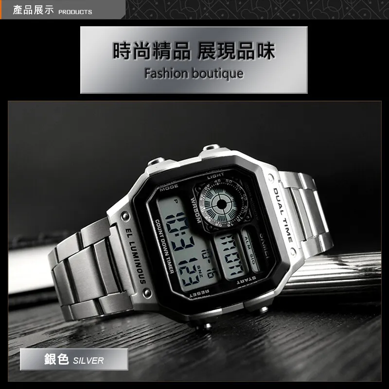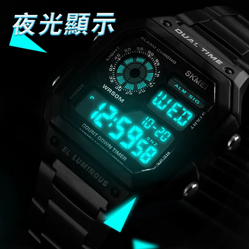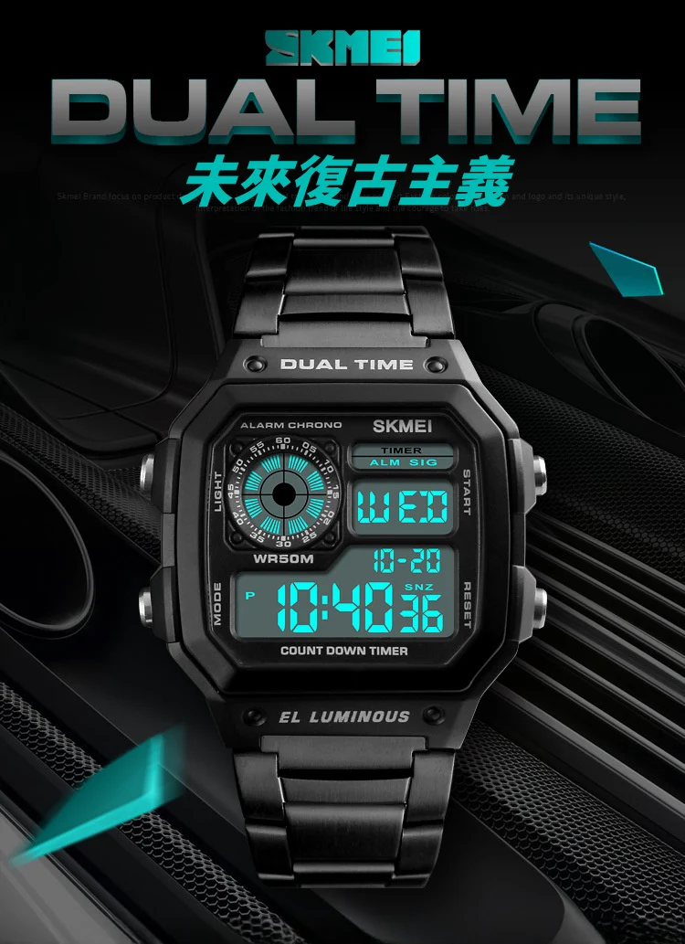 未來復古主義數位電子手錶 | 50米深度防水 | 冷光夜視數顯 | 兩地時間 | 鬧鐘設置 | 碼錶計時 | 星期日曆 | 倒數計時 | 日式男士電子液晶手錶
