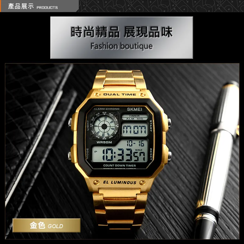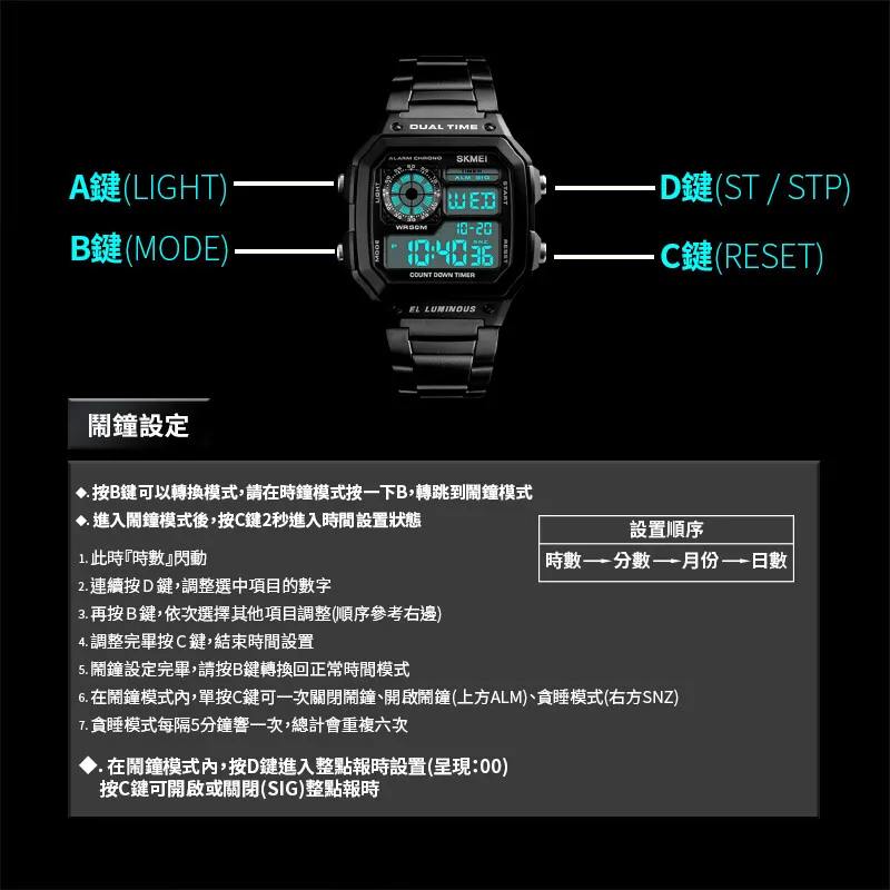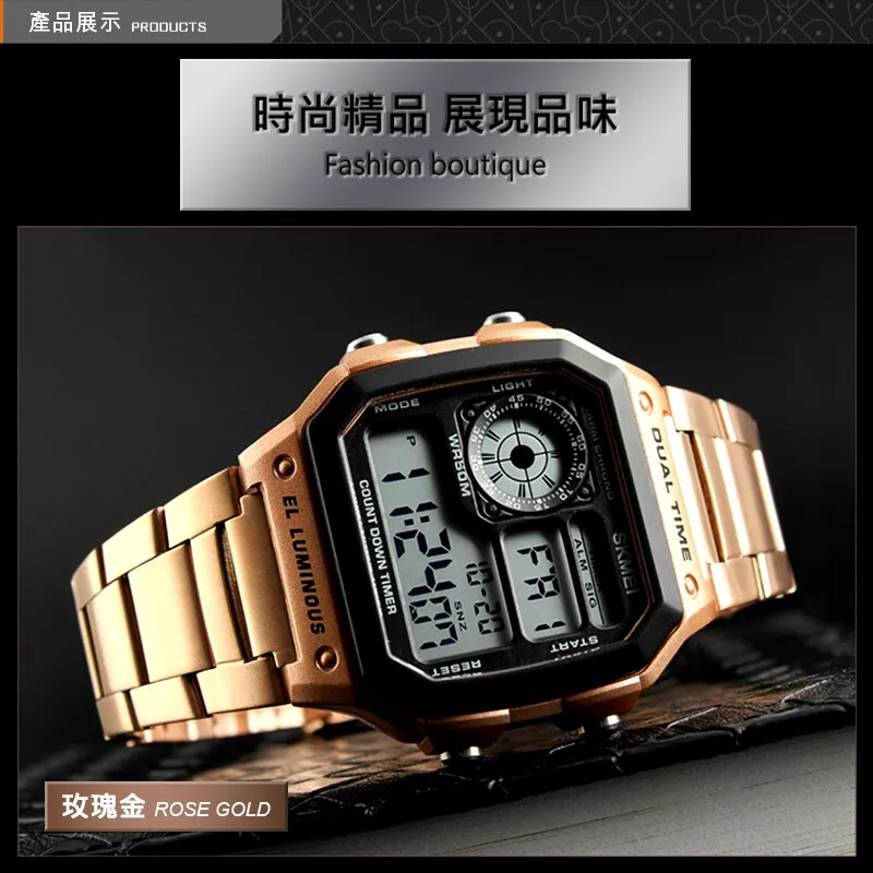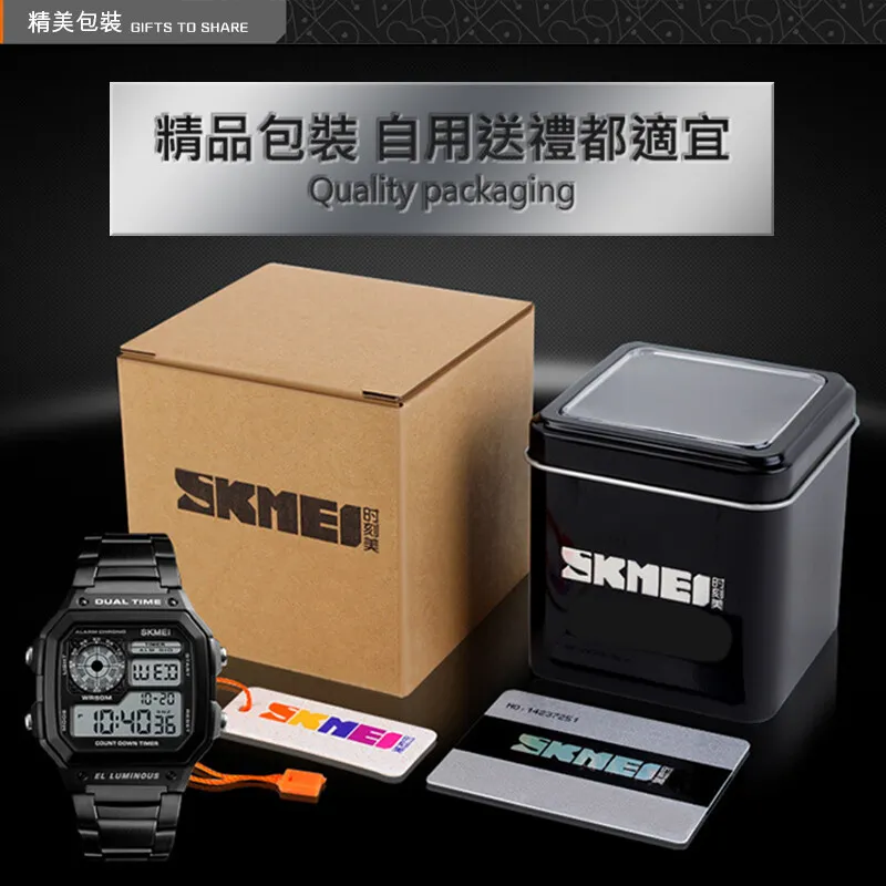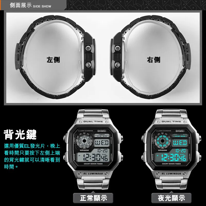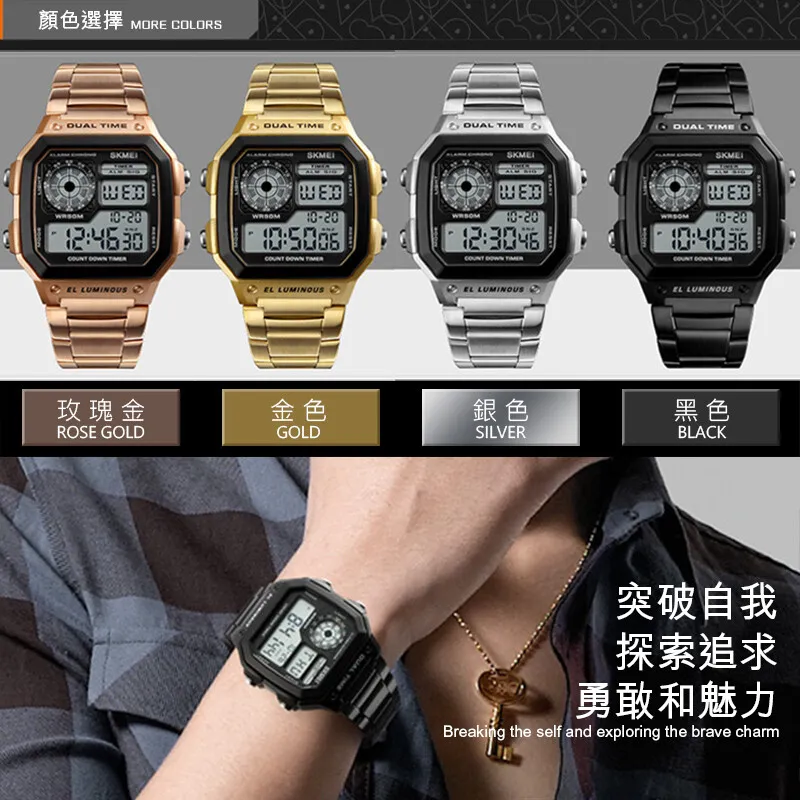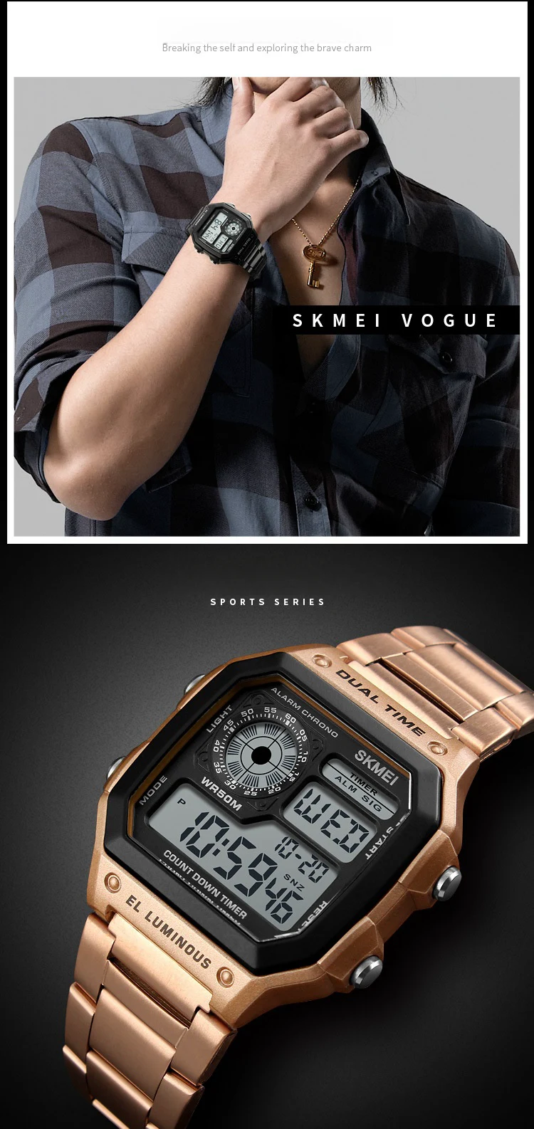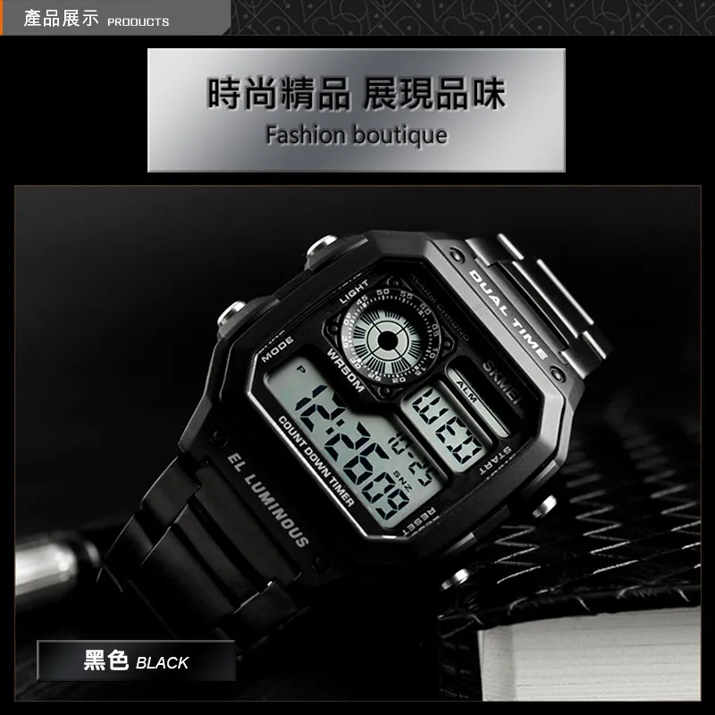 未來復古主義數位電子手錶 | 50米深度防水 | 冷光夜視數顯 | 兩地時間 | 鬧鐘設置 | 碼錶計時 | 星期日曆 | 倒數計時 | 日式男士電子液晶手錶