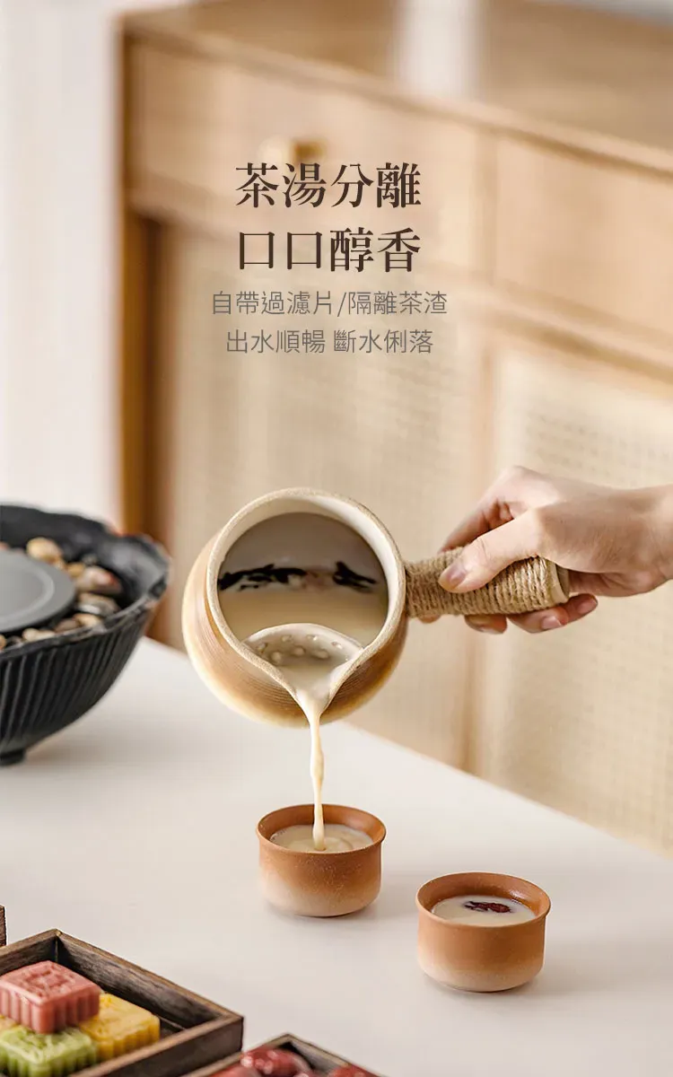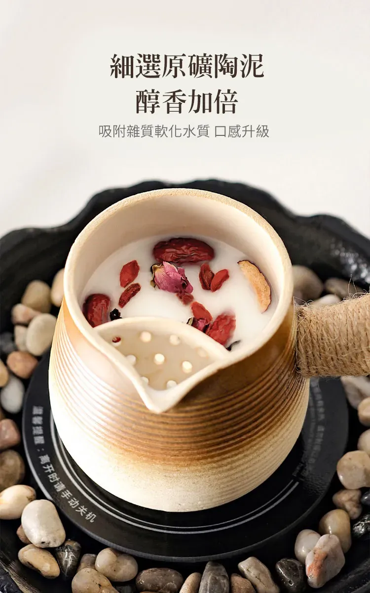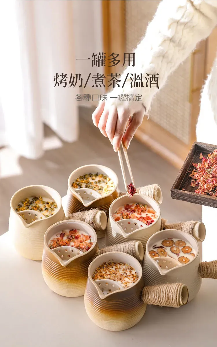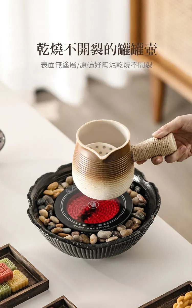古風圍爐烤奶煮茶罐罐壺六杯套組 | 原礦好陶泥軟化水質 | 口感細膩醇香濃郁 | 自帶過濾茶湯分離 | 不挑爐灶乾燒不裂 | 纏線握把防燙隔熱