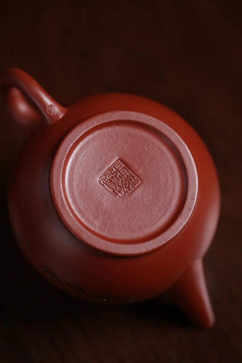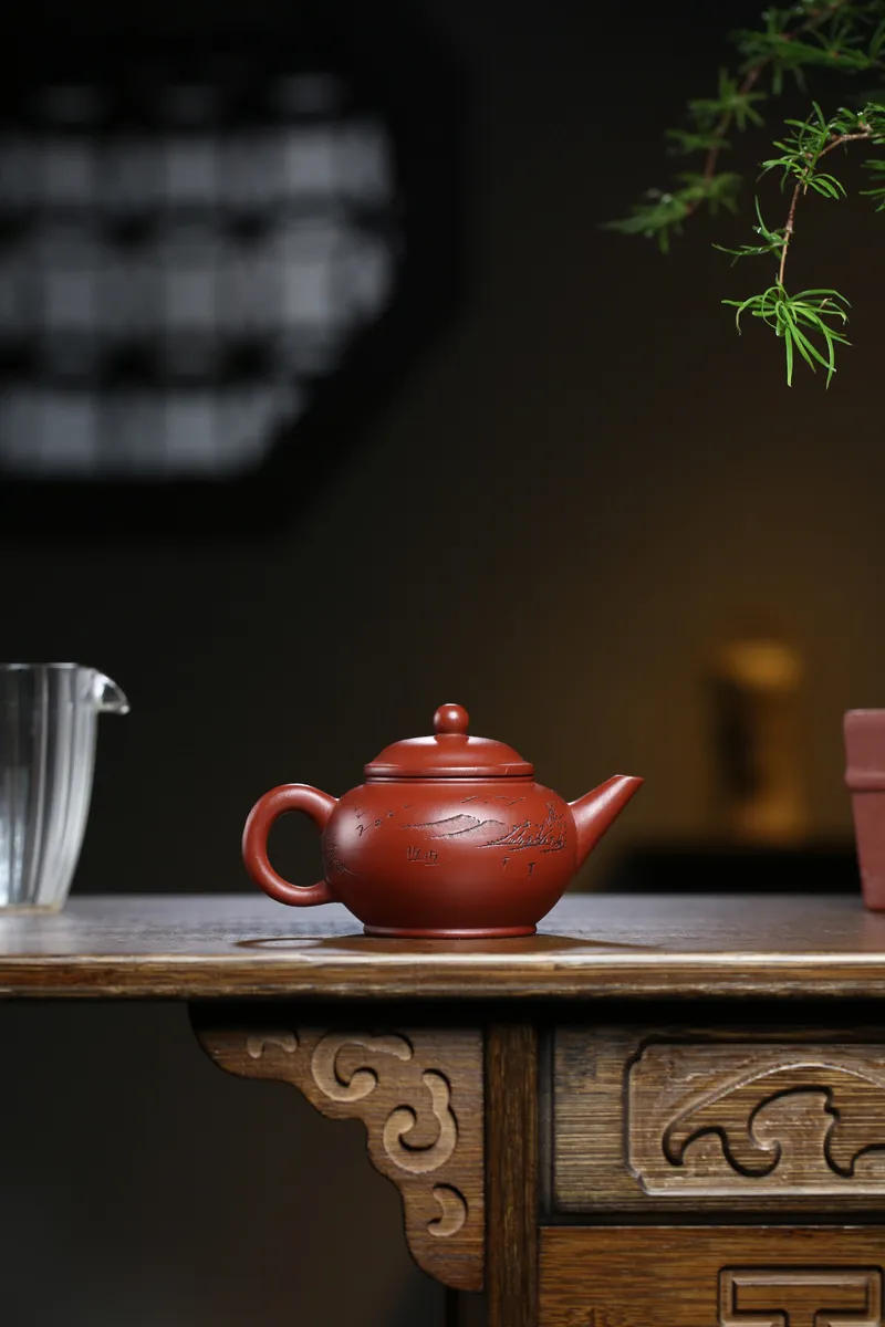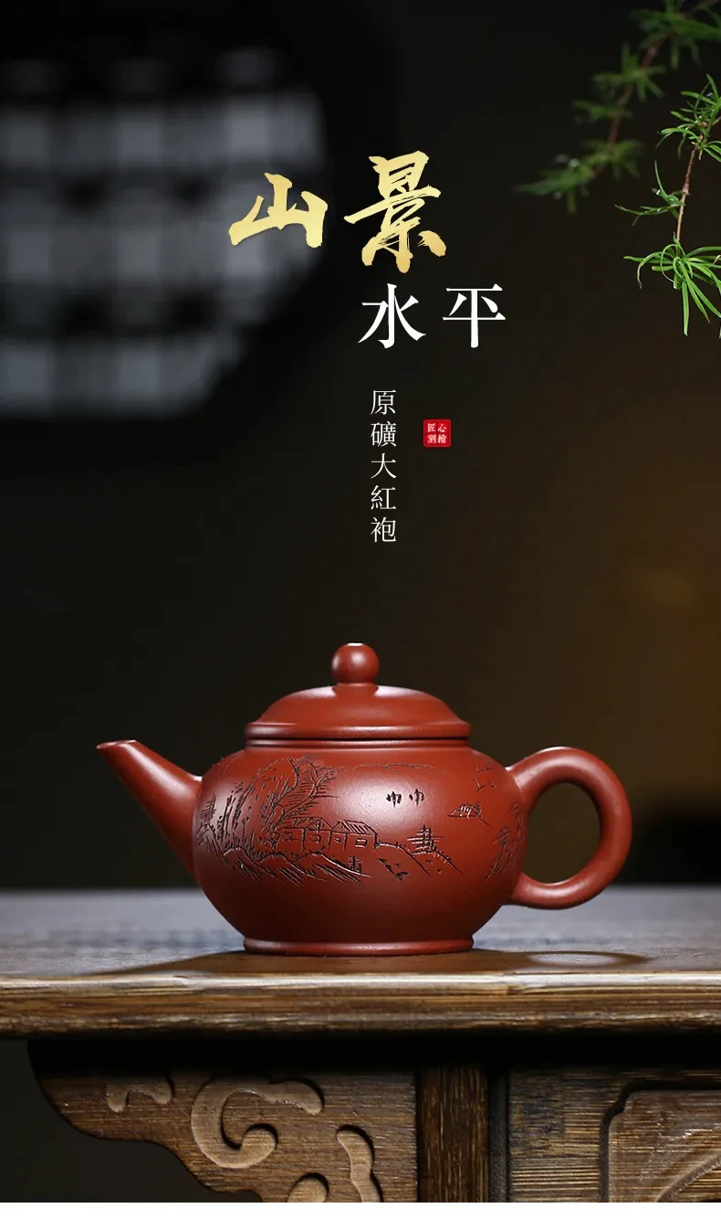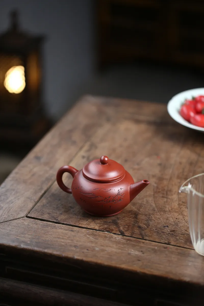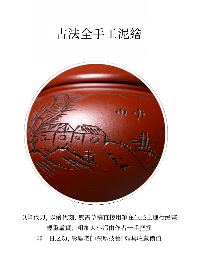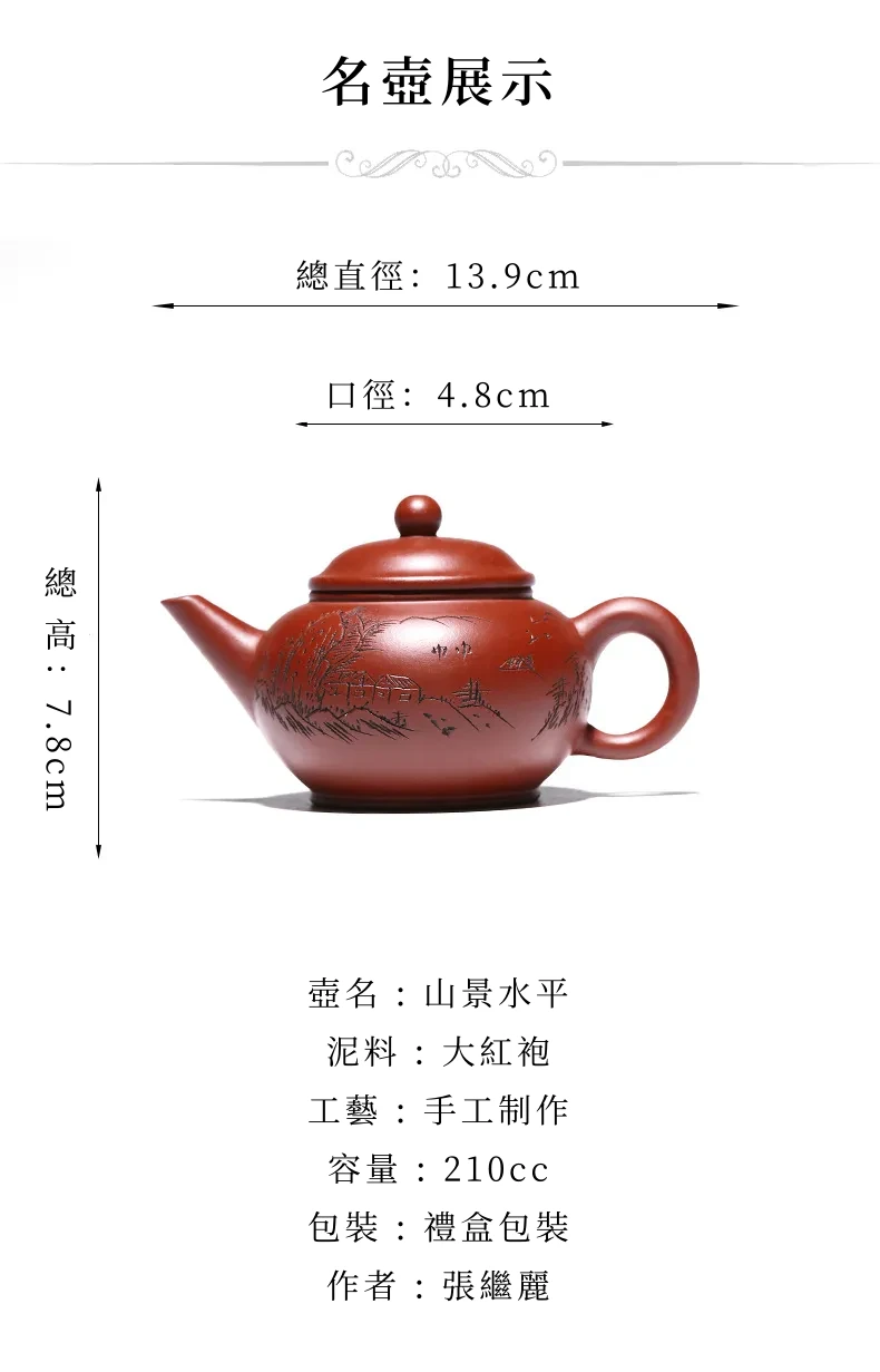 名壺山景水平 | 張繼麗製 | 古法全手工泥繪 | 原礦大紅袍泥料 | 印鑒俱全 | 圓潤飽滿 | 素雅古韻 | 宜興名家手製原礦紫砂茶壺手工紫砂壺