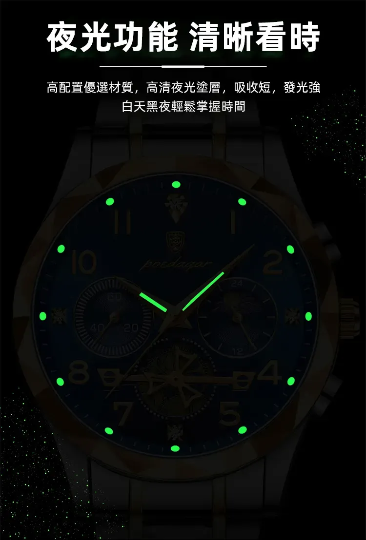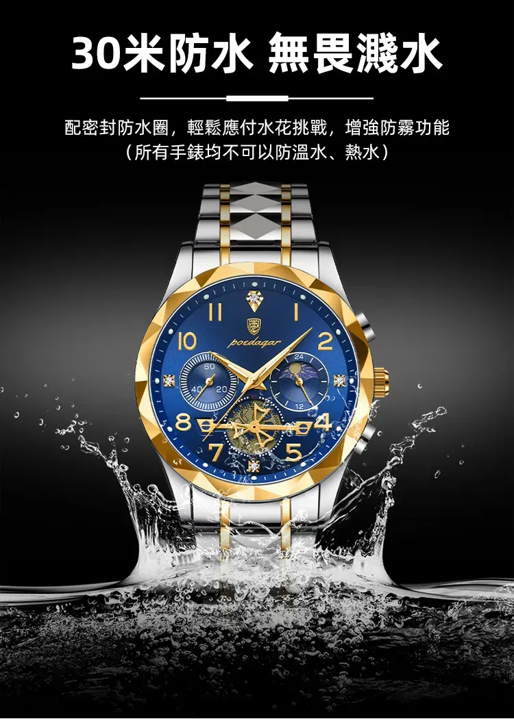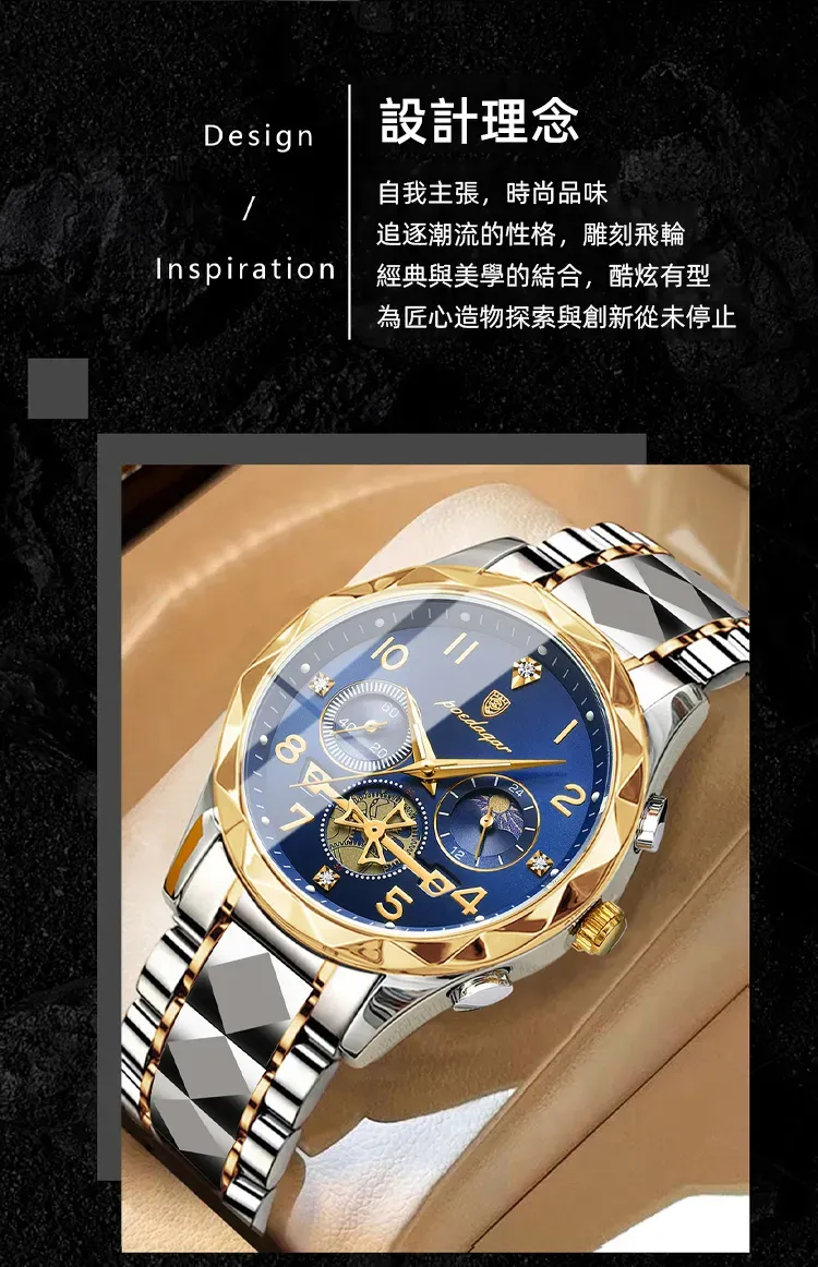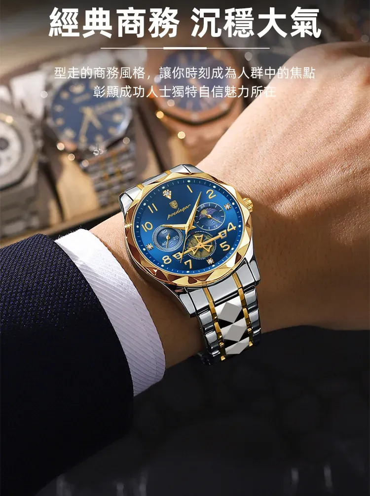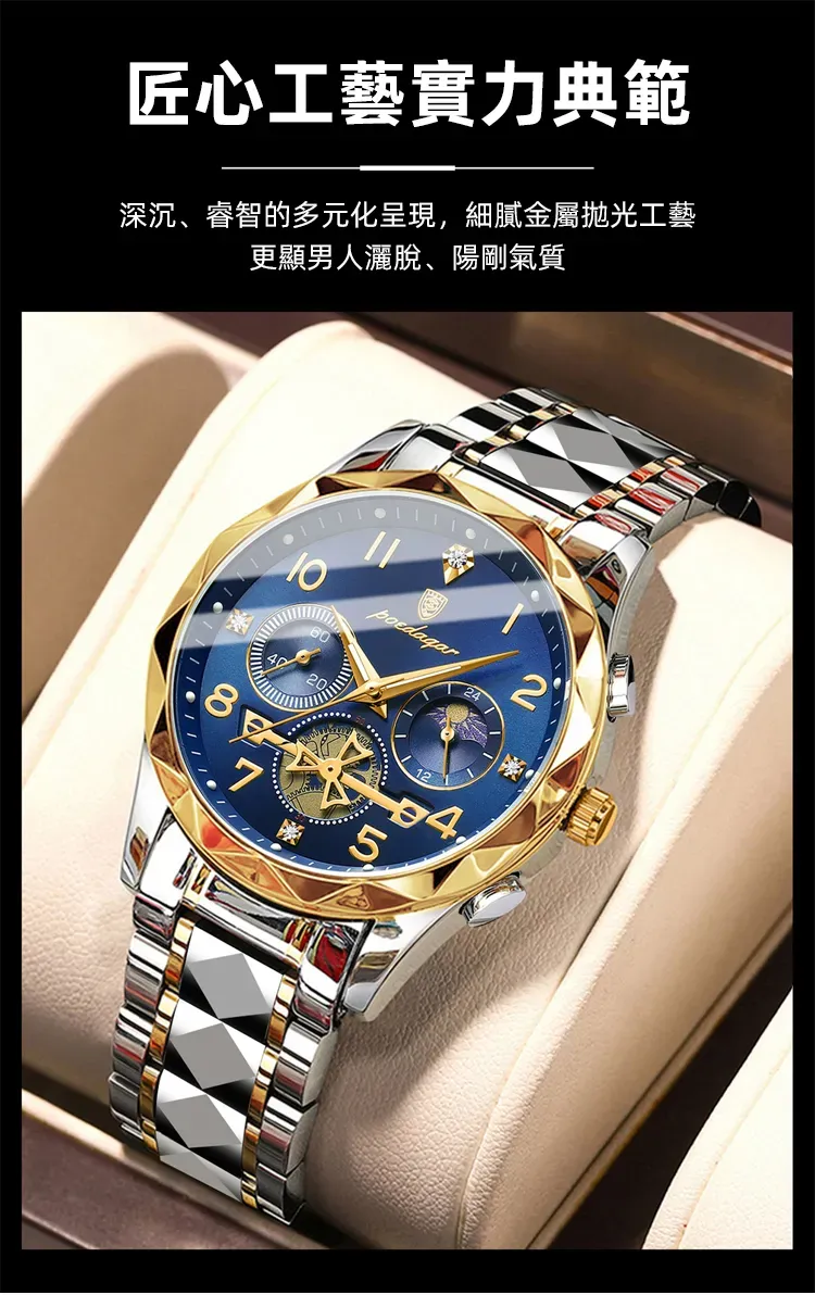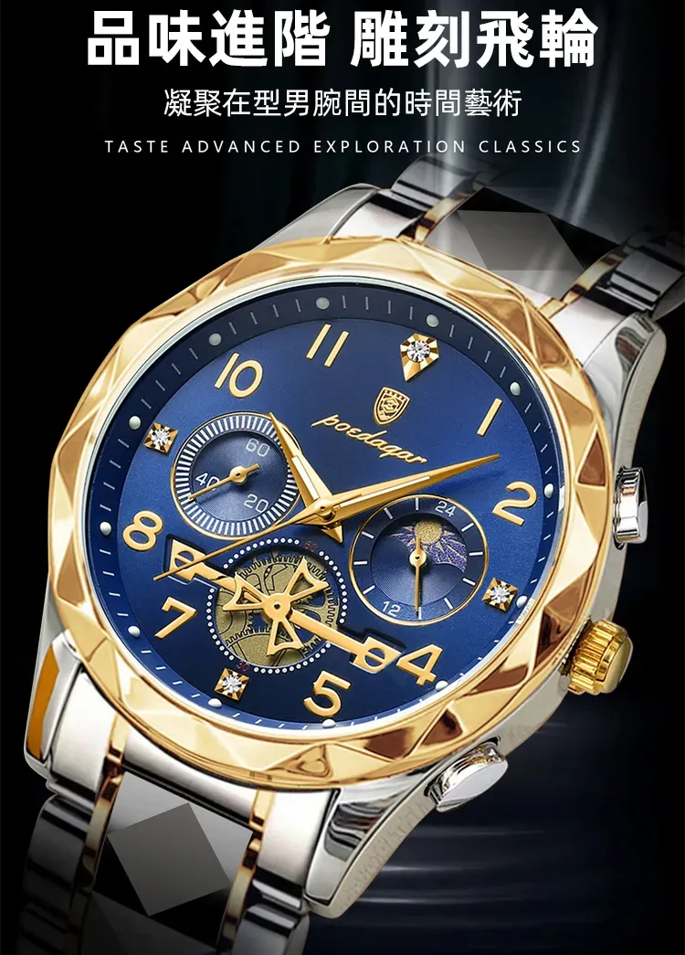 雕刻時光格調型男手錶 | 三眼五針月相飛輪 | CNC立體切割錶殼 | 強視夜光 | 30米防水 | 精鋼錶帶 | 鍍膜鏡面 | POEDAGAR高級男士多功能手錶
