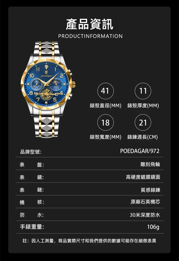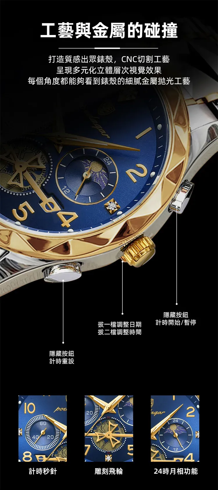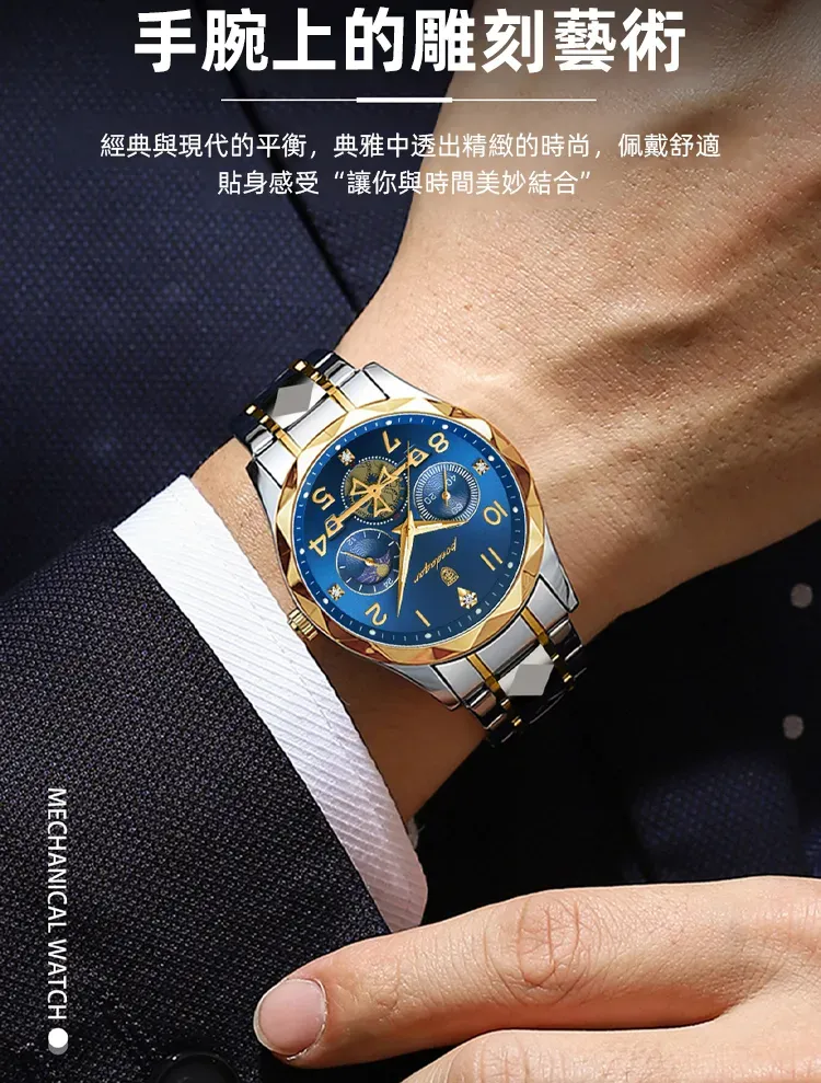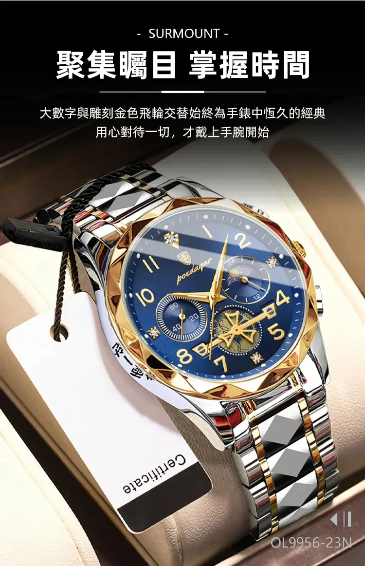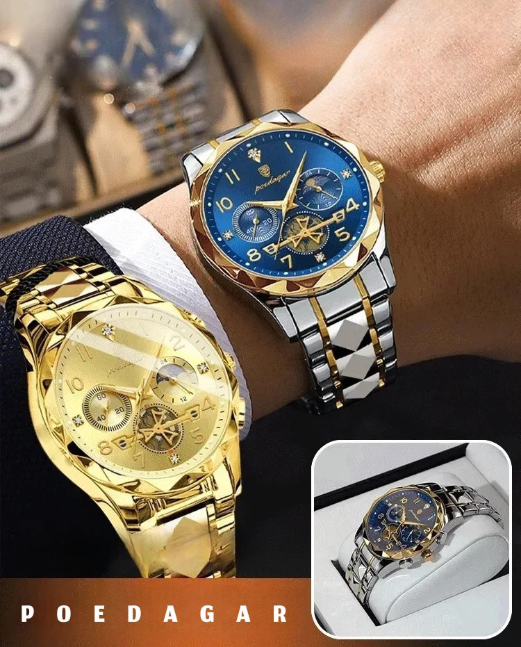雕刻時光格調型男手錶 | 三眼五針月相飛輪 | CNC立體切割錶殼 | 強視夜光 | 30米防水 | 精鋼錶帶 | 鍍膜鏡面 | POEDAGAR高級男士多功能手錶