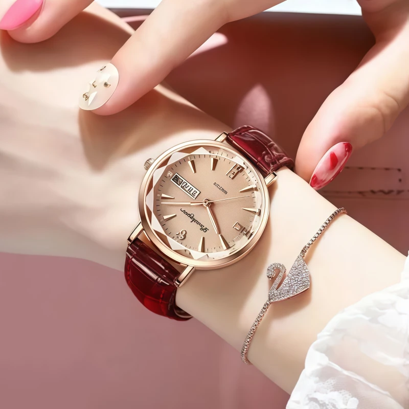 女錶・時光戀旅人 | 鑽石花型錶鏡 | 勃艮第紅皮錶帶 | 太陽鑽型時刻 | 日本高級石英機芯 | 星期日曆顯示 | 50米防水 | 瑞士POEDAGAR女錶