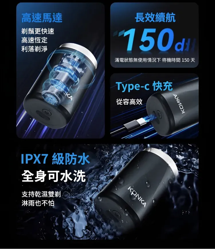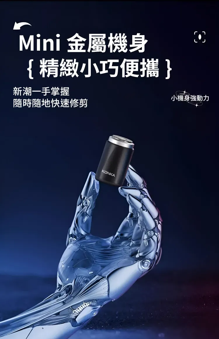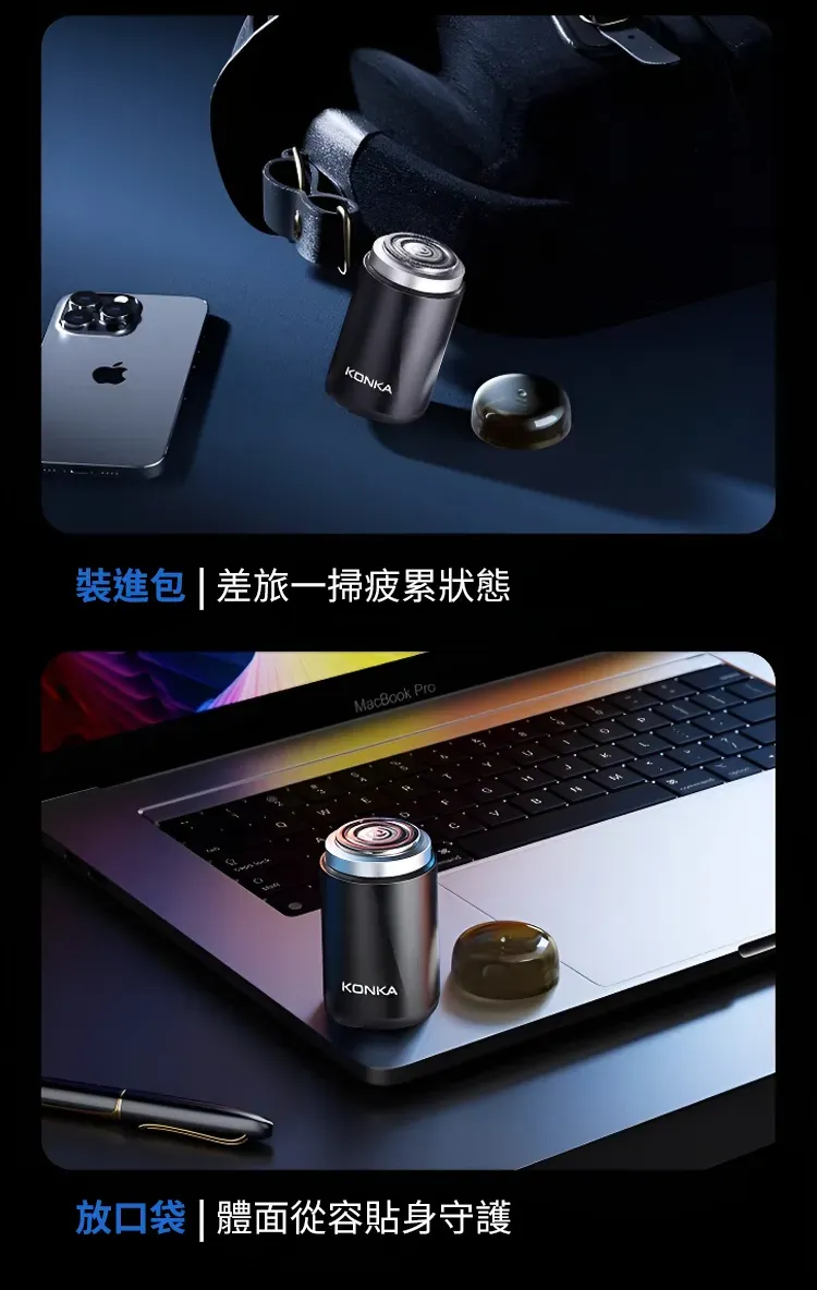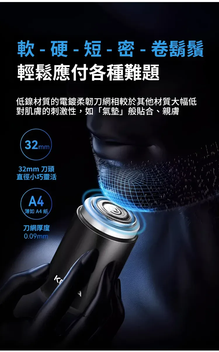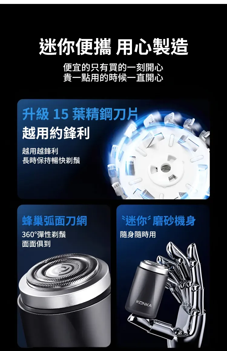 3.0無感理容智慧口袋刮鬍刀 | 精鋼15葉自研磨刀片 | 蜂巢貼面雙環刀網 | 高速馬達強勁動力 | 免拆沖洗乾濕兩用 | KONKIA不挑鬍鬚迷你電動刮鬍刀