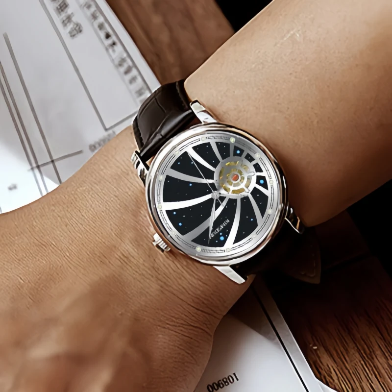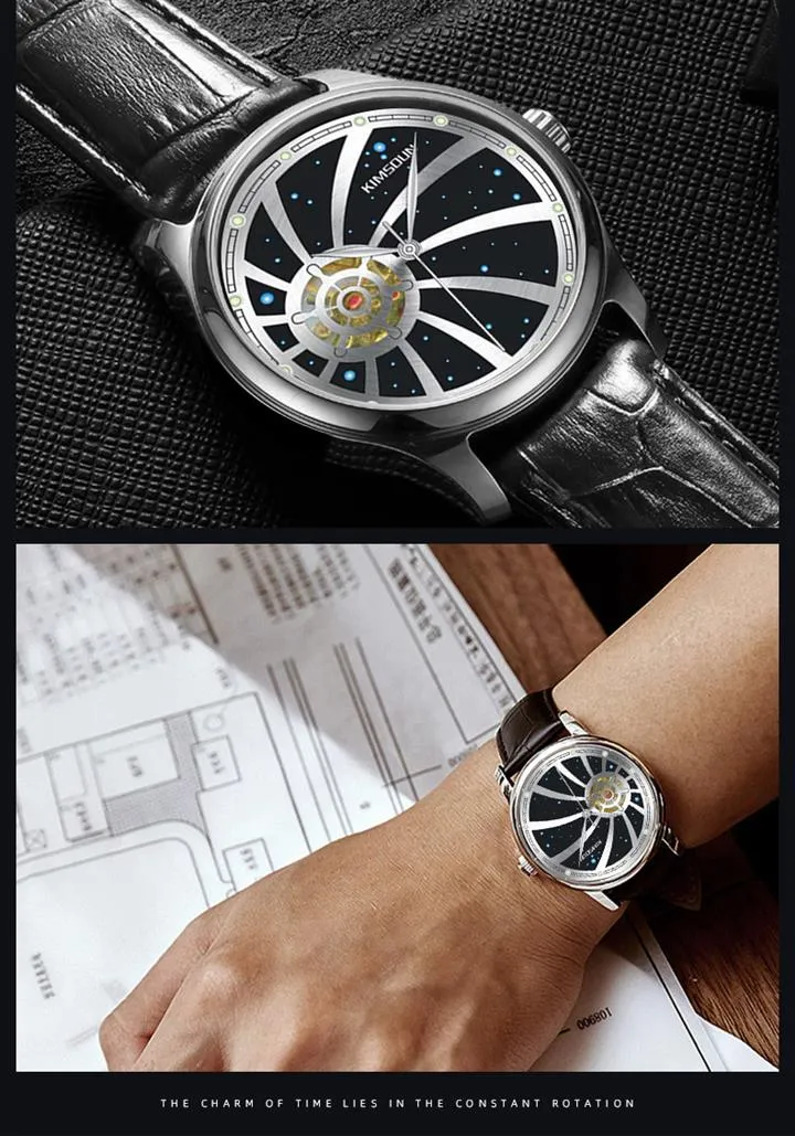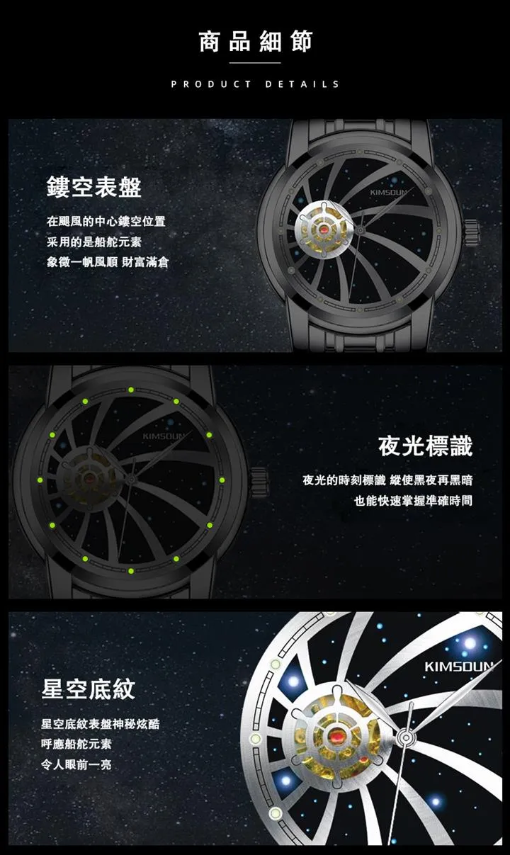 追夢星空全自動機械手錶 | 浪漫星空錶盤 | 船舵鏤空內芯 | 高級小牛皮錶帶 | 強視環保夜光 | 30米高壓防水 | 高級男士追夢星空全自動機械手錶