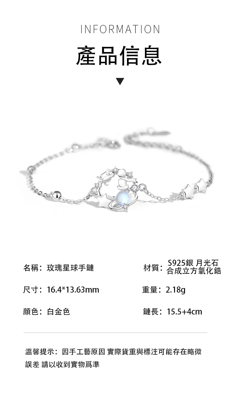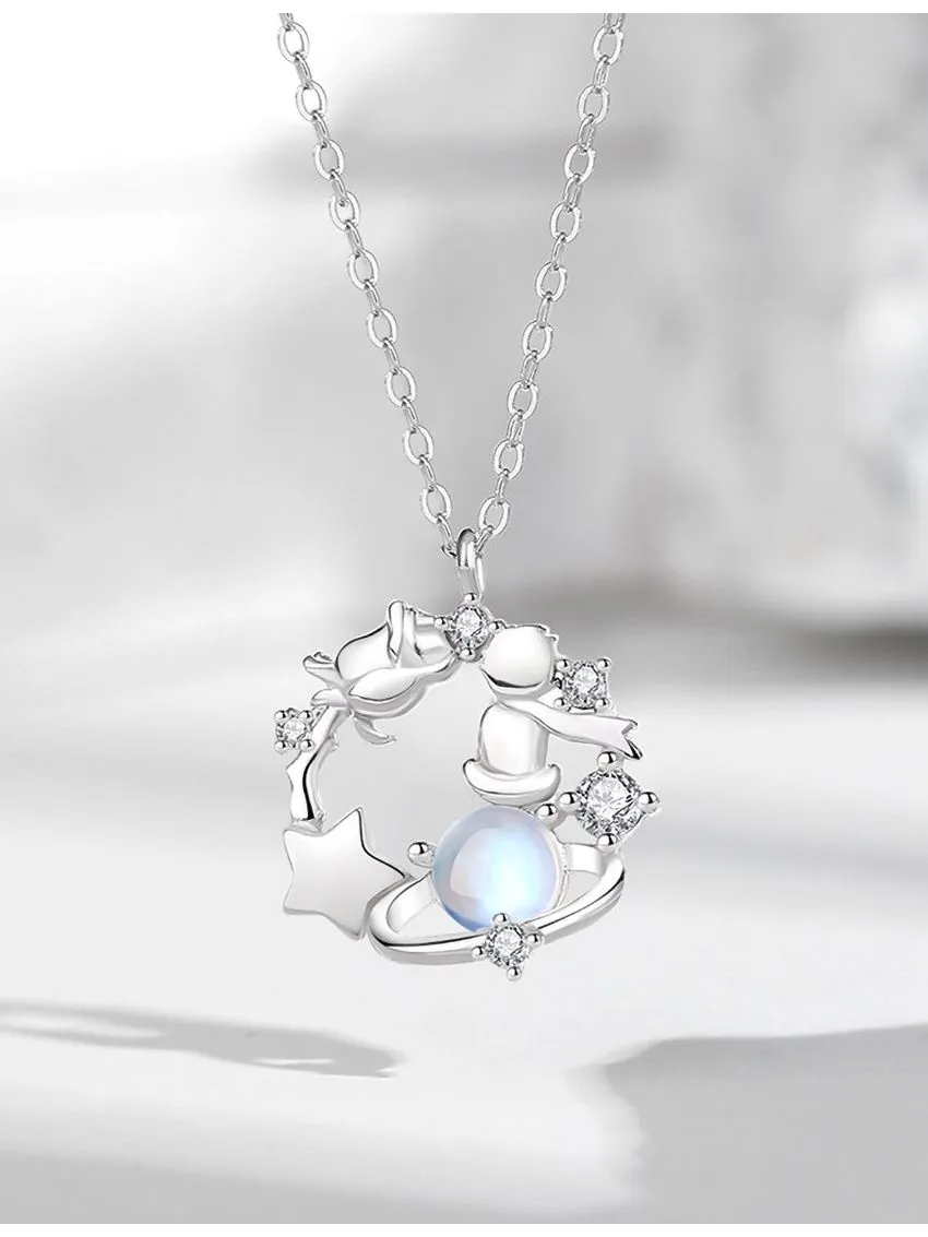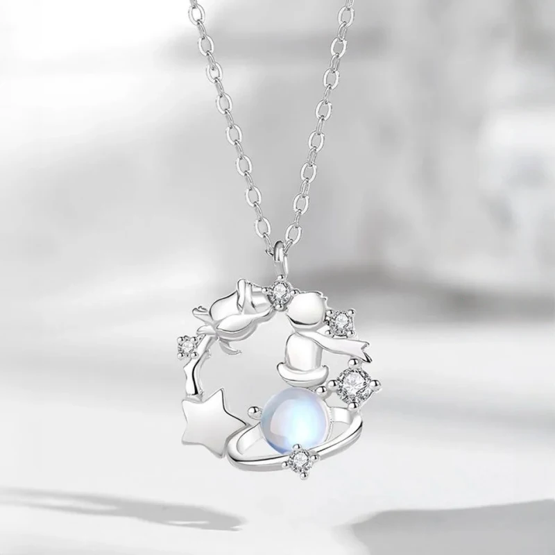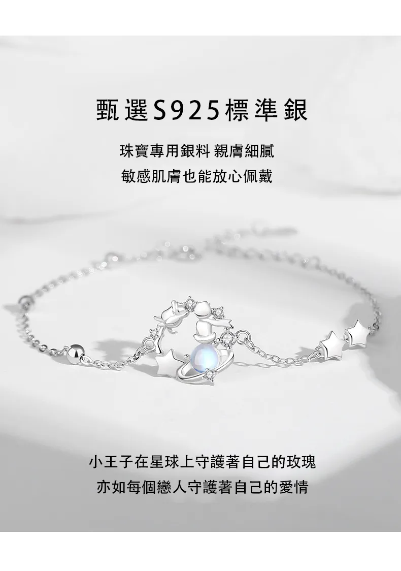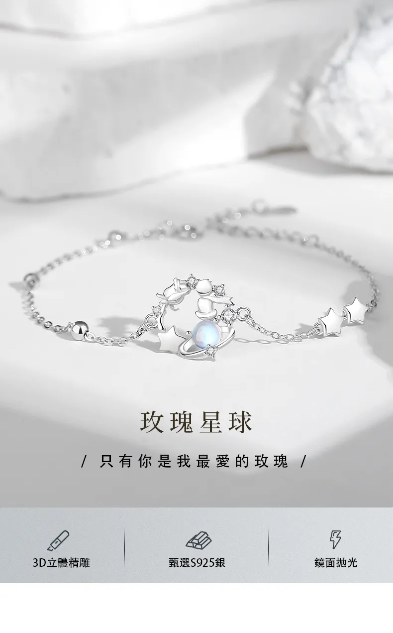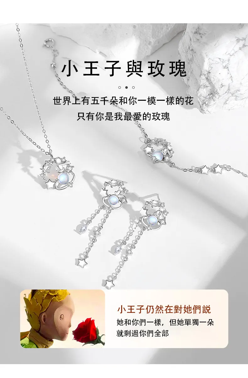 小王子的玫瑰星球守護項鍊 | 只有妳是我最愛的玫瑰 | S925純銀鑲嵌月光石 | 3D立體精雕 | 鏡面拋光 | 高級送女生禮物玫瑰星球純銀項鍊