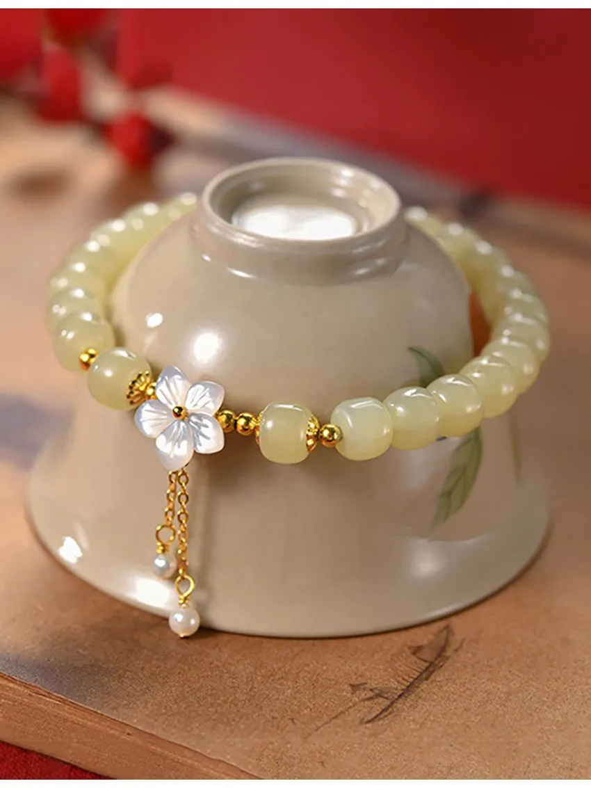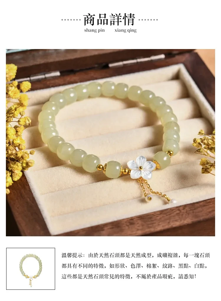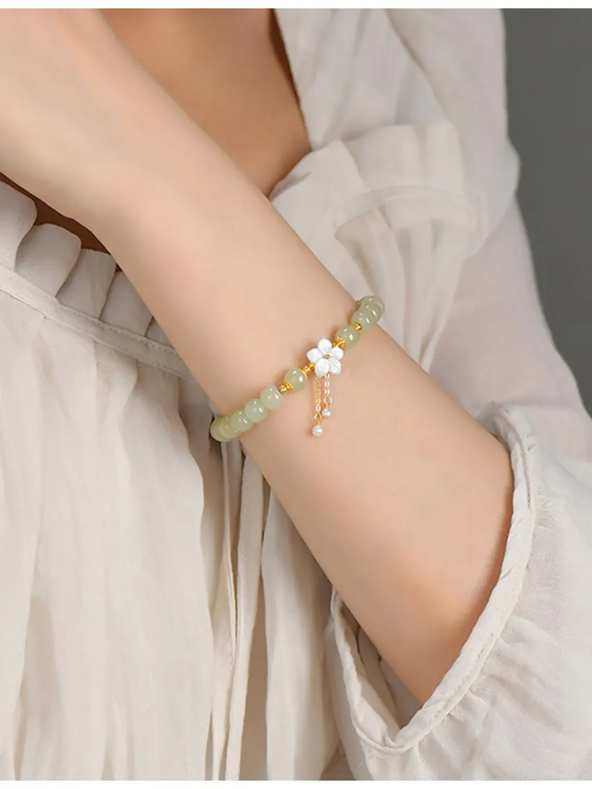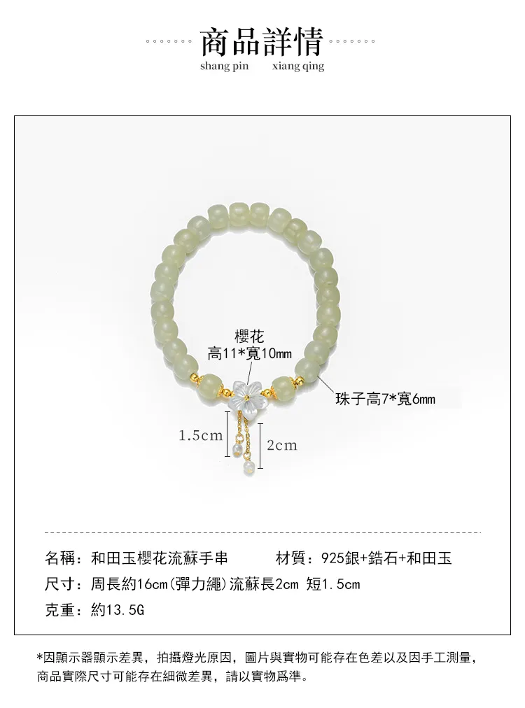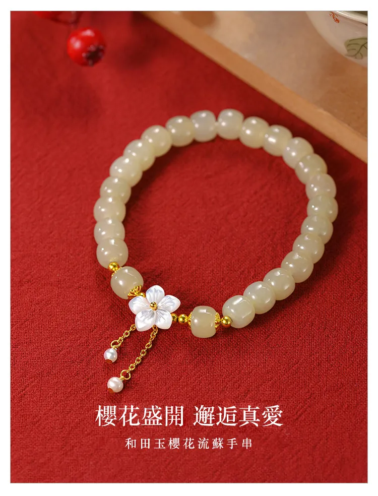 櫻花盛開邂逅真愛 | 天然和田玉手鍊 | 手工精雕櫻花流蘇 | 925純銀配件 | 高級優雅氣質天然和田玉女生手鍊手串