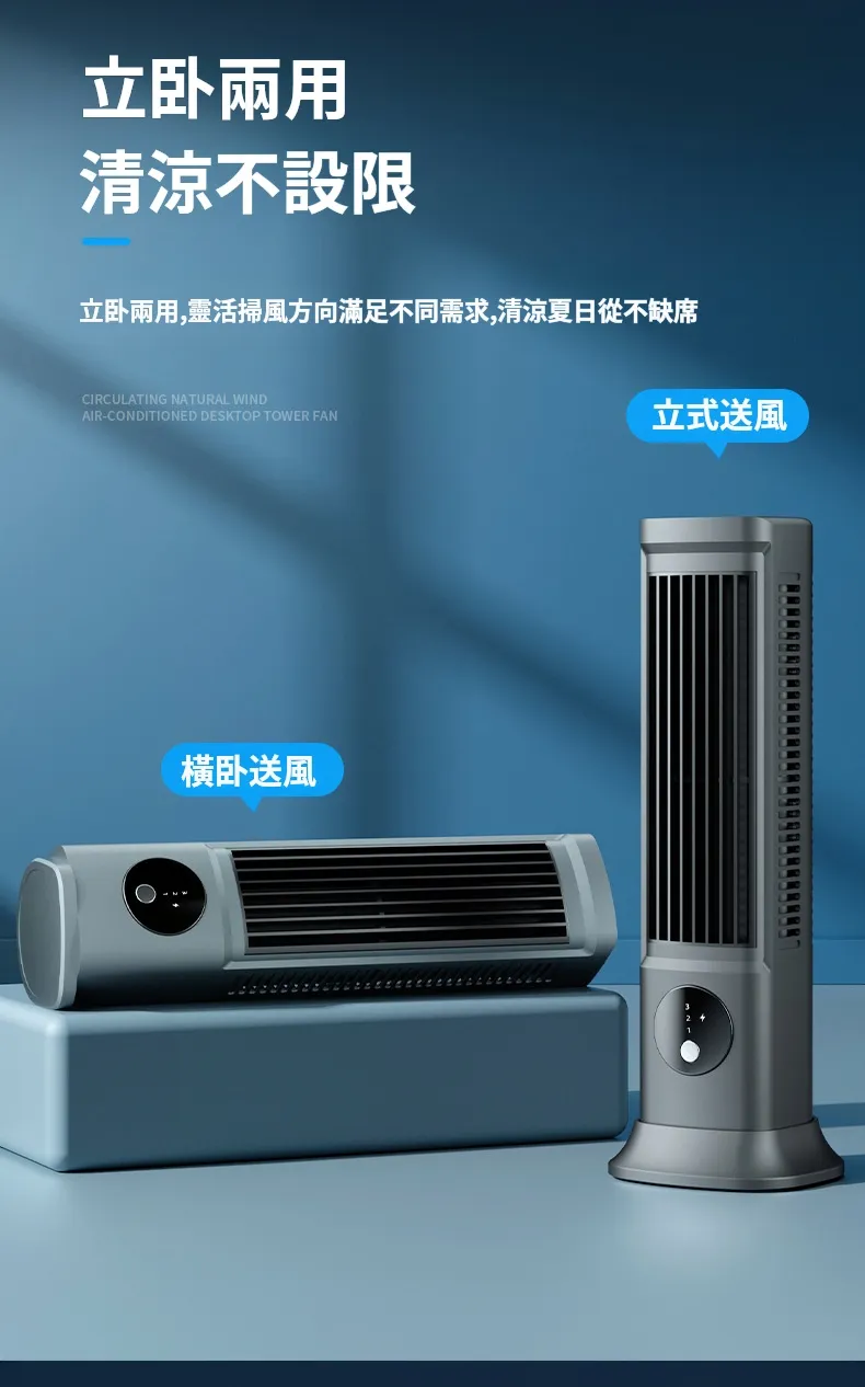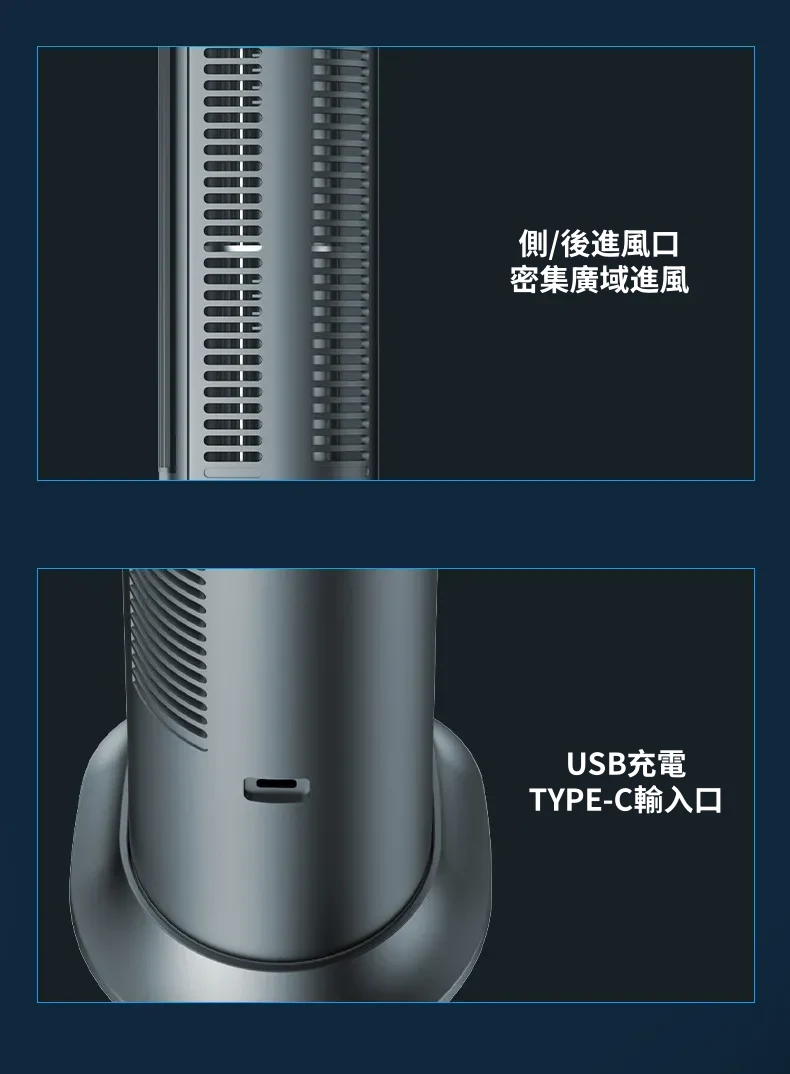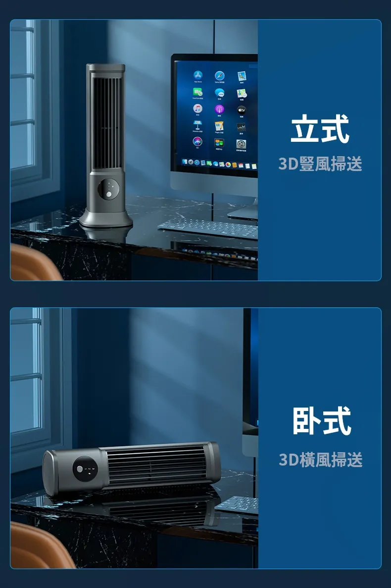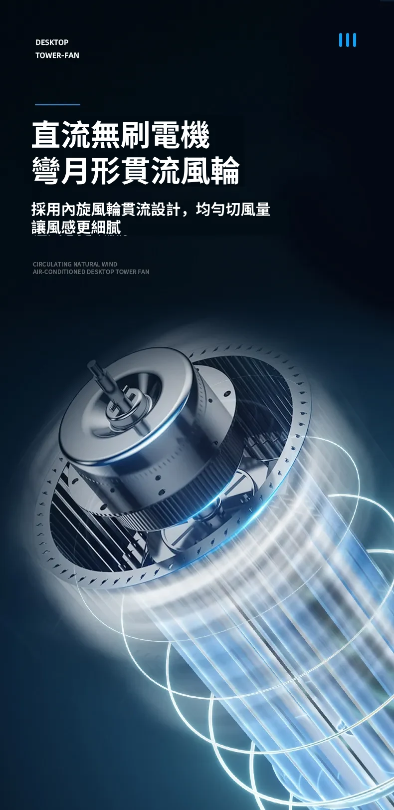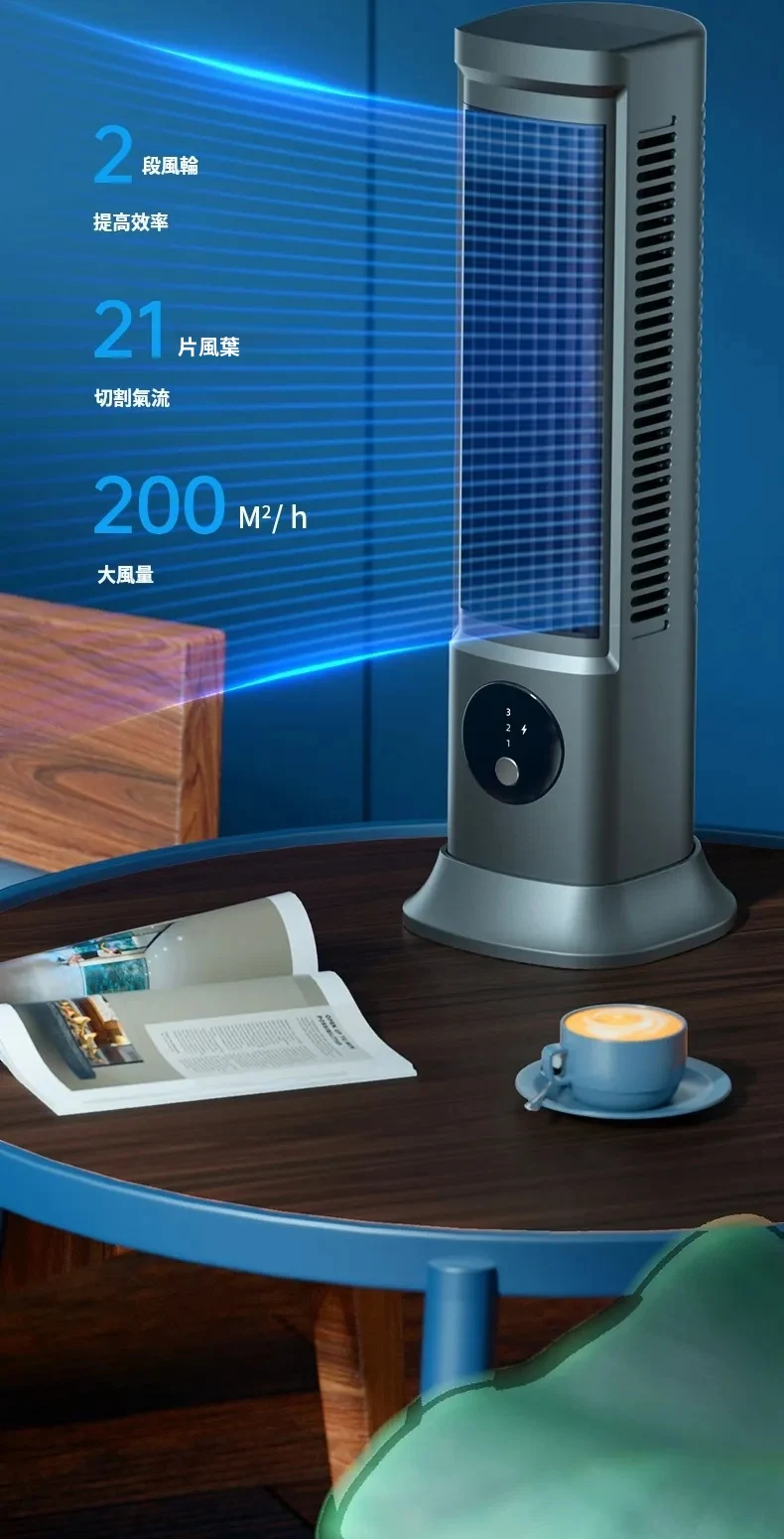 彎月貫流靜音無葉循環塔扇 | 可立可臥多場景適用 | 廣域送風三檔調速 | 無刷馬達靜音低噪 | 自然風感立體交互USB充電循環桌扇