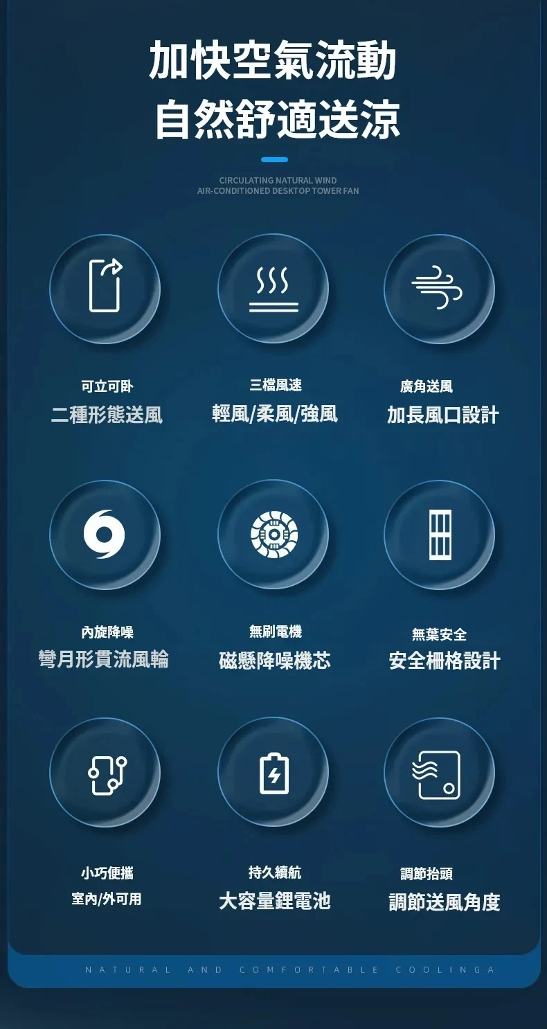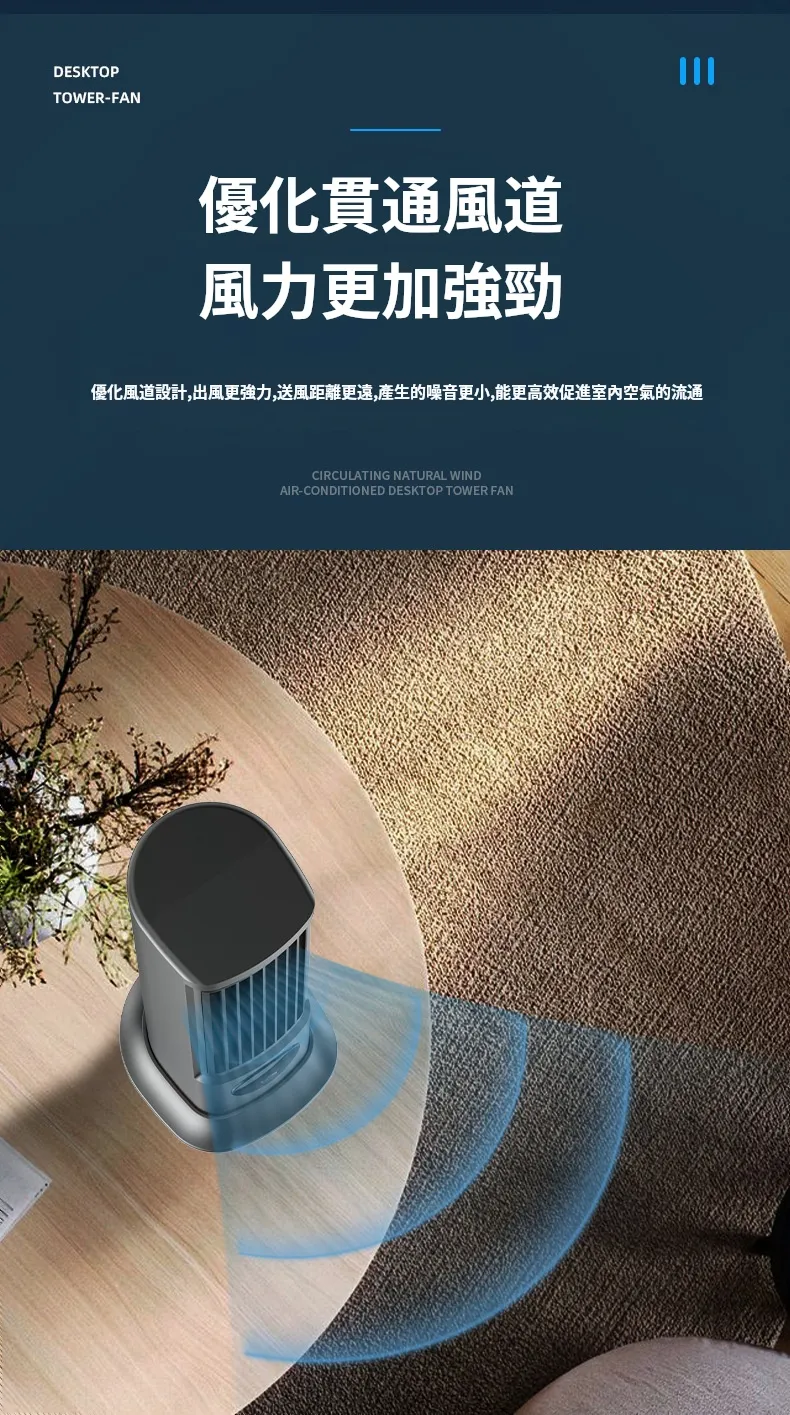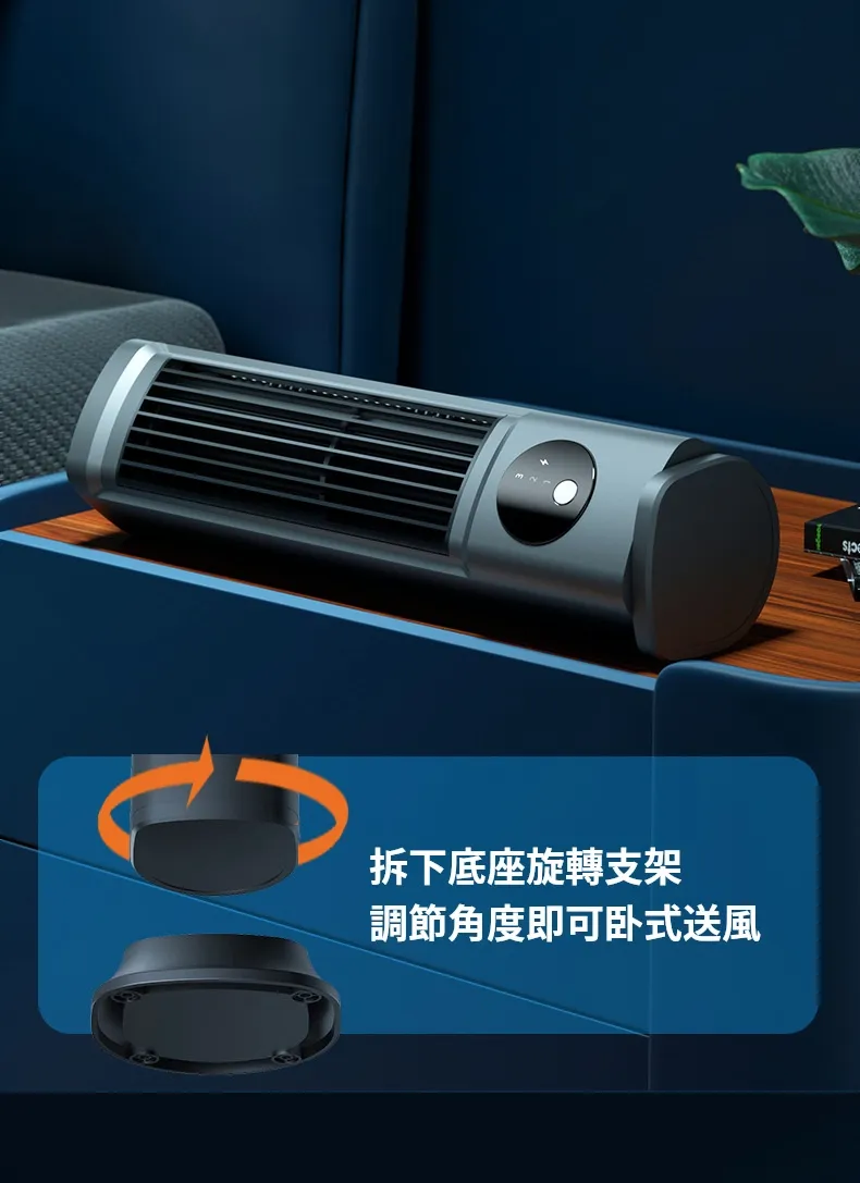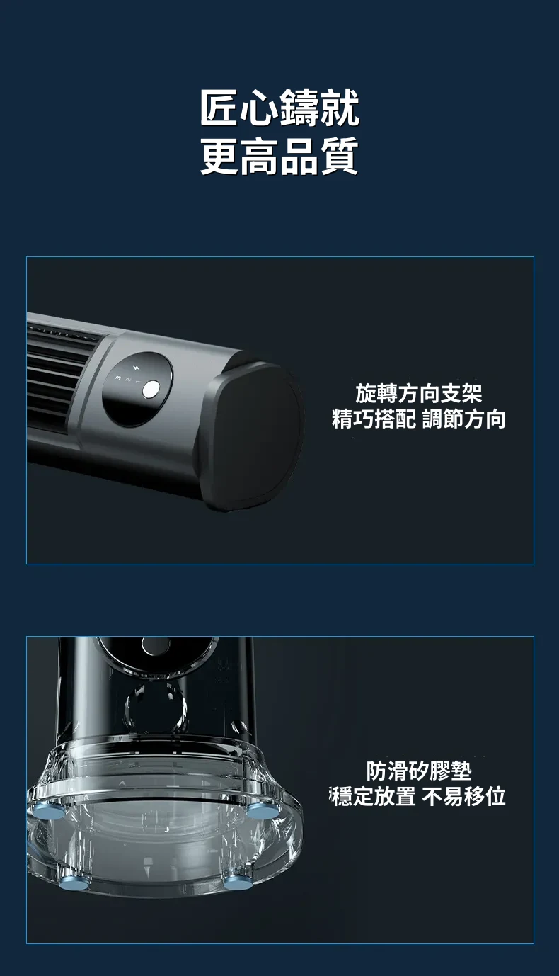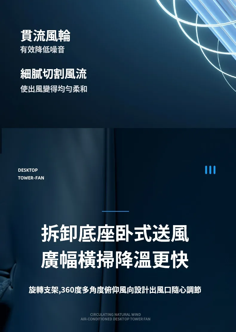 彎月貫流靜音無葉循環塔扇 | 可立可臥多場景適用 | 廣域送風三檔調速 | 無刷馬達靜音低噪 | 自然風感立體交互USB充電循環桌扇