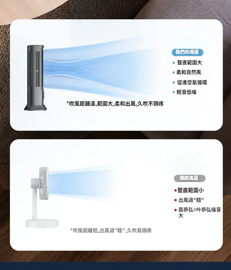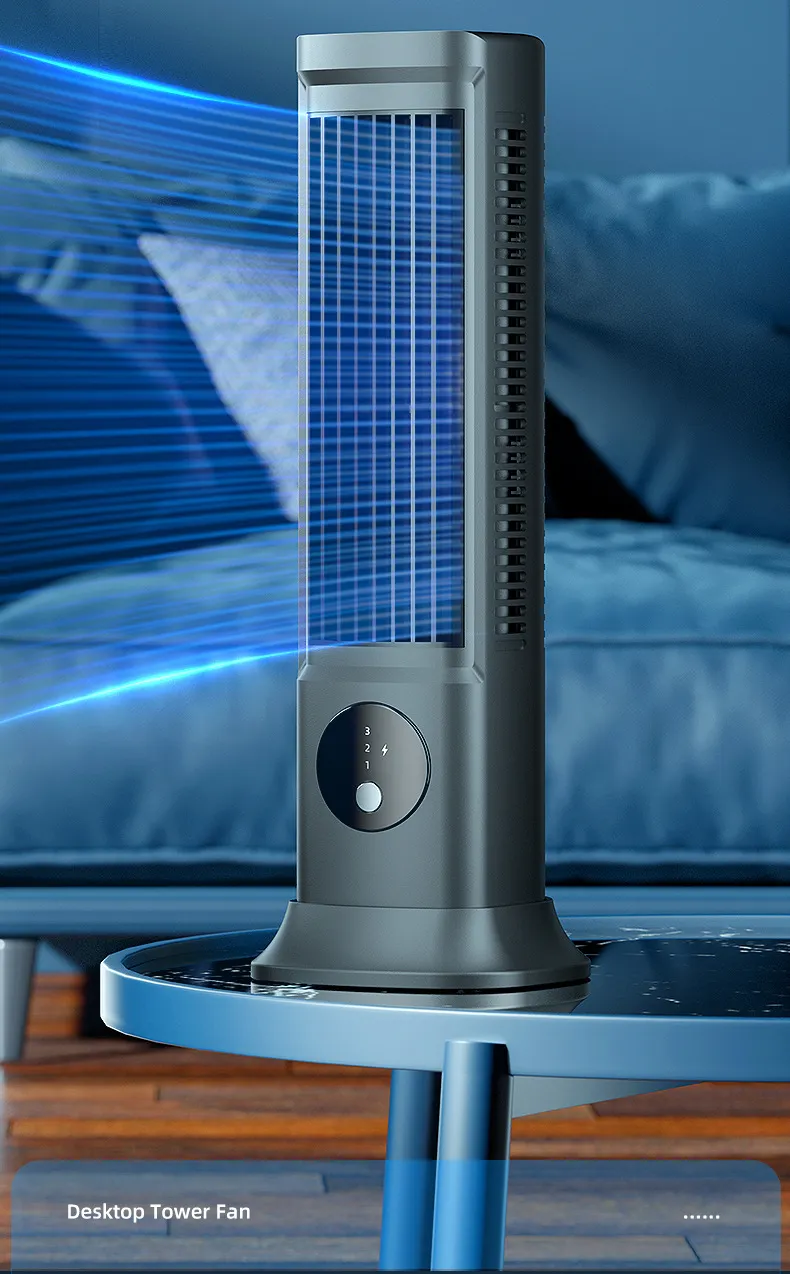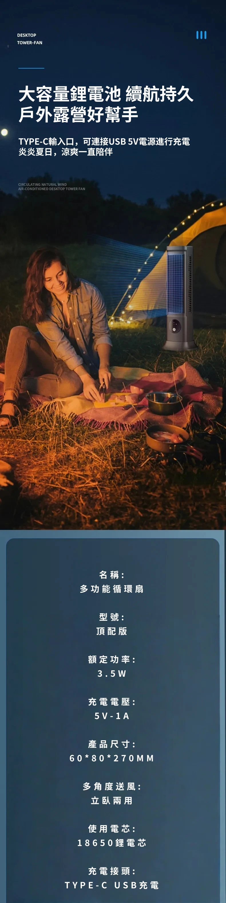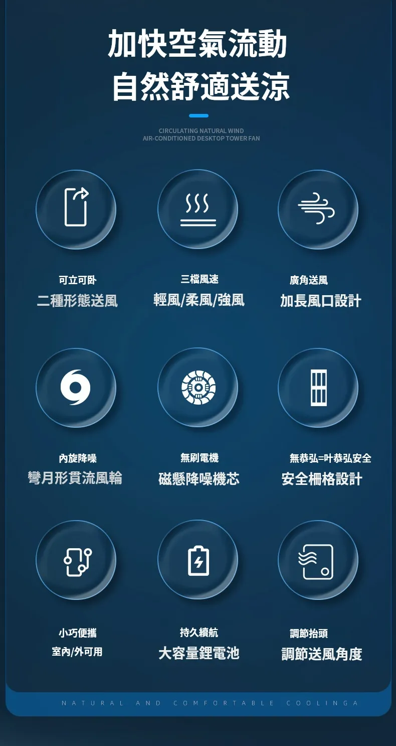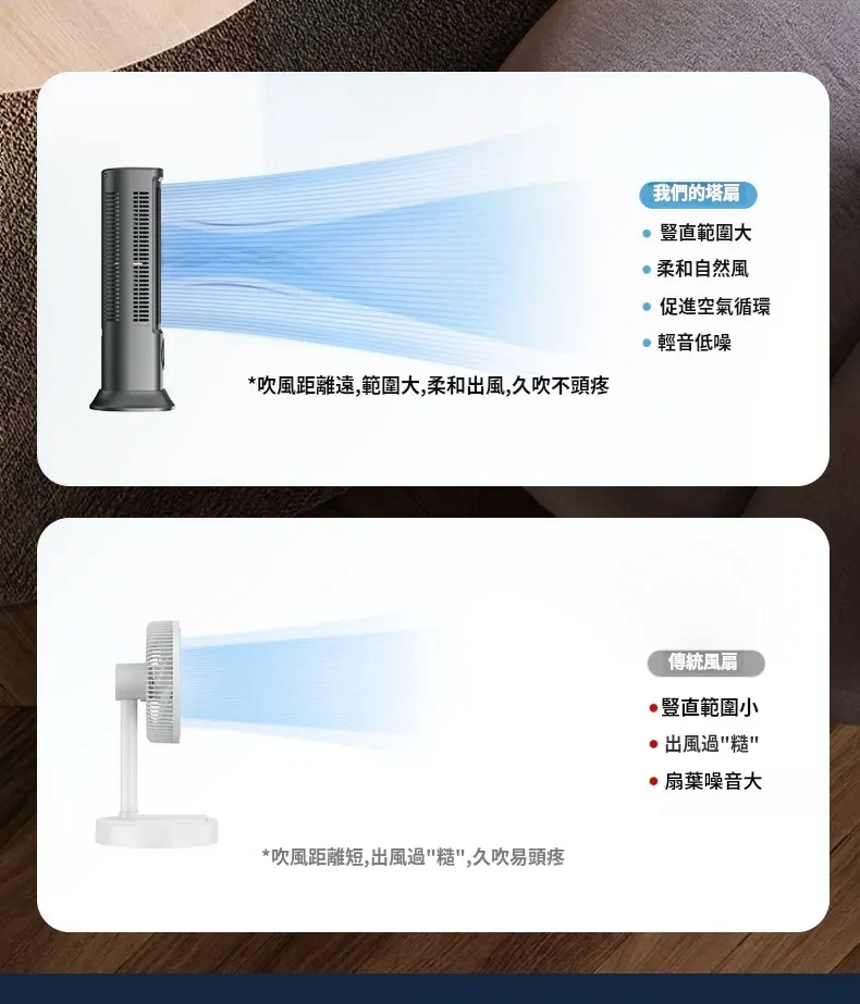 彎月貫流靜音無葉循環塔扇 | 可立可臥多場景適用 | 廣域送風三檔調速 | 無刷馬達靜音低噪 | 自然風感立體交互USB充電循環桌扇