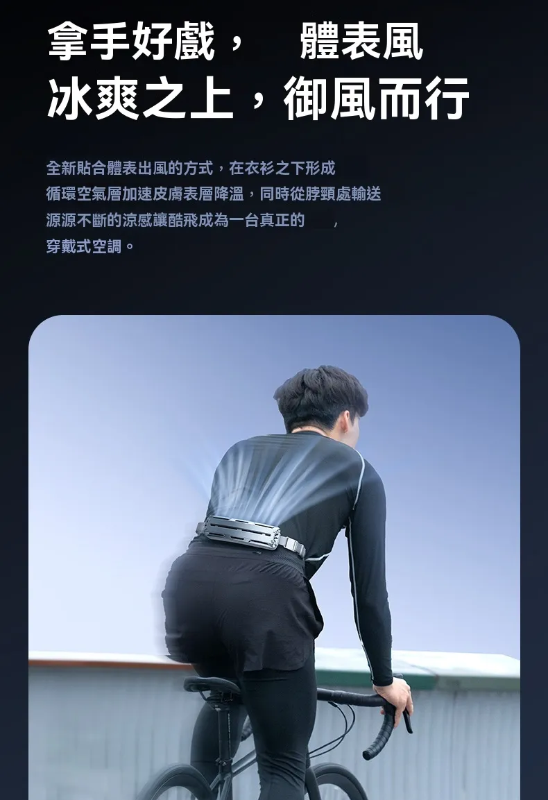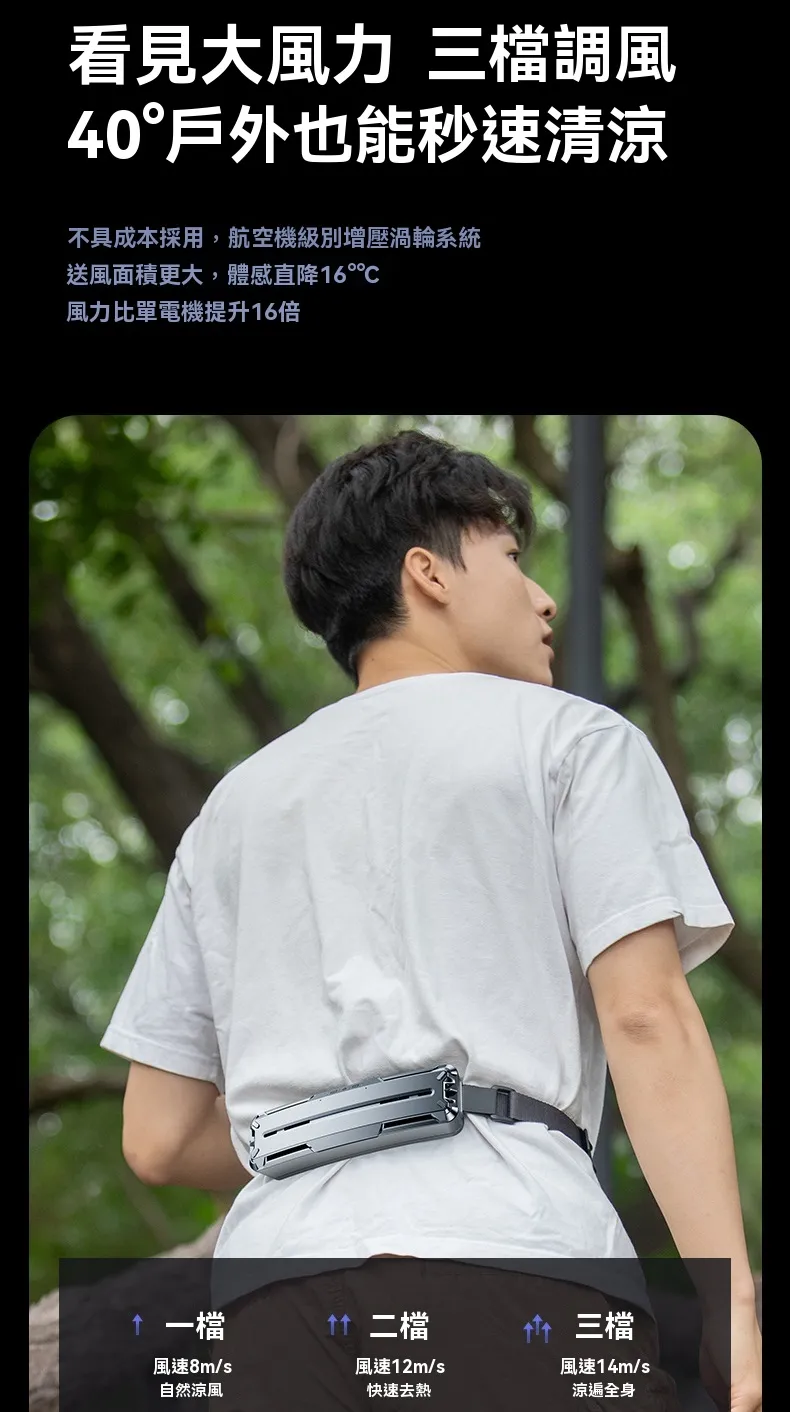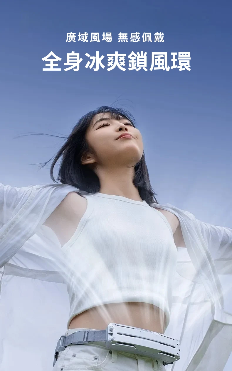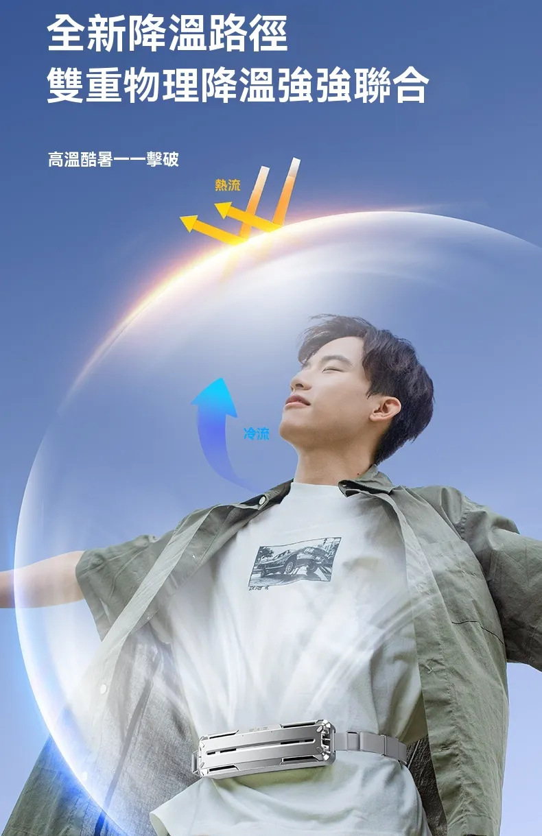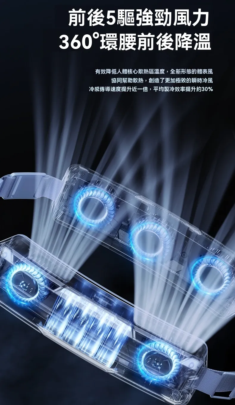 4D全身風幕鎖風環掛腰風扇 | 五驅風扇強勁大風 | 雙邊PCM冰感降溫 | 超薄氣凝膠導冷膜 | 航母級超長續航 | 黑科技未來感鎖風環掛腰風扇