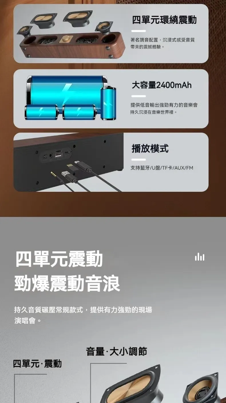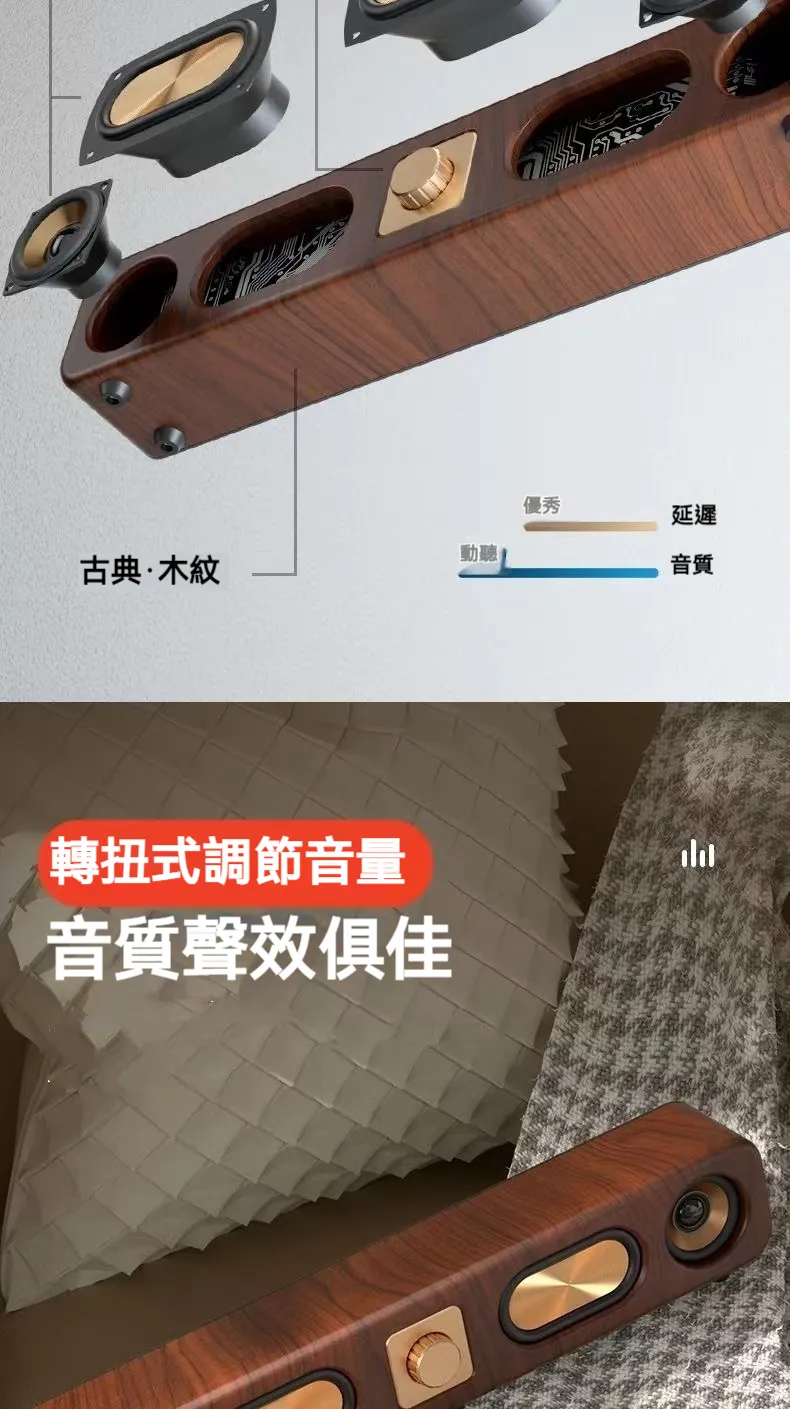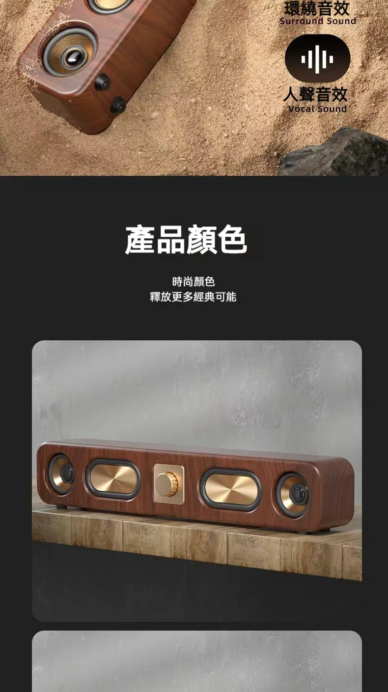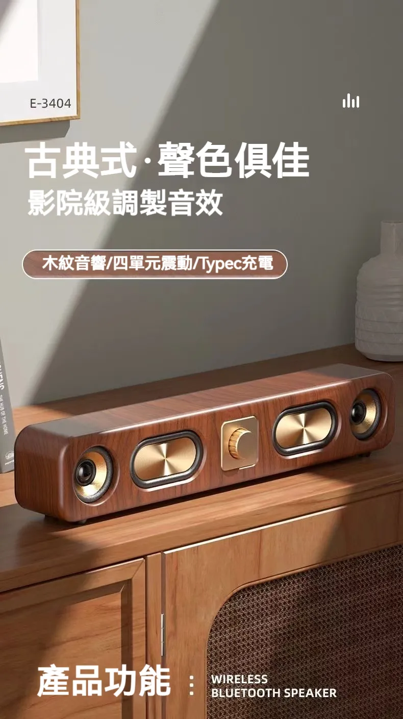 古典式雅緻木紋無線藍芽喇叭 | 四單元環繞音浪 | 復合振膜金屬腔體 | 有線無線自由切換 | 高中低音三頻均衡 | 航母級續航 | 高級無線藍牙喇叭音響