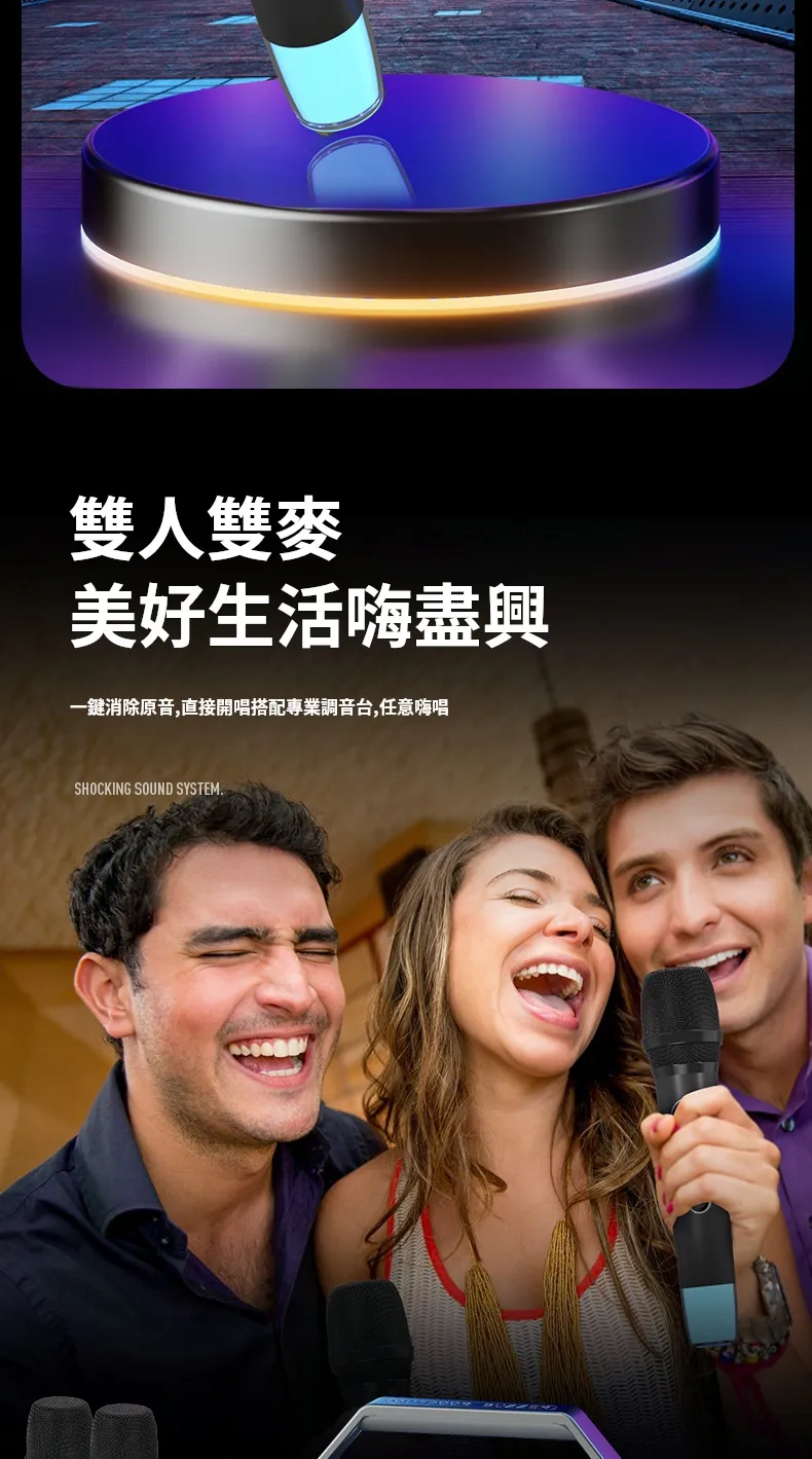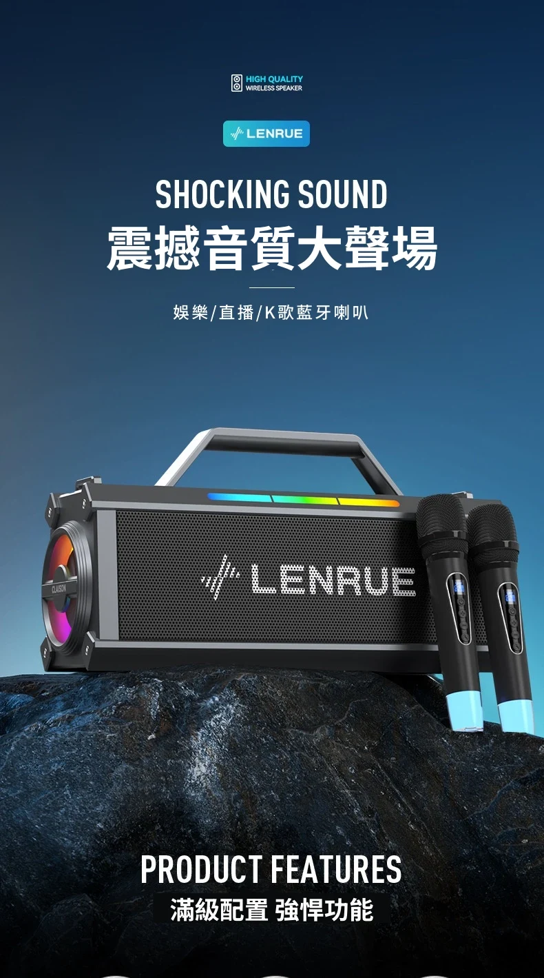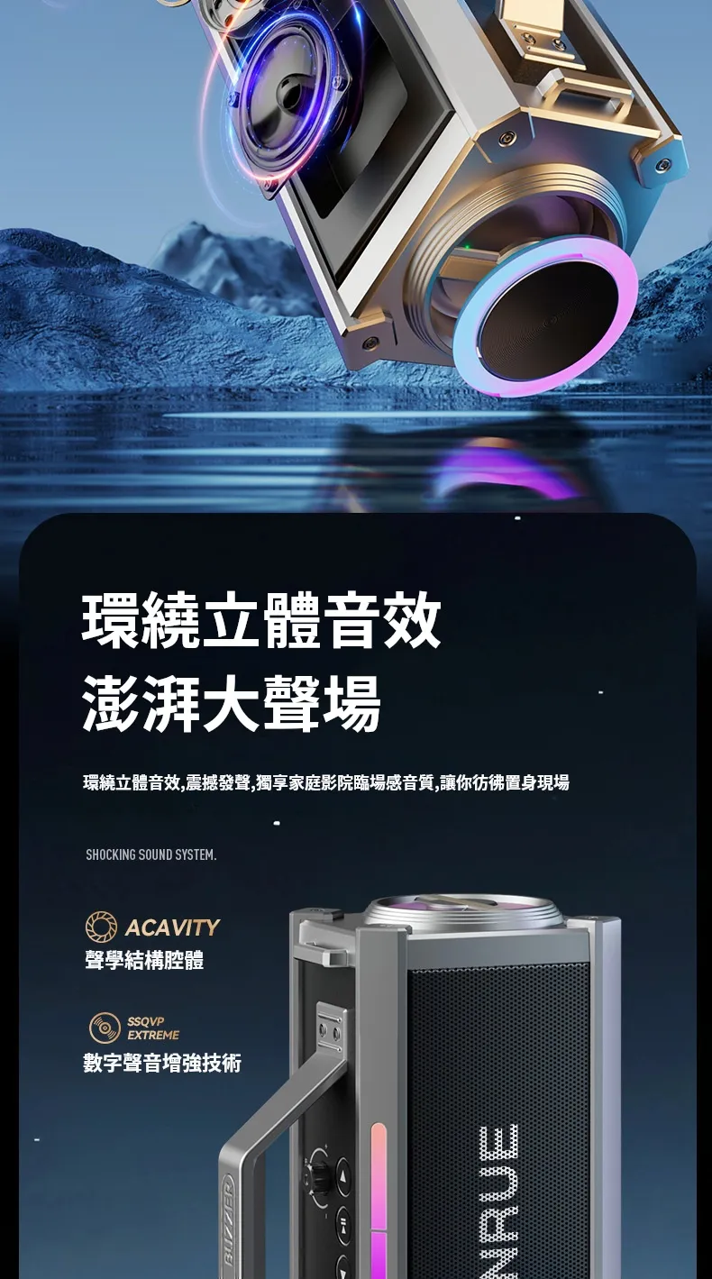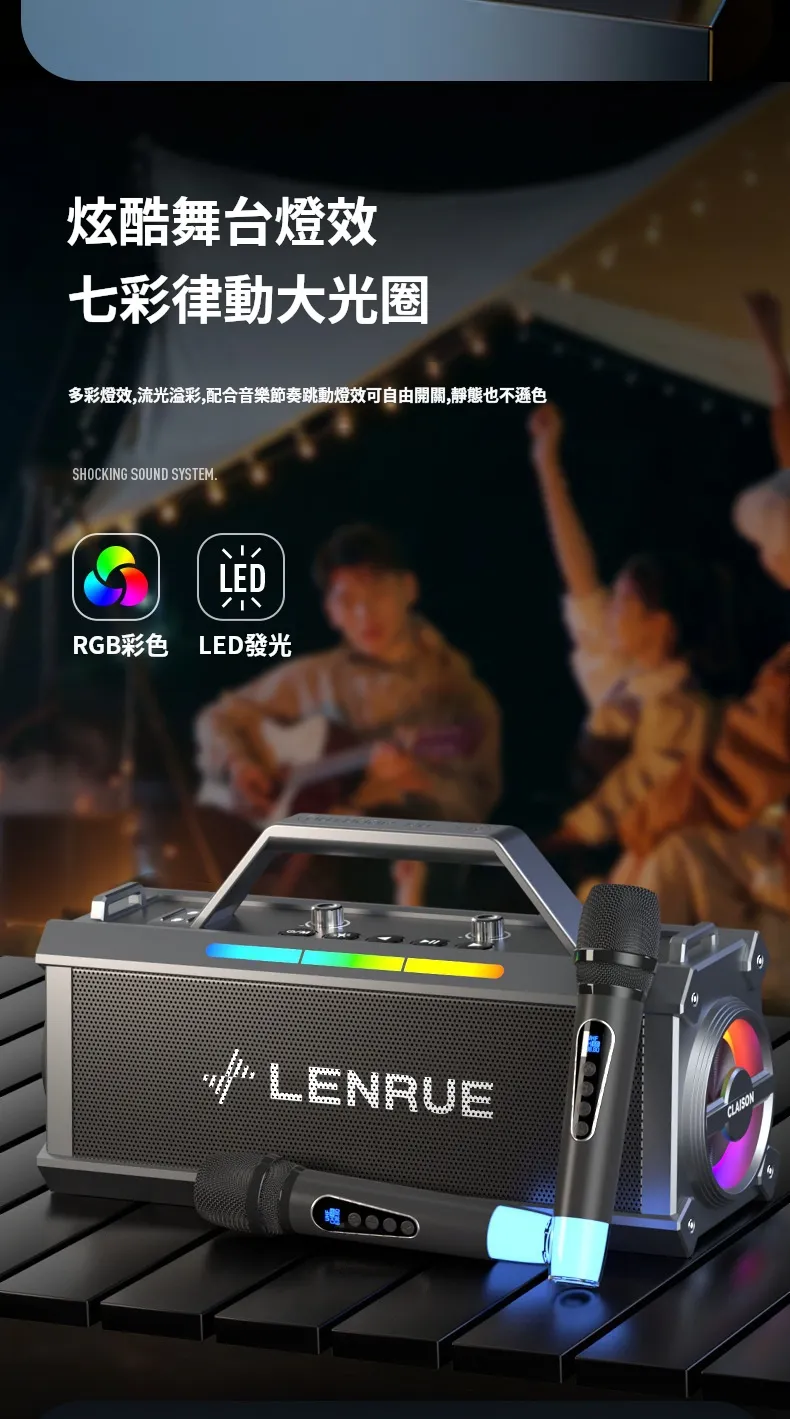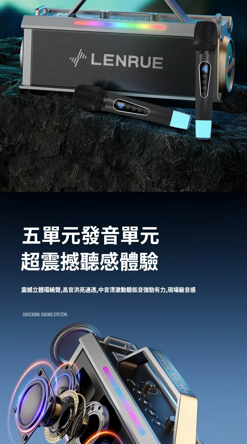 舞台級震撼大聲場無線藍芽喇叭麥克風套組 | 附送雙麥克風 | 五喇叭發聲單元 | 環繞立體澎湃音效 | DSP高保真音頻處理 | 七彩律動大光圈