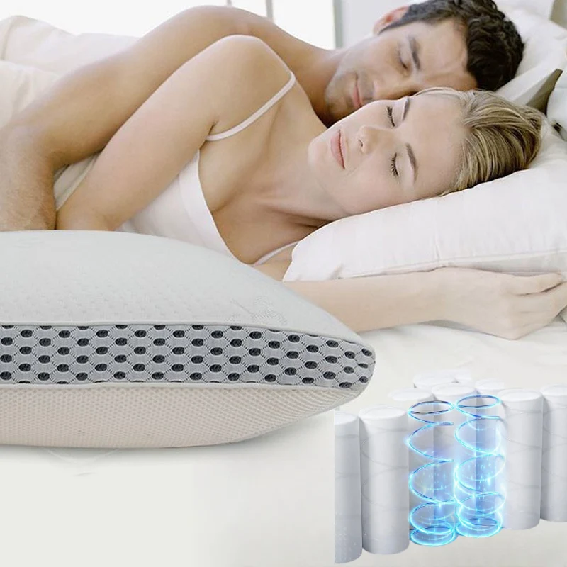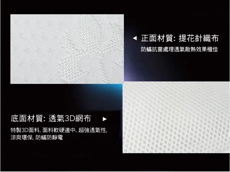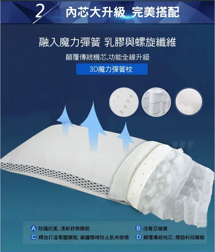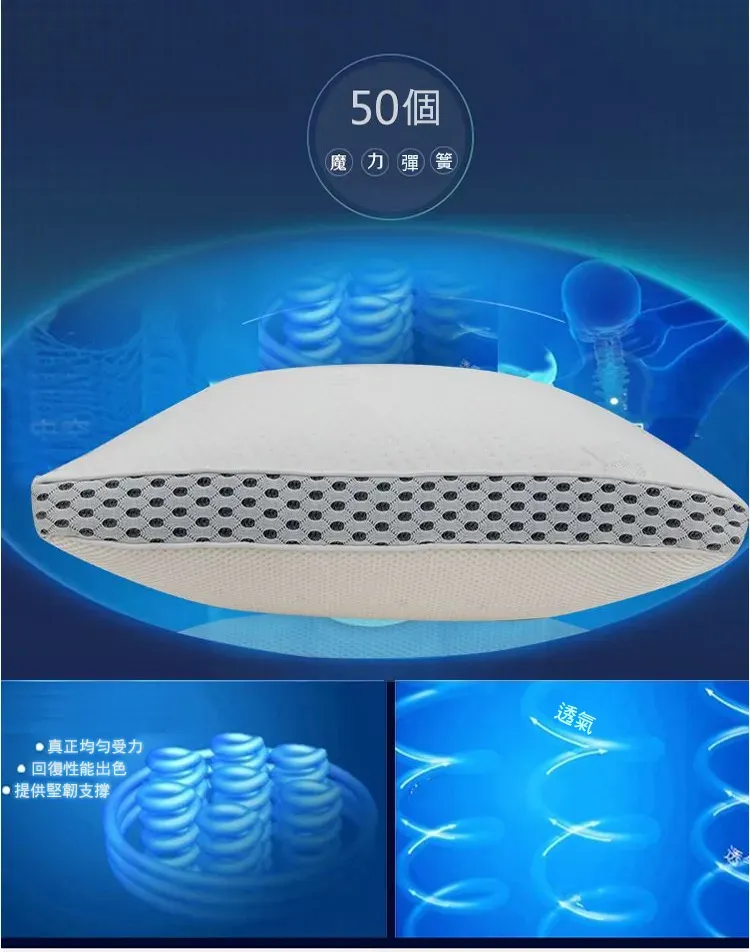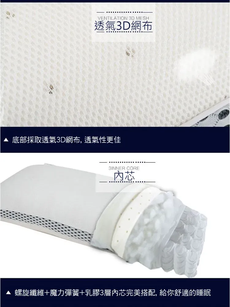 【枕芯材質】:50顆高規格精鋼獨立筒彈簧 + 泰國天然乳膠 + 螺旋纖維 + 3D透氣網布