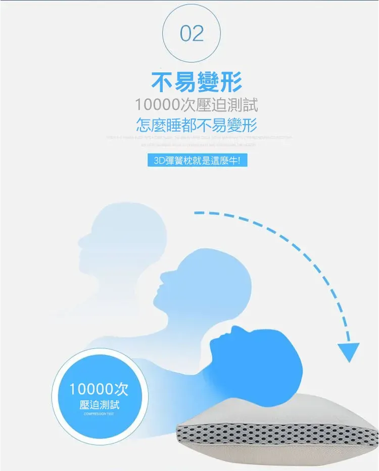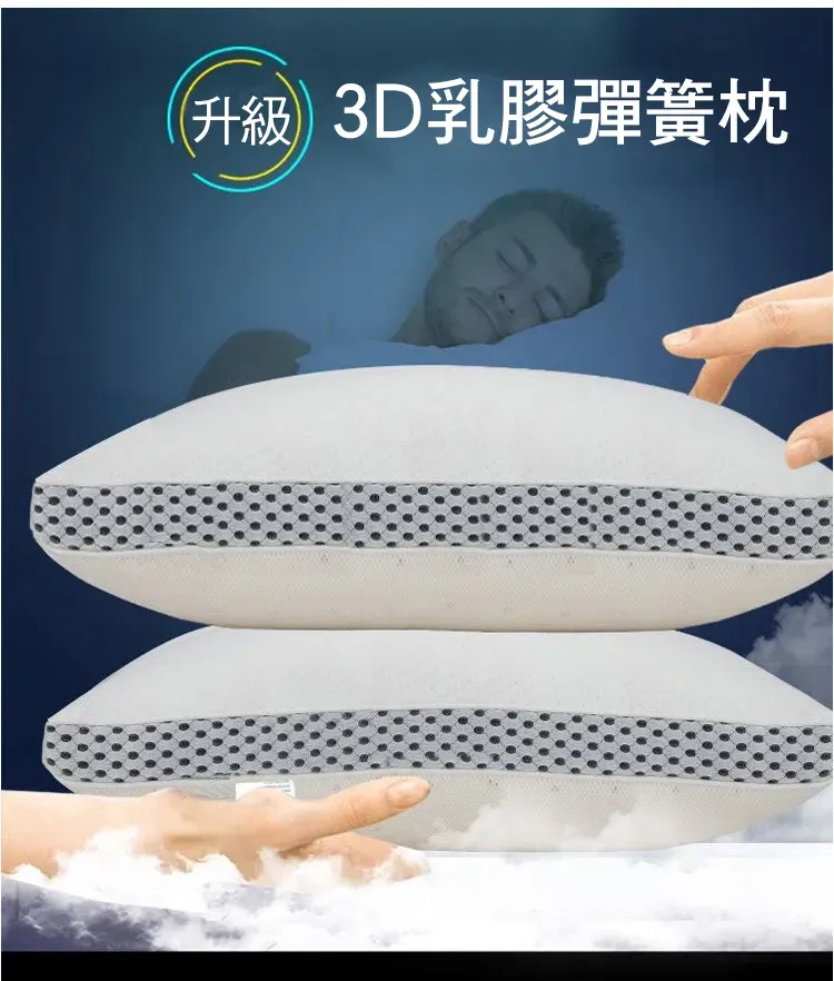 3D彈簧乳膠枕頭芯不可暴曬水洗,清理時只要將枕芯拍打後放置通風陰涼處24-48小時即可,可一個月清潔一次。
