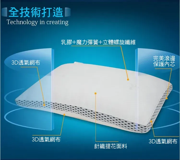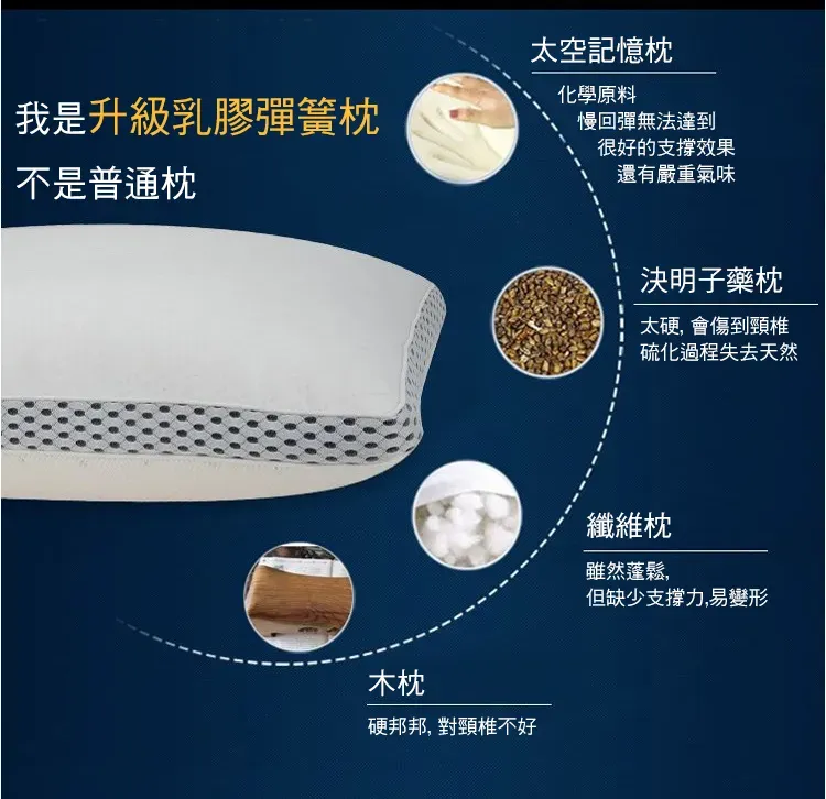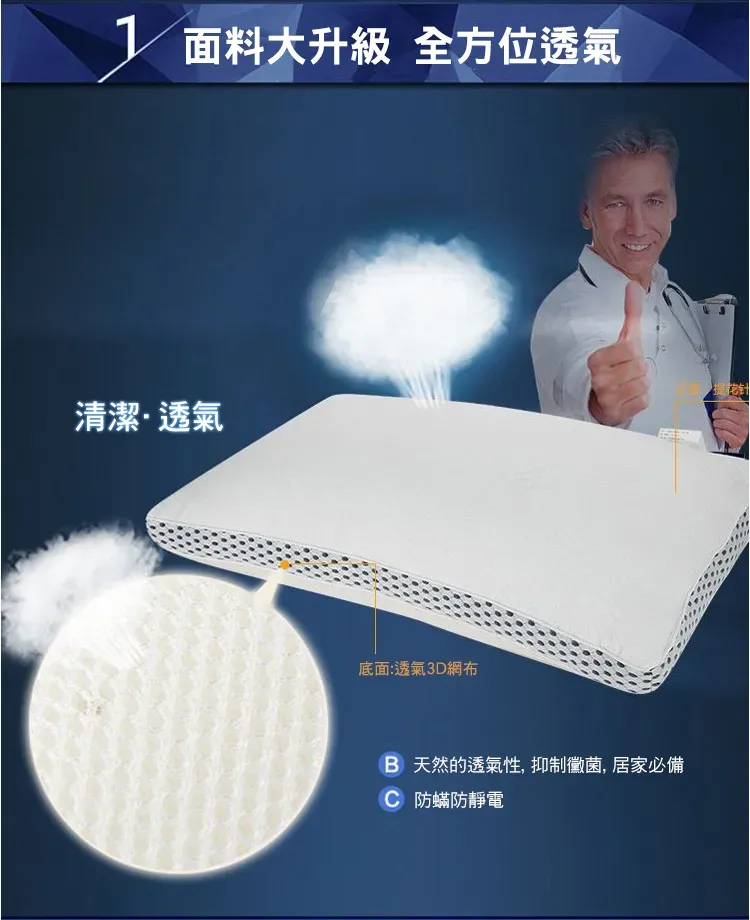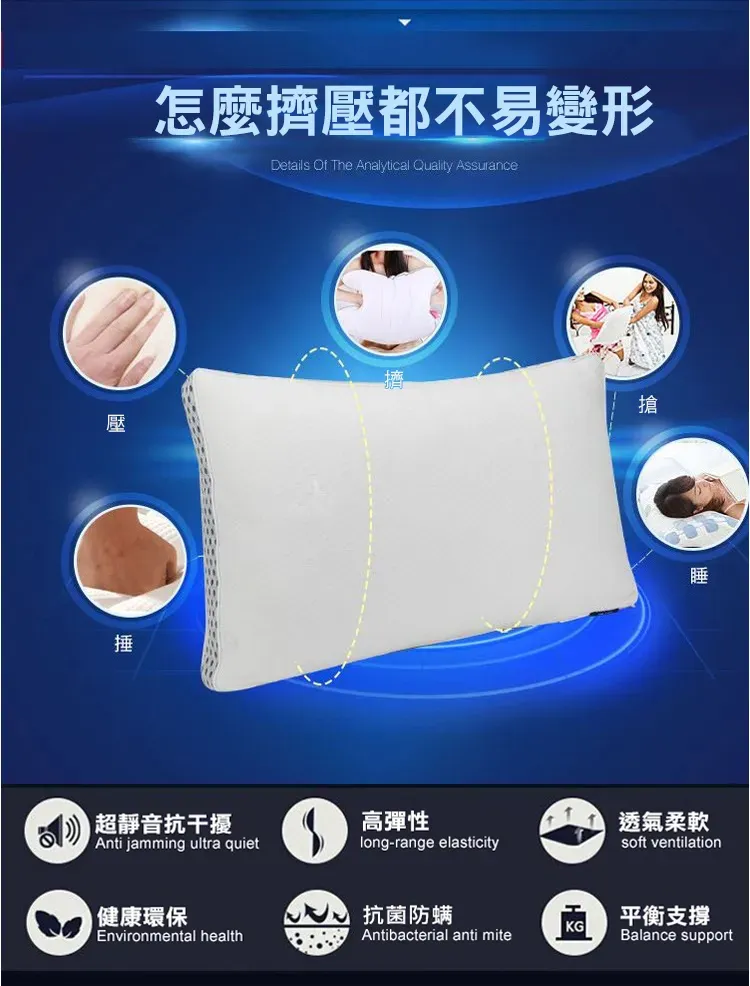本款乳膠獨立筒枕頭可媲美市面萬元級同類產品,具有透氣性和吸濕性,其獨特的柔軟觸覺和乳膠高彈性能夠順應身體輪廓,依托住人體脊椎,使您的脊椎形成最佳曲線。乳膠枕頭傳統型形狀適合習慣了長年使用傳統枕頭的使用者。乳膠枕頭不僅更符合了長久的睡眠習慣,更讓天然乳膠枕帶給使用者健康舒適的睡眠。
