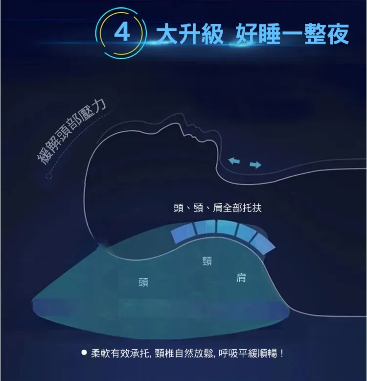 2.使用初期建議把頭放在枕頭中間,頸部放在枕頭最高處,不留縫隙,幾天後就會明顯感覺頸部放松。