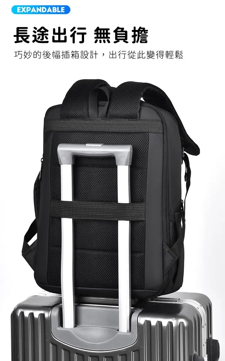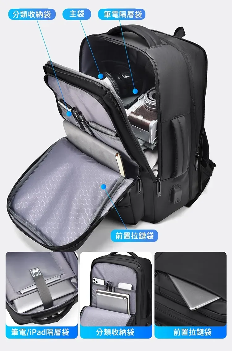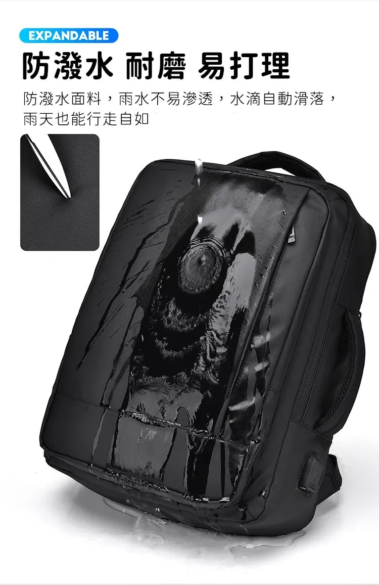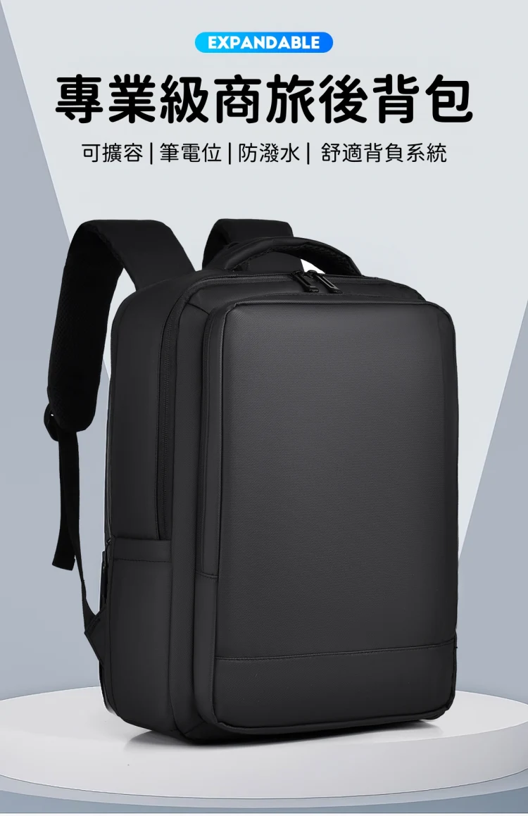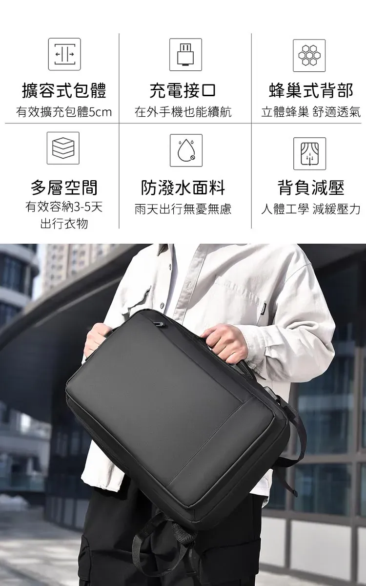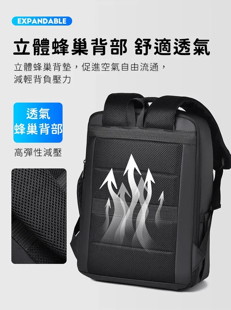 專業級商旅後背包 | 擴容式包體設計 | 人體工學背負減壓 | 外置USB線纜接口 | 耐磨防潑水面料 | 立體透氣蜂巢背部 | 商務休閒通勤男士雙肩後背包