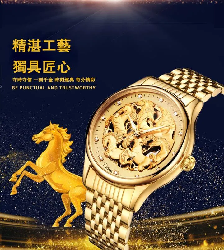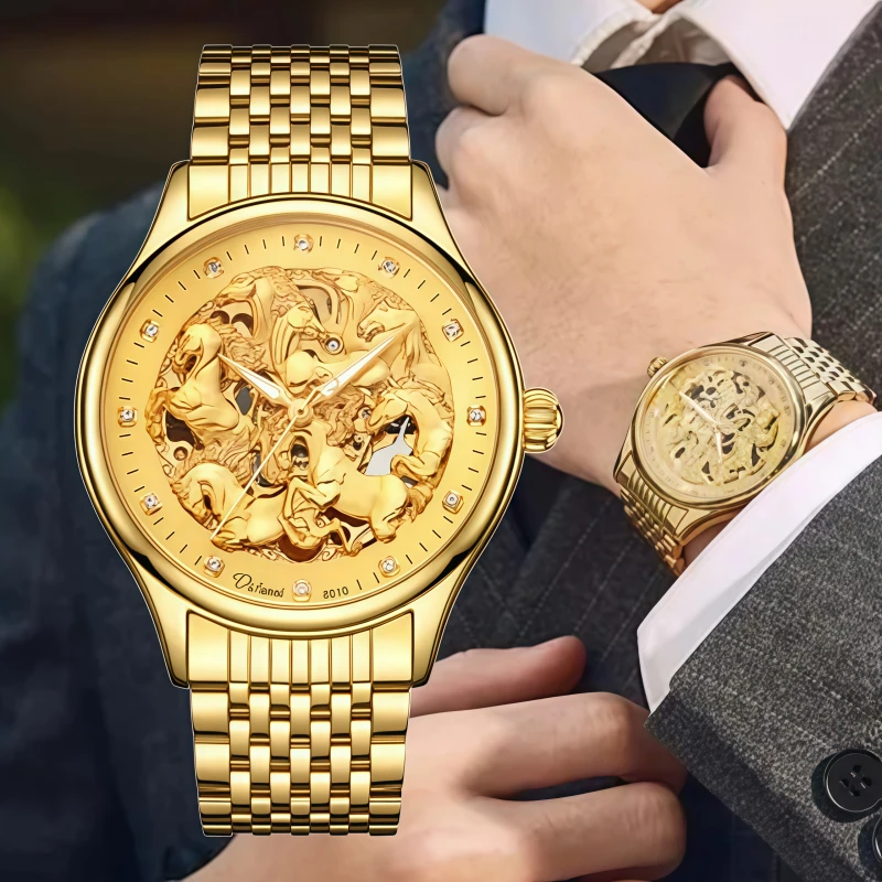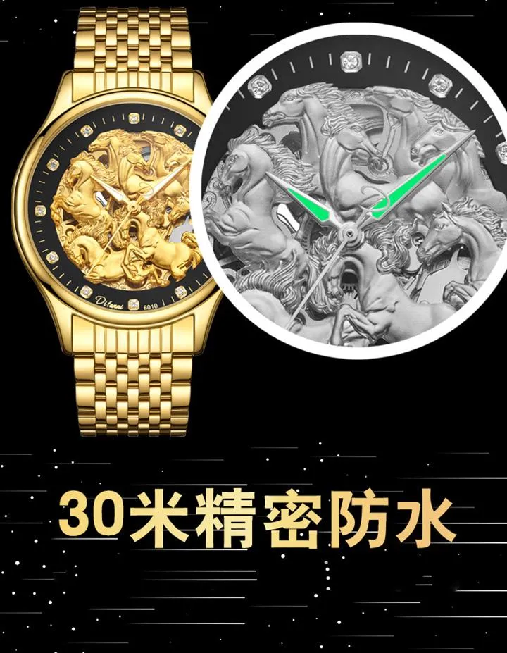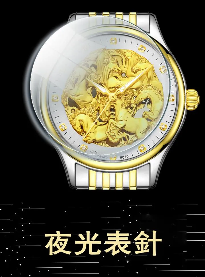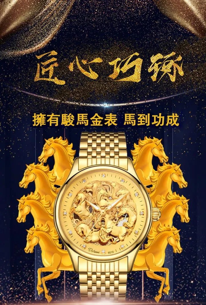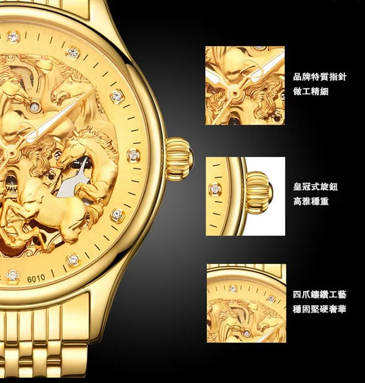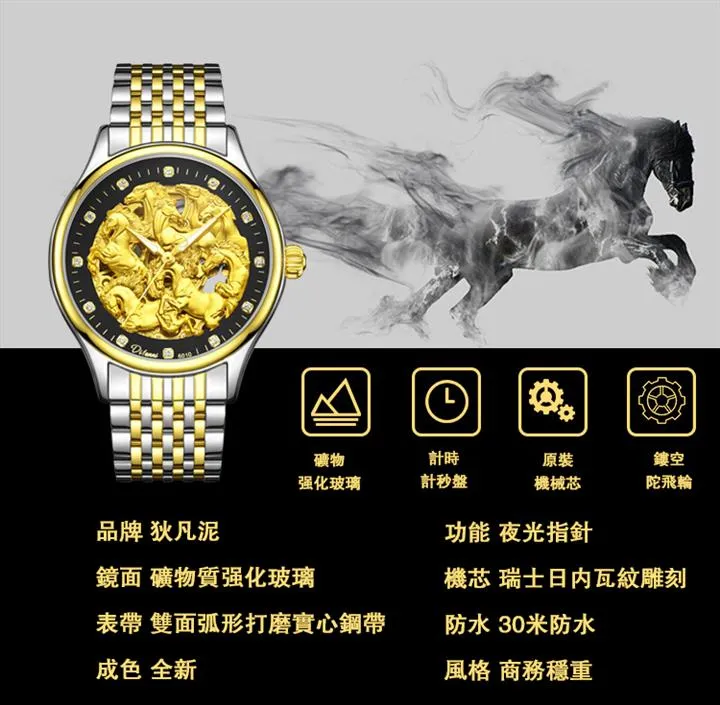 男錶・機械・駿馬奔騰 | 全自動機械機芯 | 駿馬浮雕錶盤 | 精鋼鍍金錶帶 | 閃鑽刻度 | 強視夜光 | 30米防水 | TEVISE男士全自動機械手錶