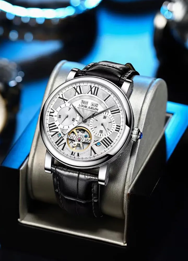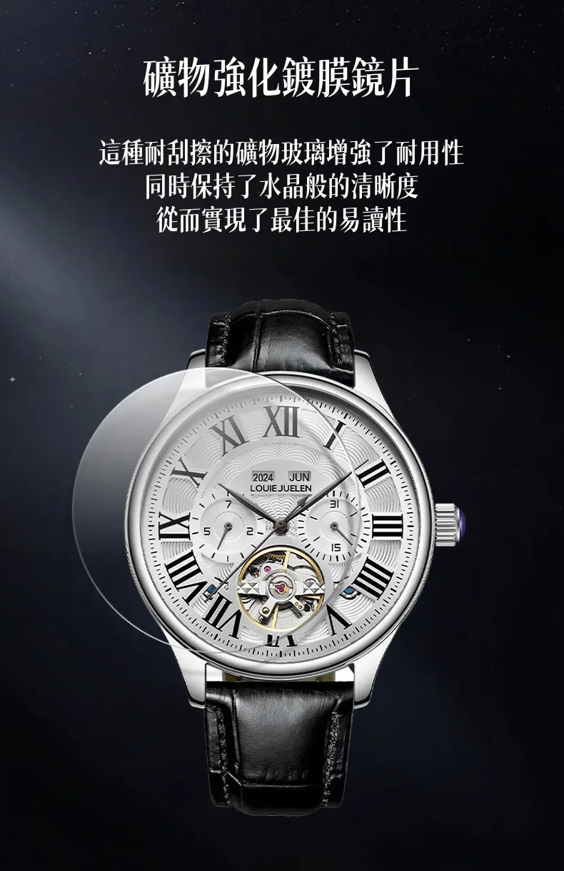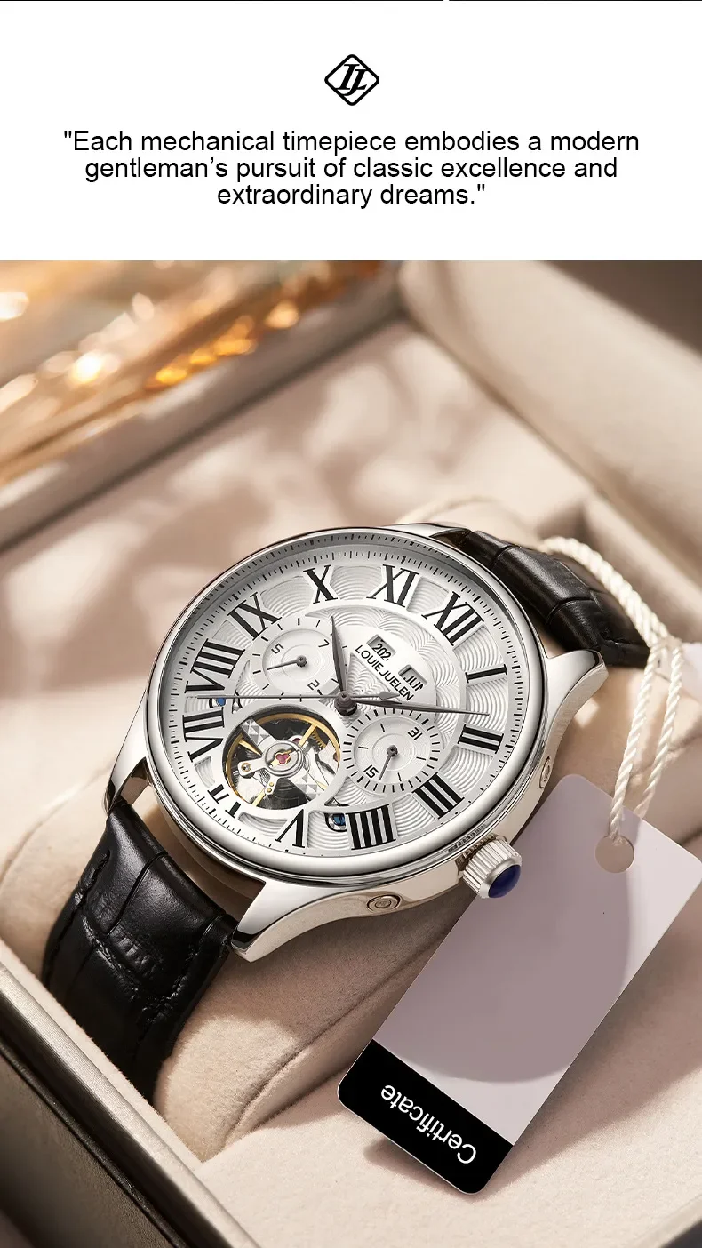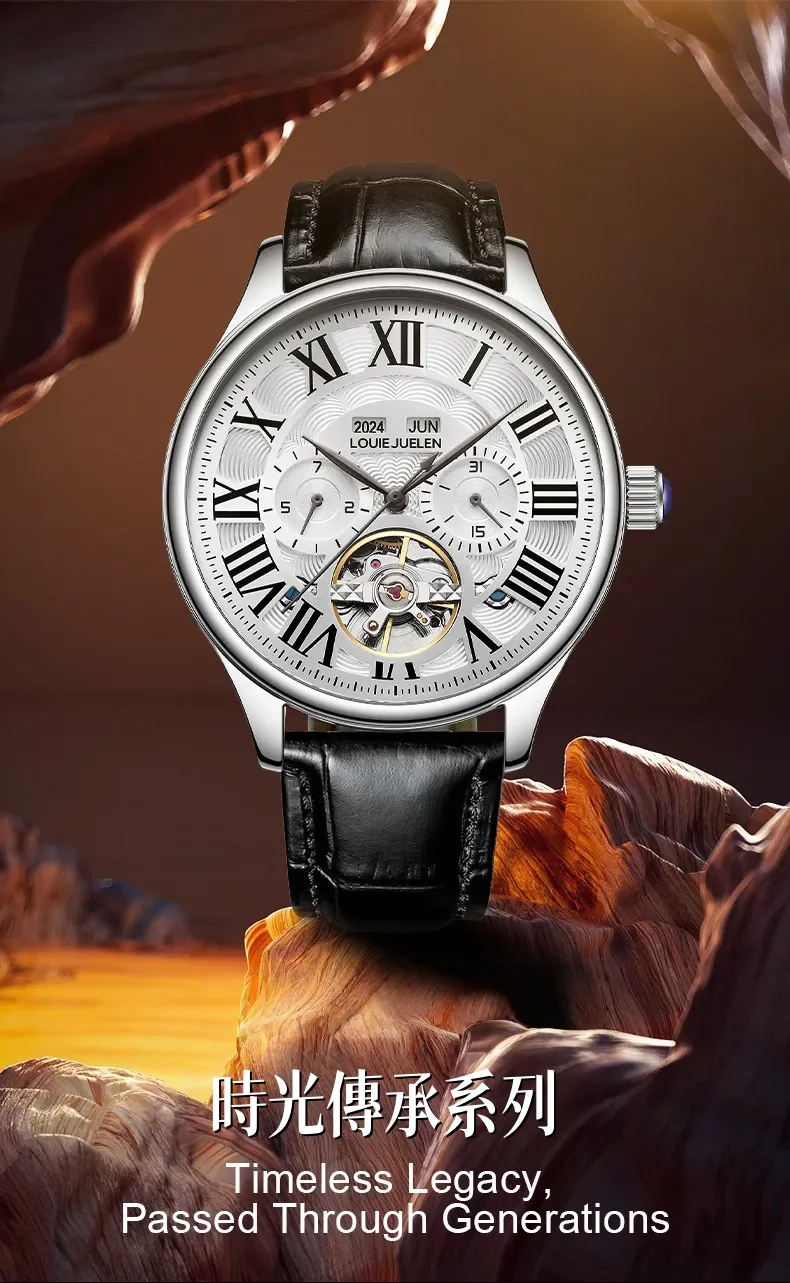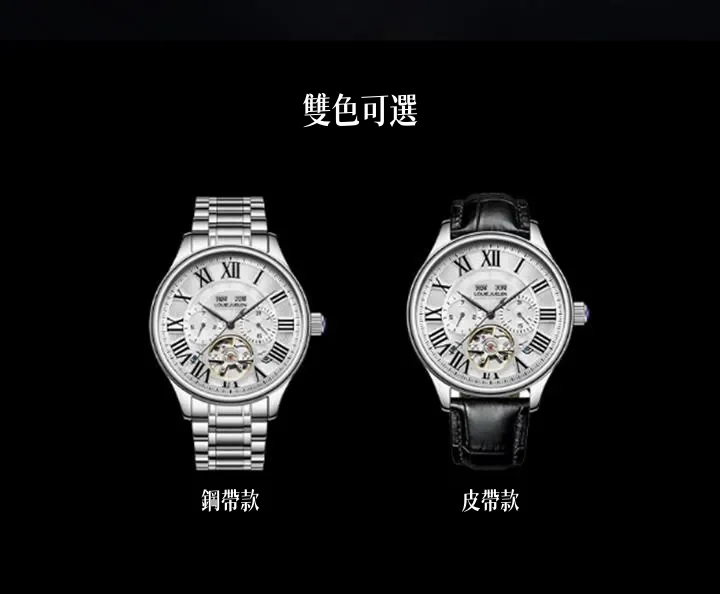 男錶・機械・時光傳承 | 全自動機械機芯 | 鏤空飛輪錶盤 | 年月日計時 | 古典羅馬刻度 | 強視夜光 | 30米防水 | LOUIE JUELEN高級男士機械錶