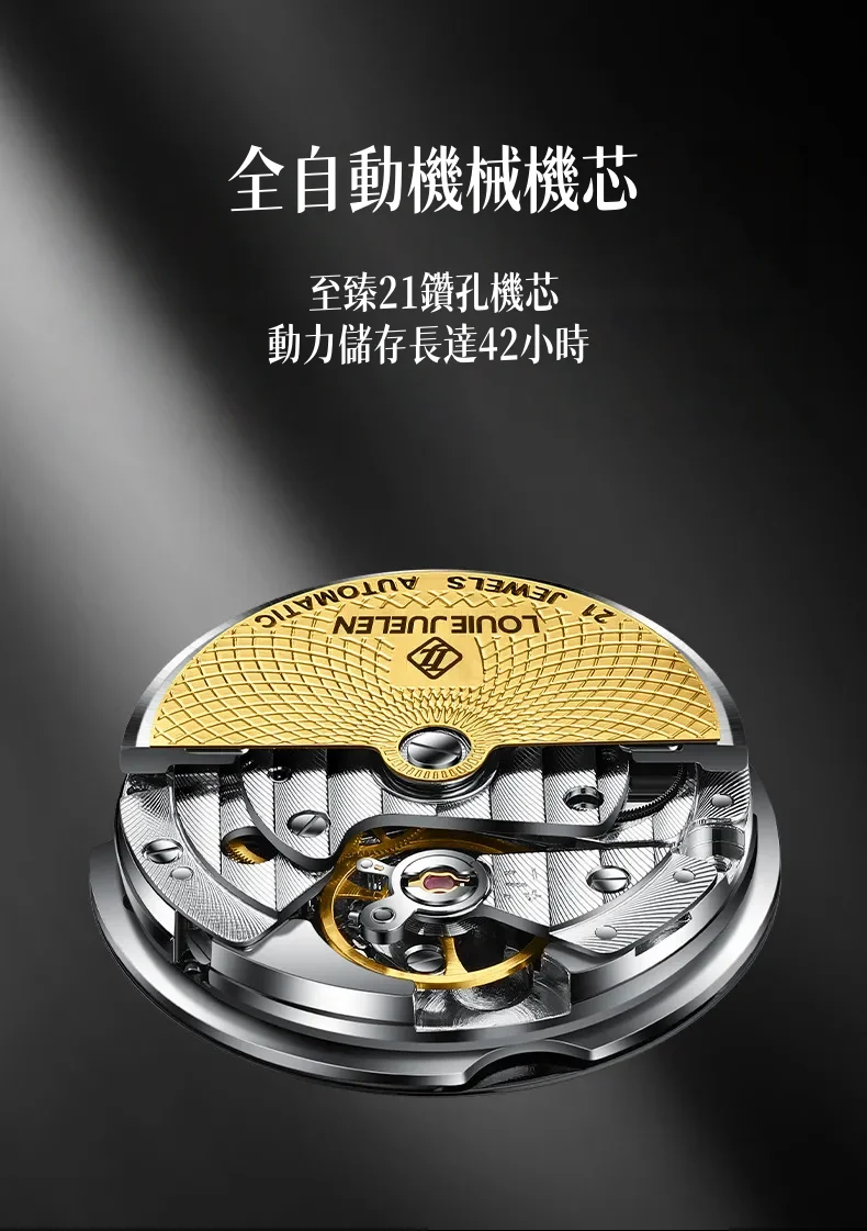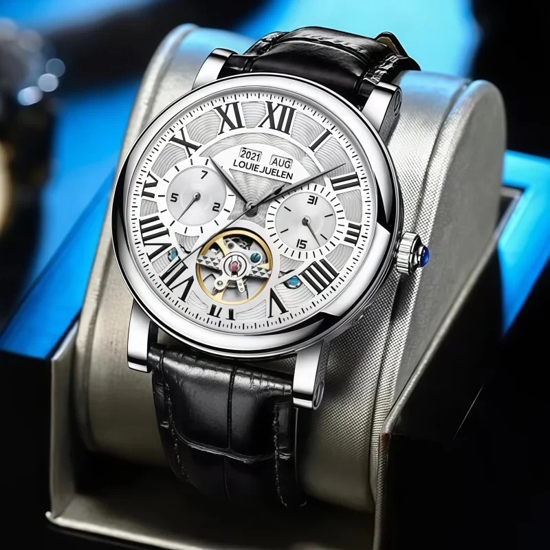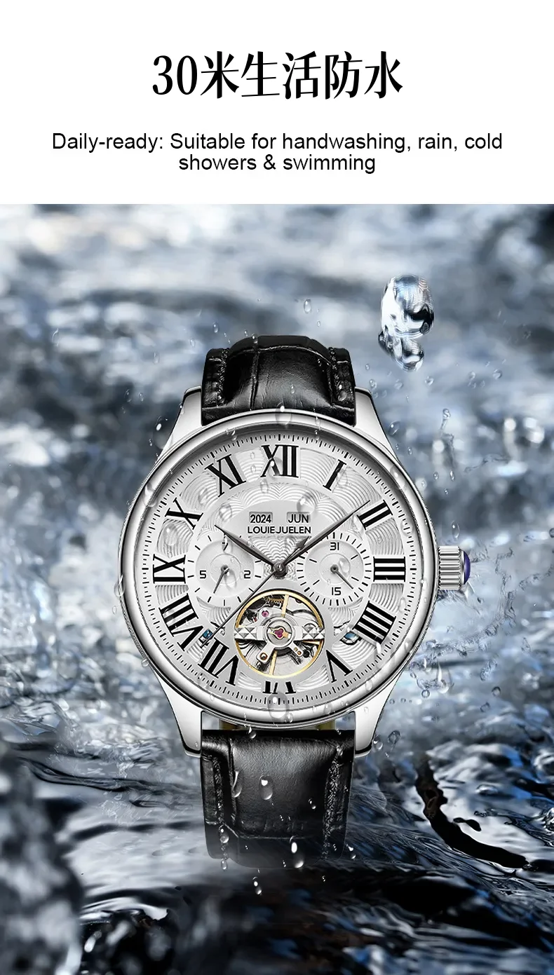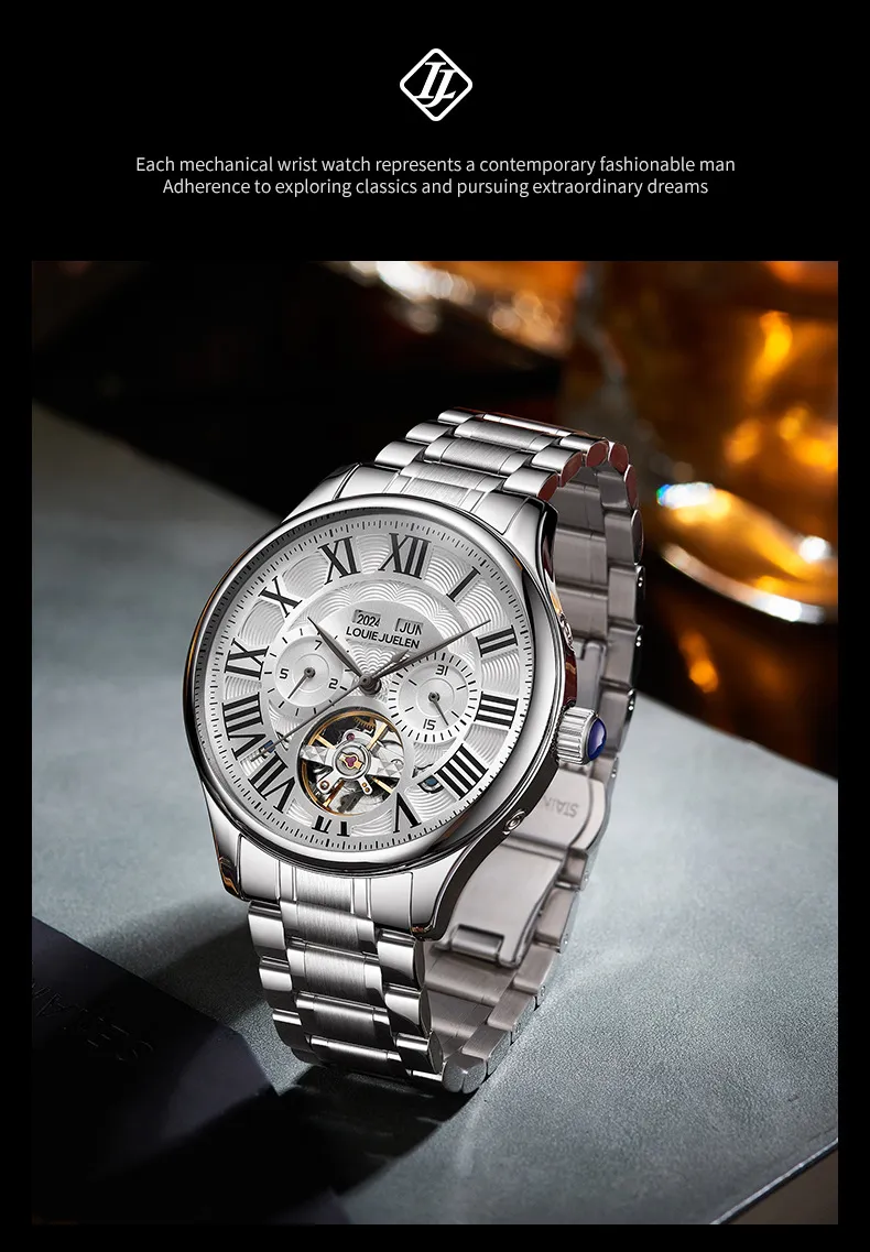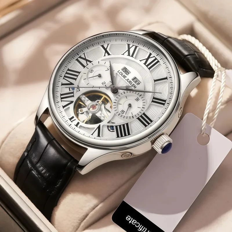 男錶・機械・時光傳承 | 全自動機械機芯 | 鏤空飛輪錶盤 | 年月日計時 | 古典羅馬刻度 | 強視夜光 | 30米防水 | LOUIE JUELEN高級男士機械錶