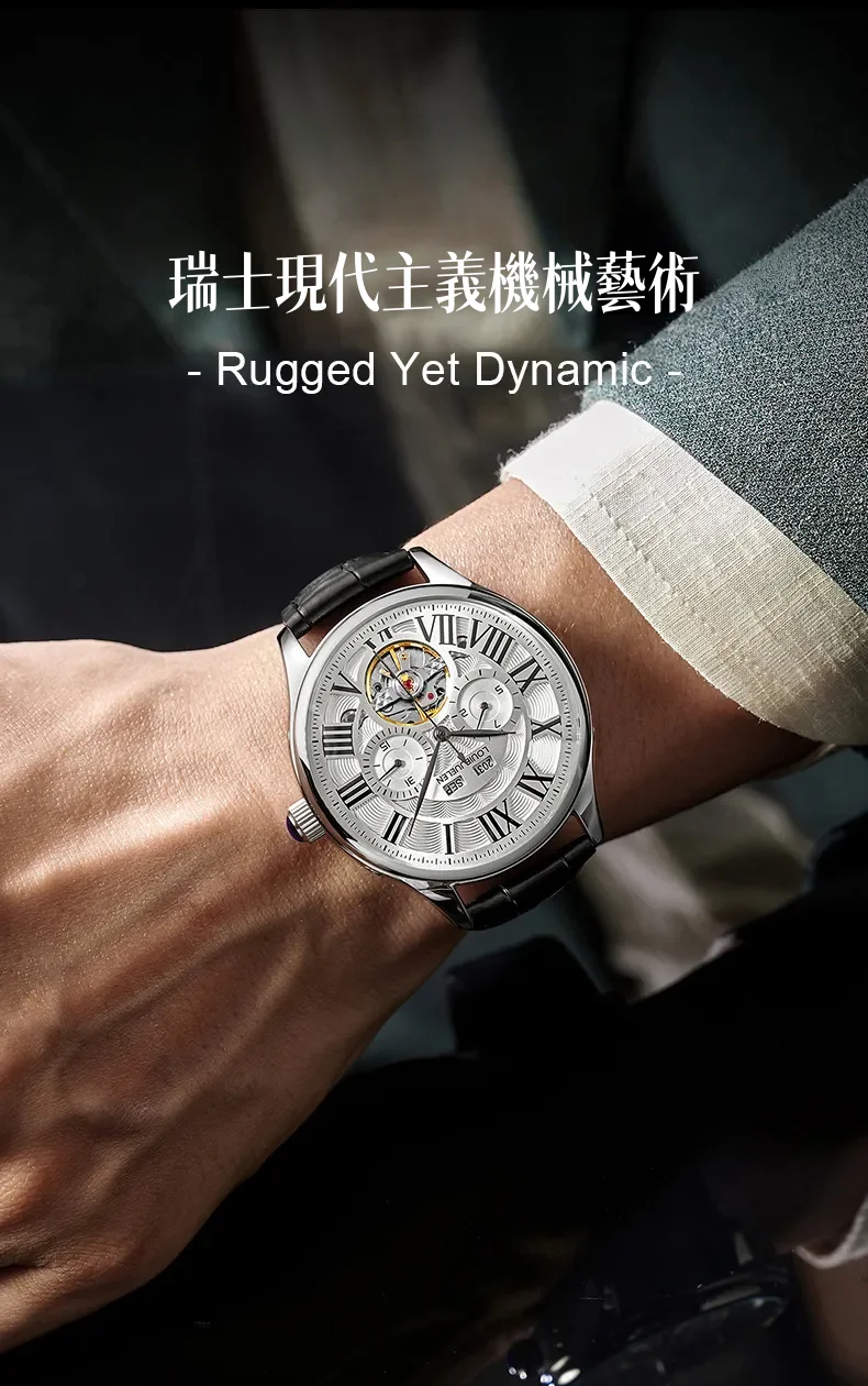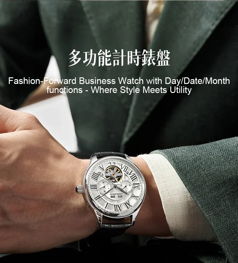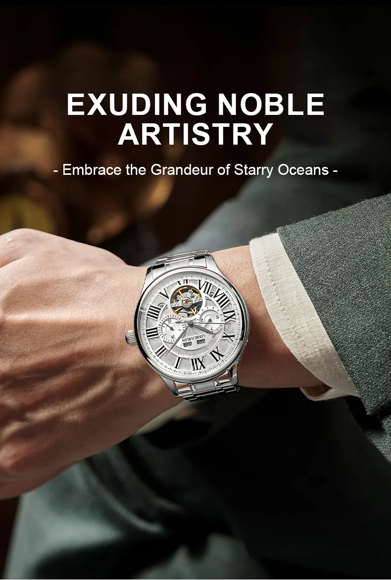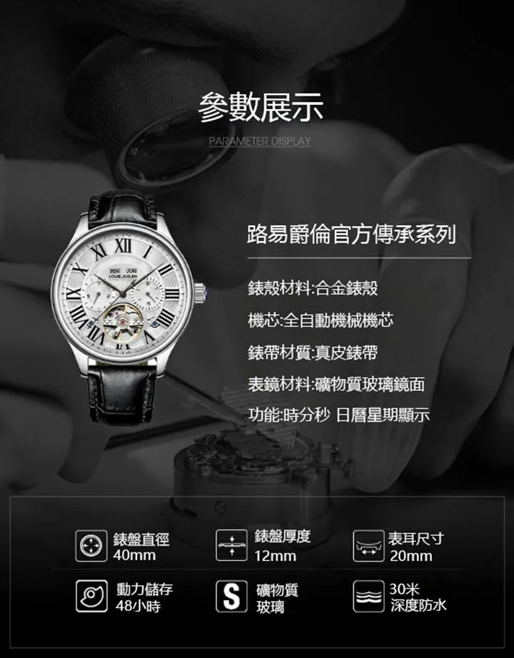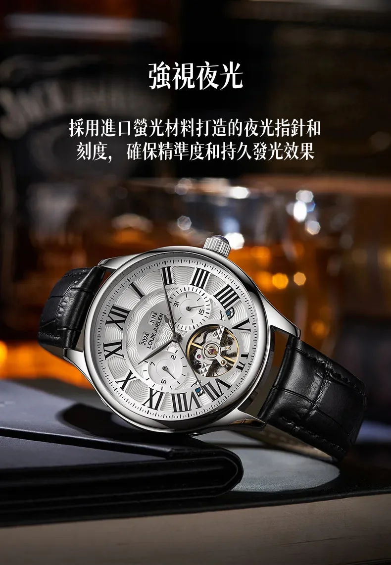 男錶・機械・時光傳承 | 全自動機械機芯 | 鏤空飛輪錶盤 | 年月日計時 | 古典羅馬刻度 | 強視夜光 | 30米防水 | LOUIE JUELEN高級男士機械錶