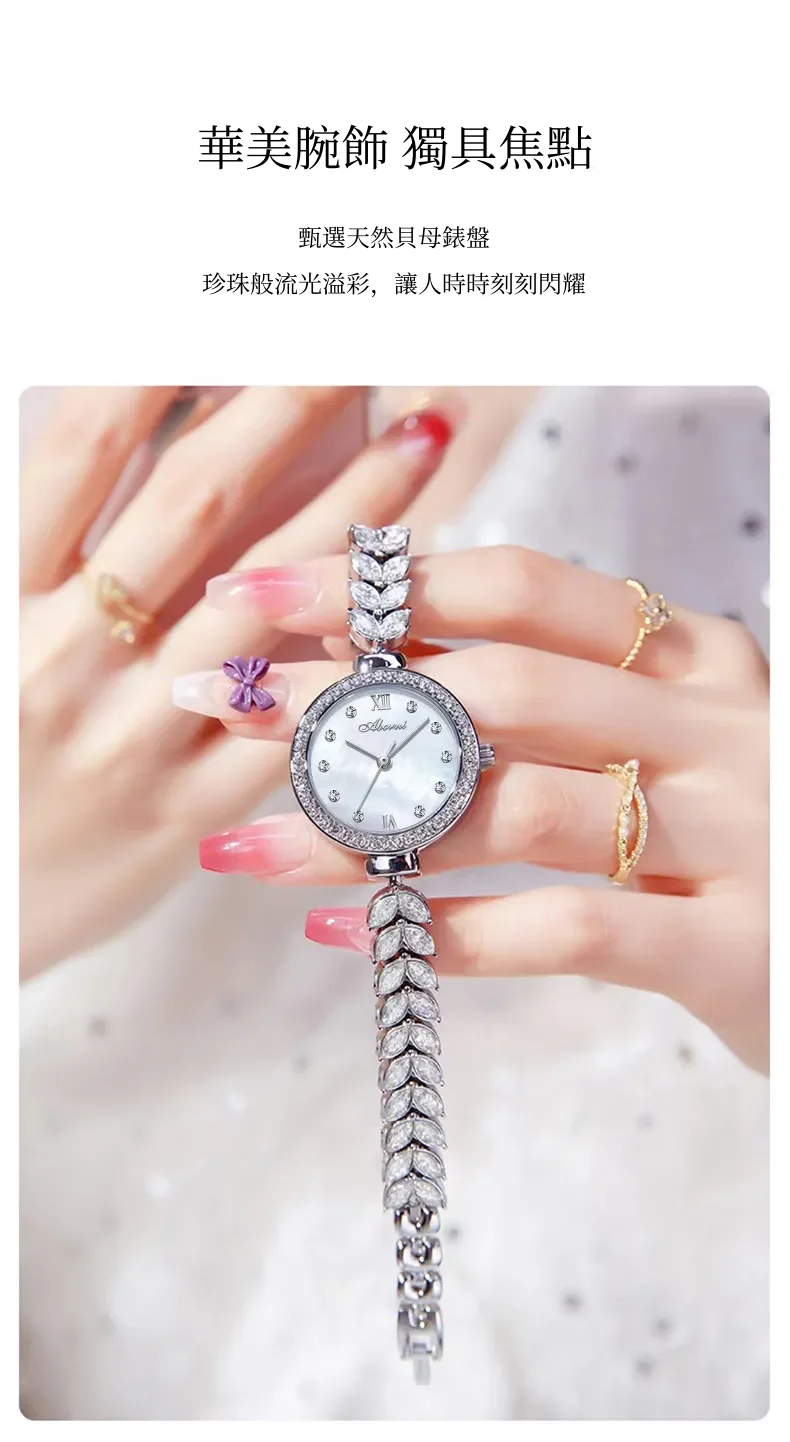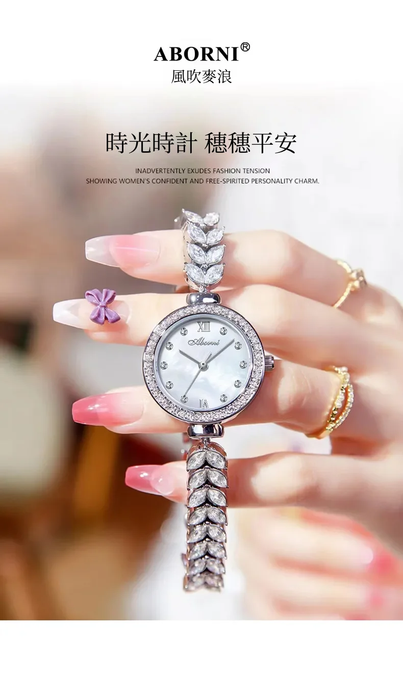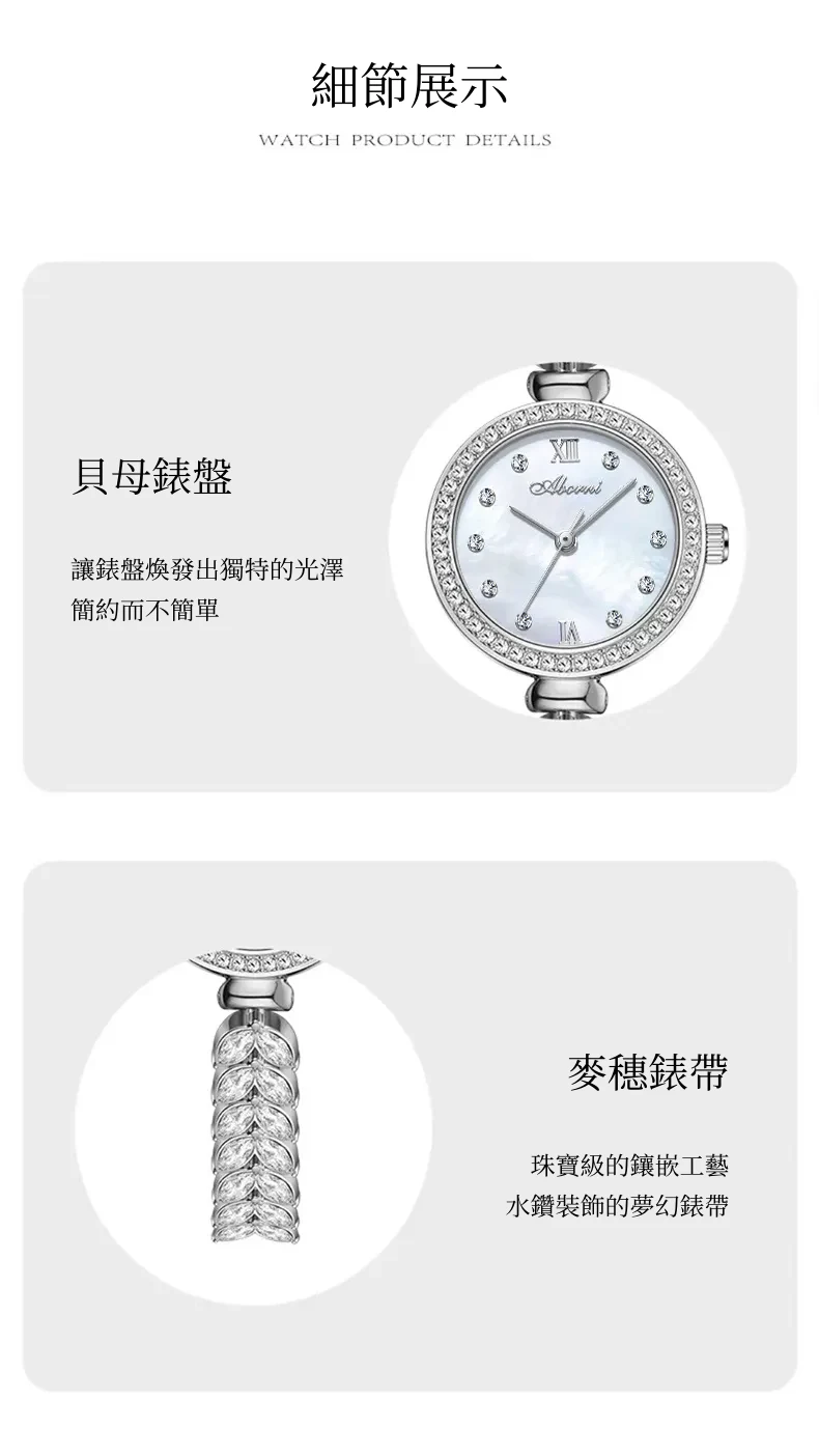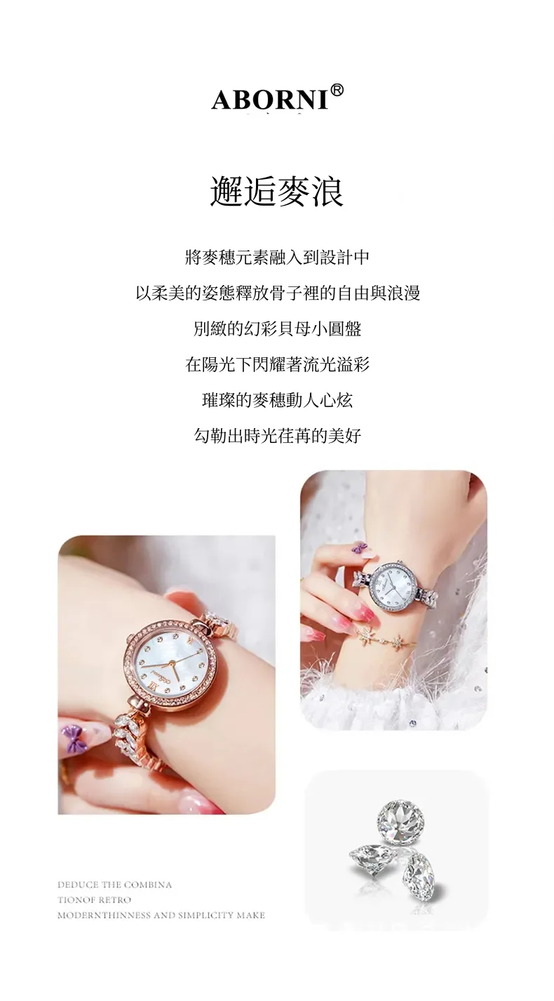 女錶・風吹麥浪 | 幻彩貝母小錶盤 | 麥穗造型精鋼鑲鑽錶帶 | 高級石英機芯 | 30米防水 | ABORNI高級女士時裝腕錶