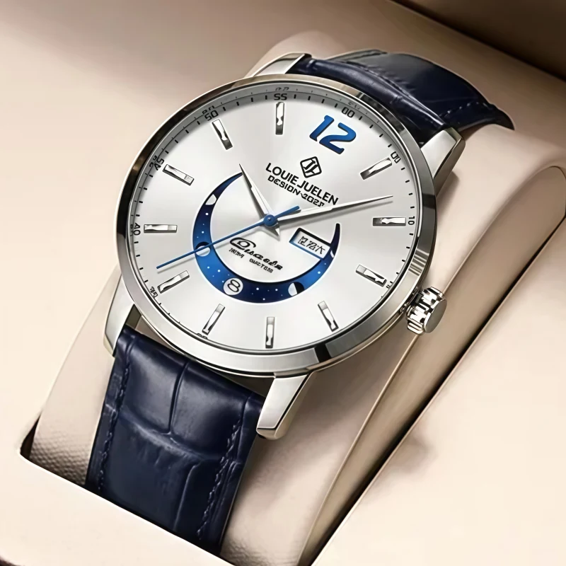 男錶・心月之痕 | 藍月主題錶盤 | 星期日曆雙歷視窗 | 小牛皮錶帶 | 礦物鍍膜錶鏡 | 高清夜光 | 30米防水 | 瑞士LOUIE JUELEN高級男士手錶