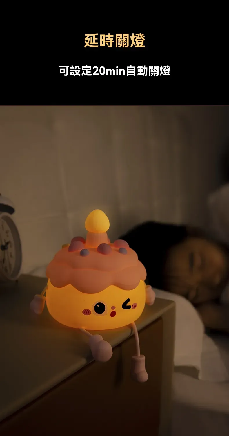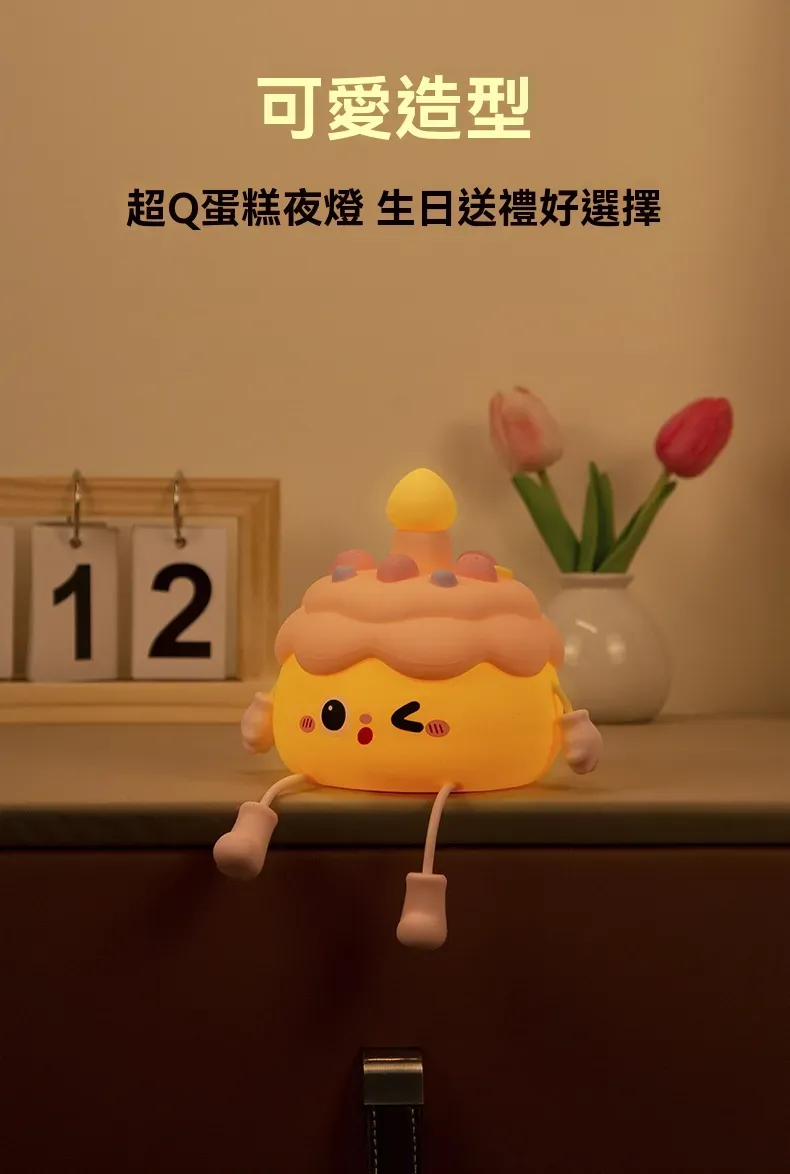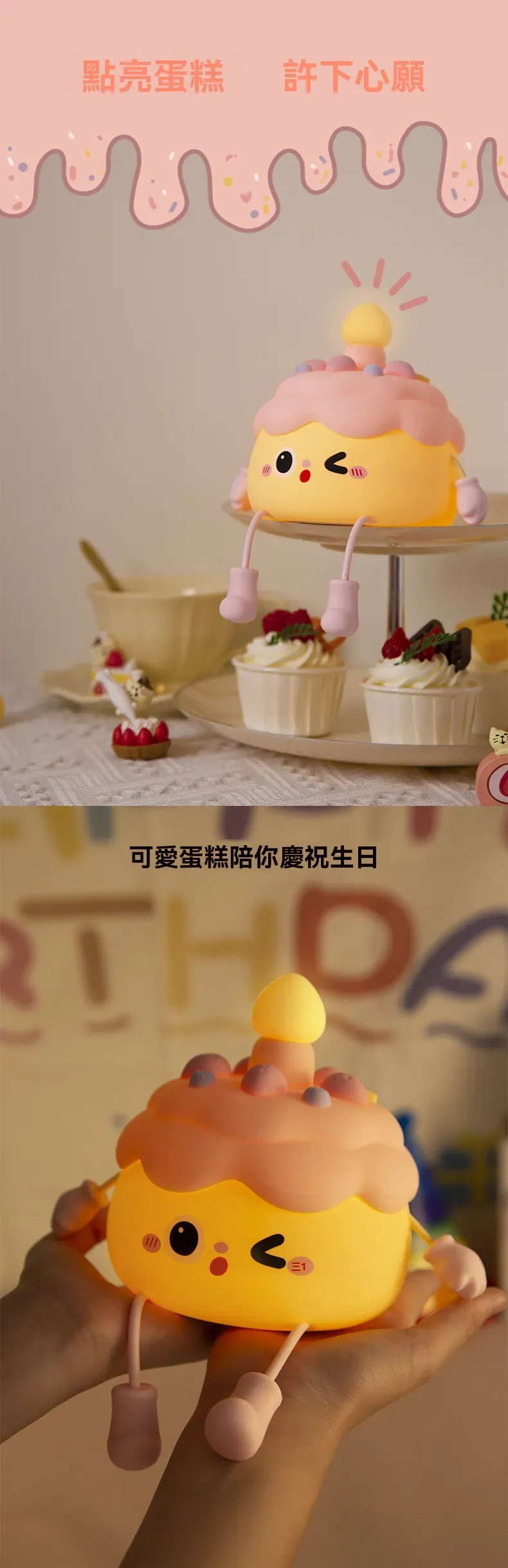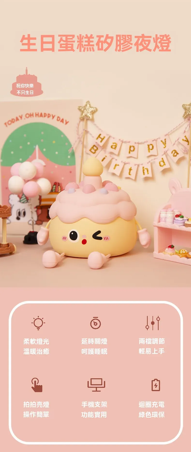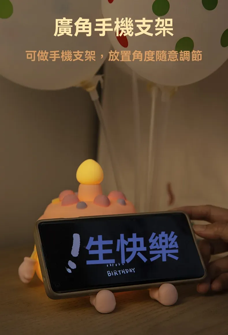 祝妳快樂・不只生日 | 超萌生日蛋糕晚安伴睡燈 | 64小時持續點亮 | 護眼柔光強弱可調 | 拍拍亮燈延時關燈 | 軟糯矽膠親膚舒適 | 可做手機支架