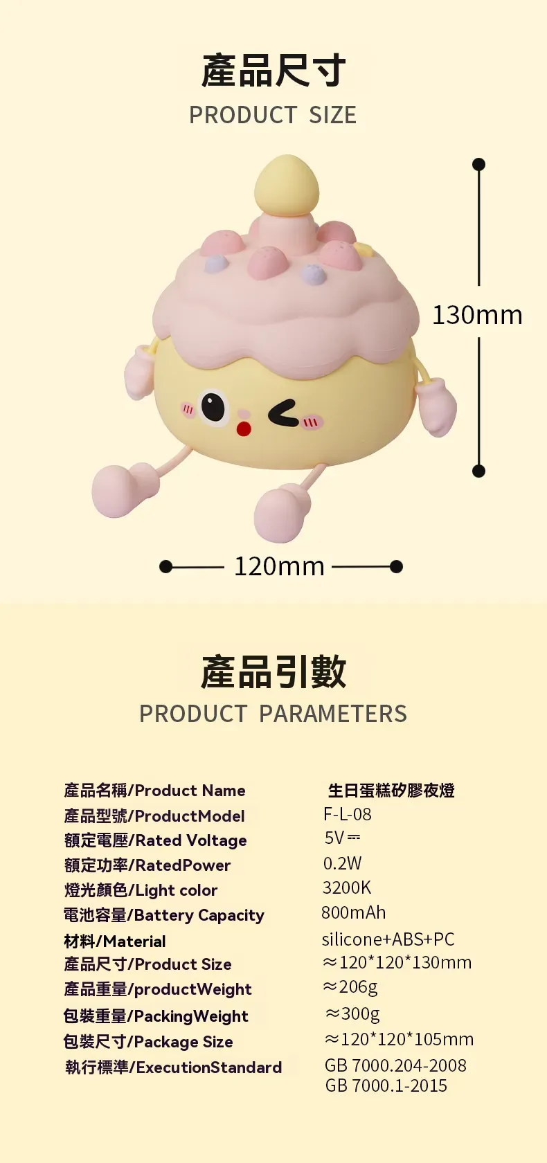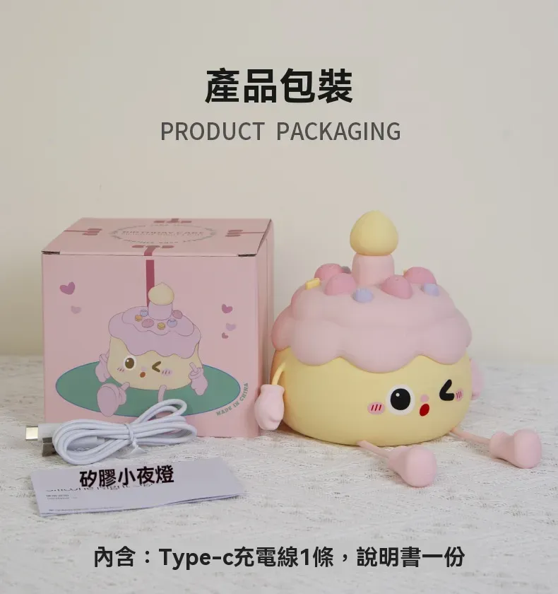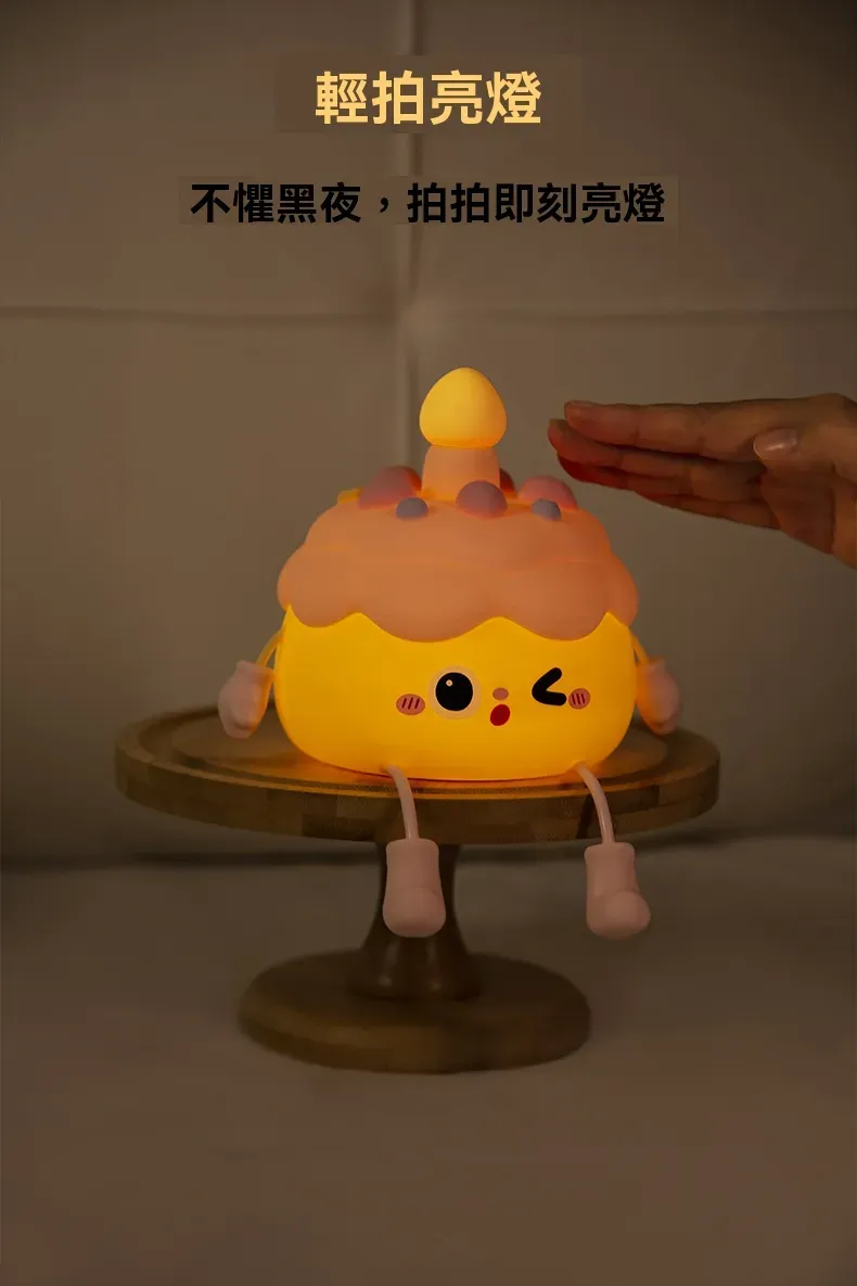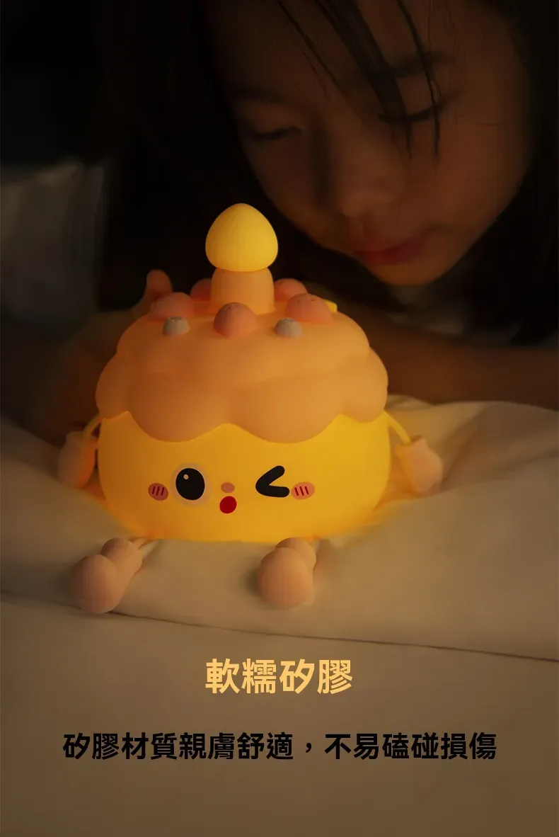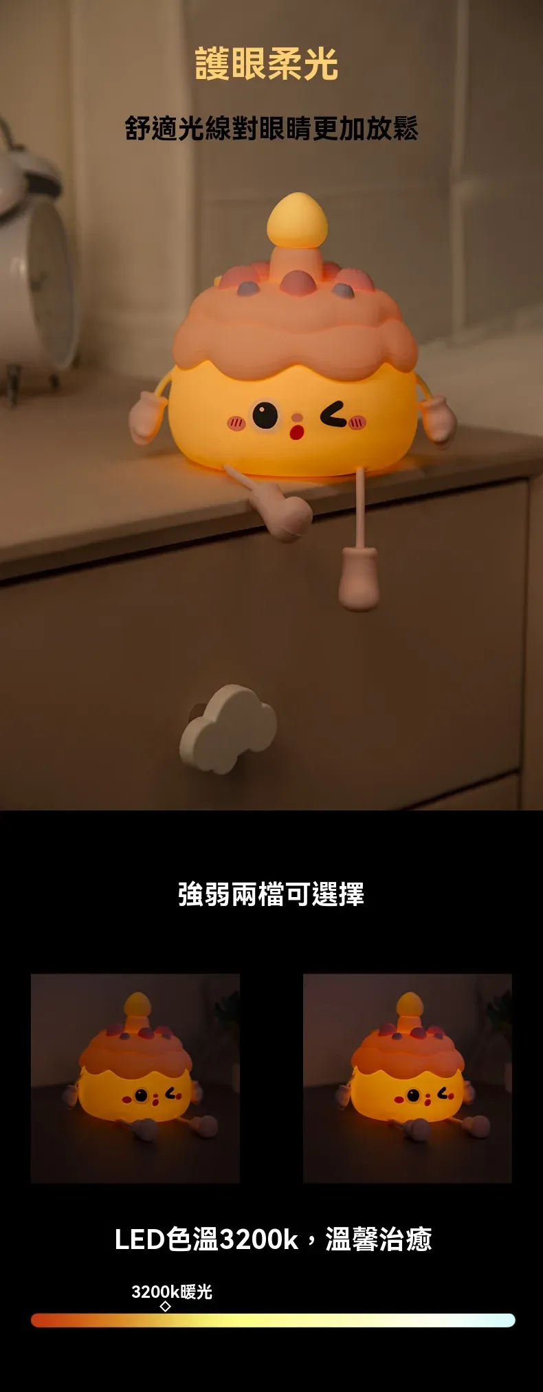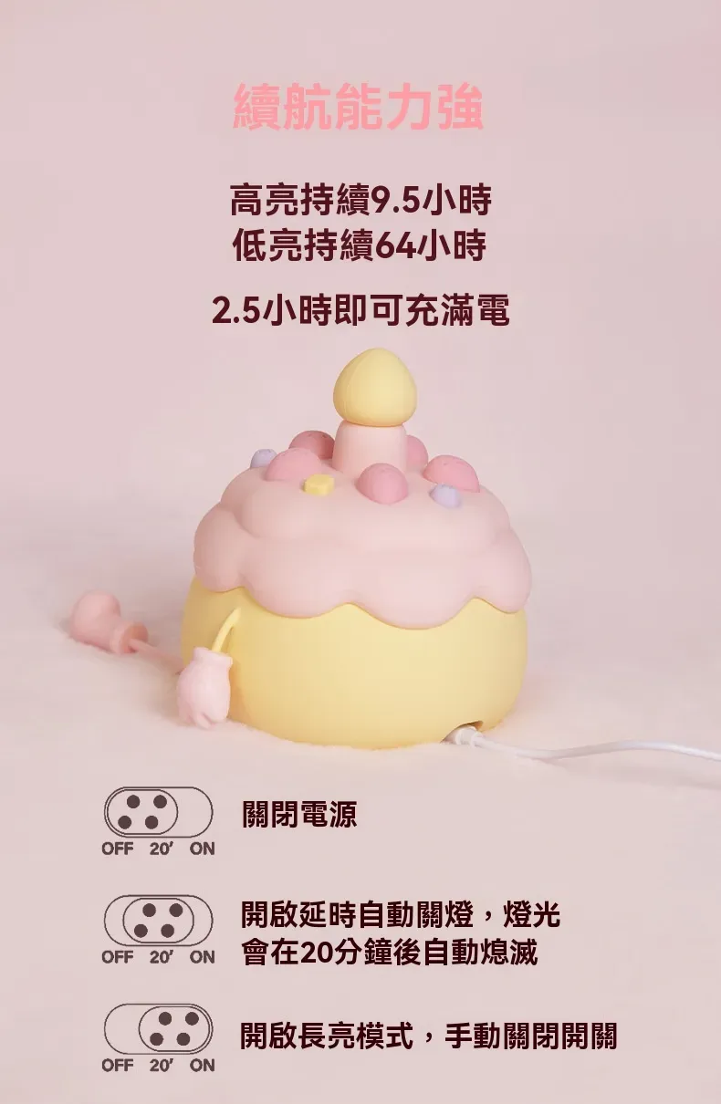 祝妳快樂・不只生日 | 超萌生日蛋糕晚安伴睡燈 | 64小時持續點亮 | 護眼柔光強弱可調 | 拍拍亮燈延時關燈 | 軟糯矽膠親膚舒適 | 可做手機支架