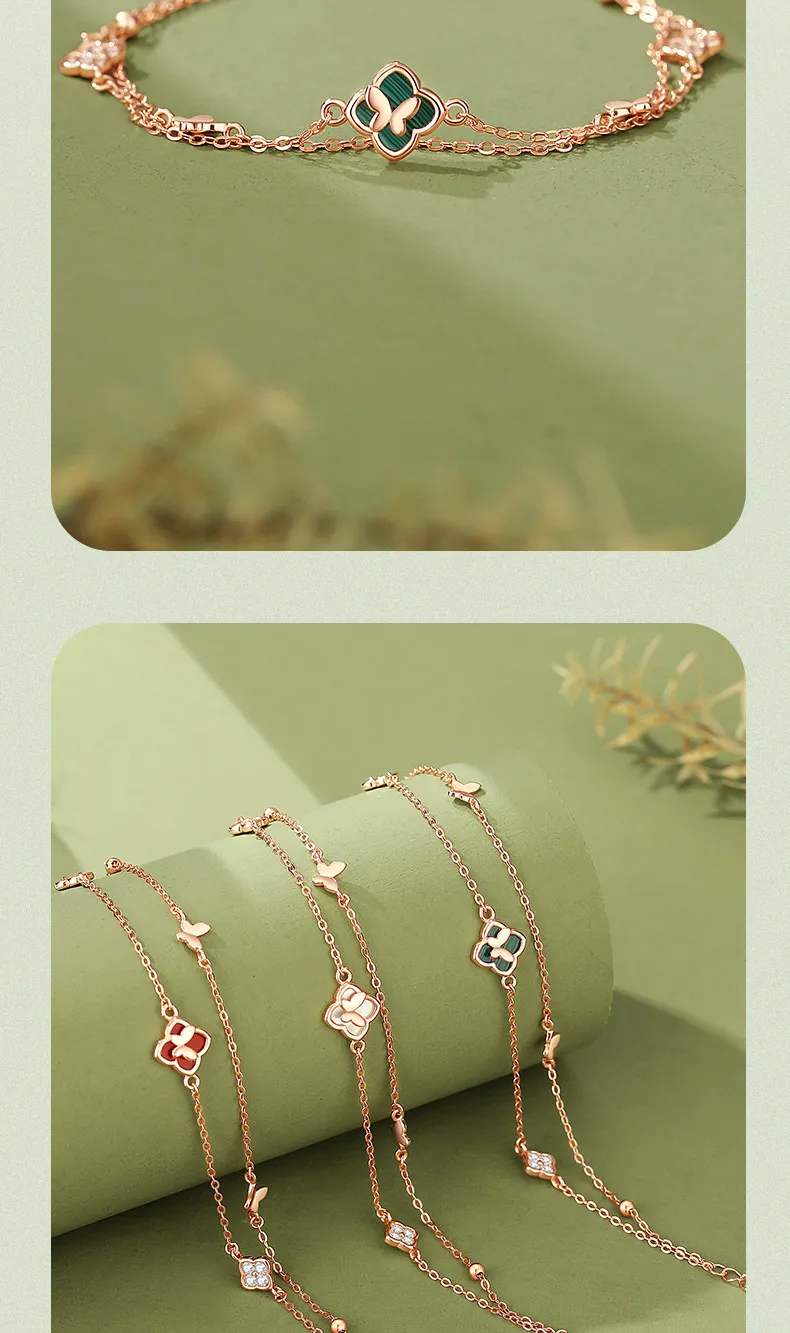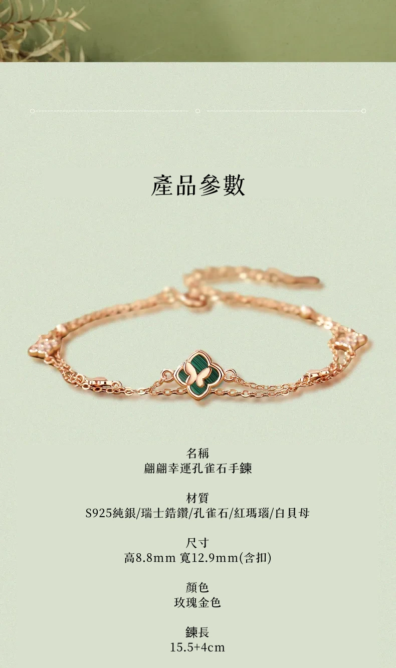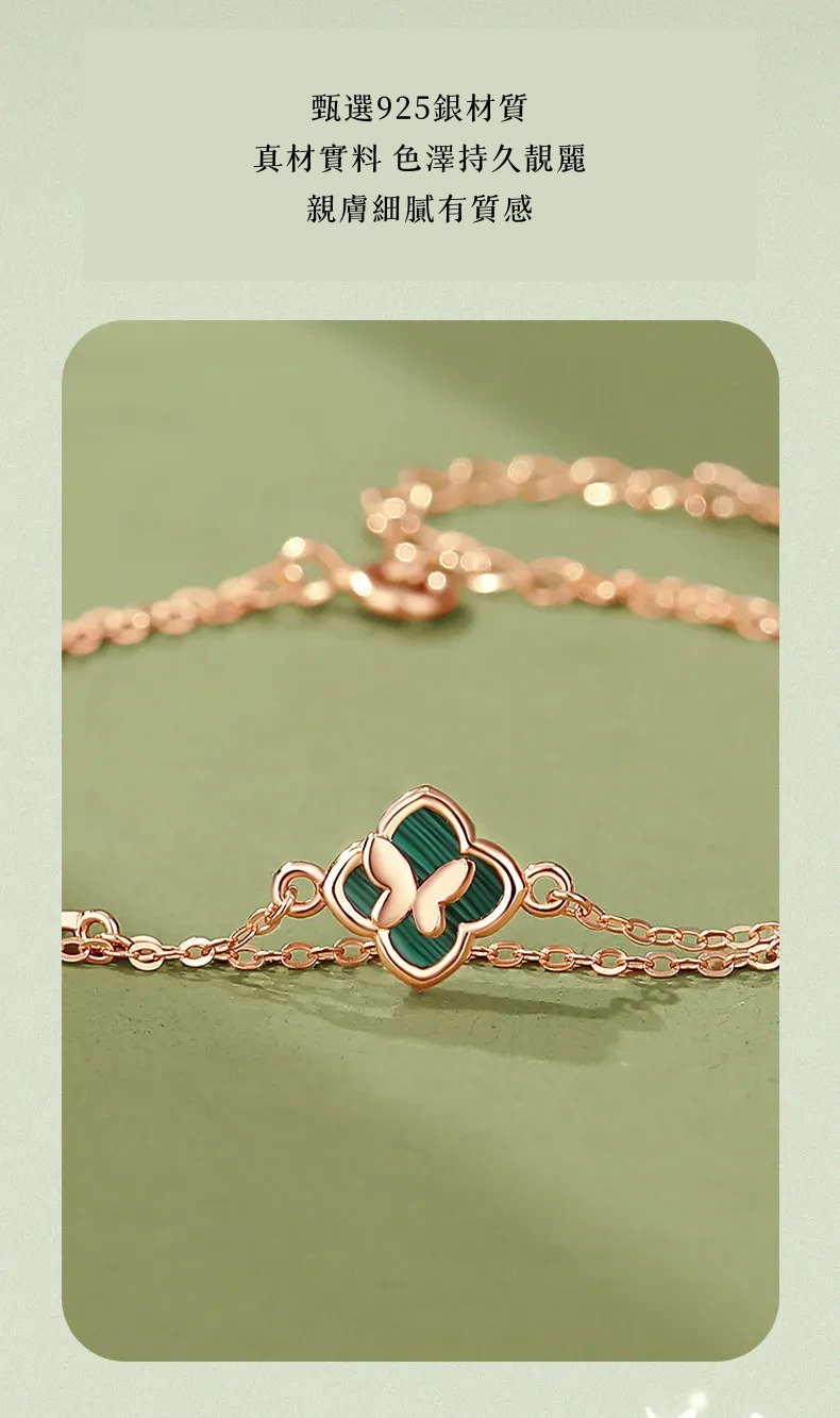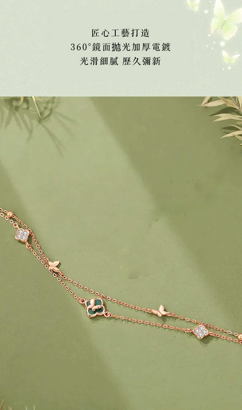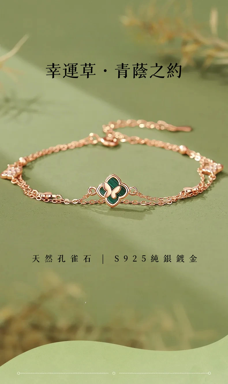 手鍊・幸運草・青蔭之約 | S925純銀電鍍真金 | 孔雀石四葉草 | 雙層疊戴設計 | 玫金色幸運孔雀石四葉草手鍊
