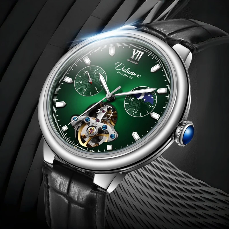 男錶・機械・經緯時計​ | 全自動機械機芯 | 經典三眼計時 | 鏤空陀飛輪錶盤 | 日升月落視窗 | 小牛皮帶 | 30米防水 | Dulunwe高級男士機械手錶