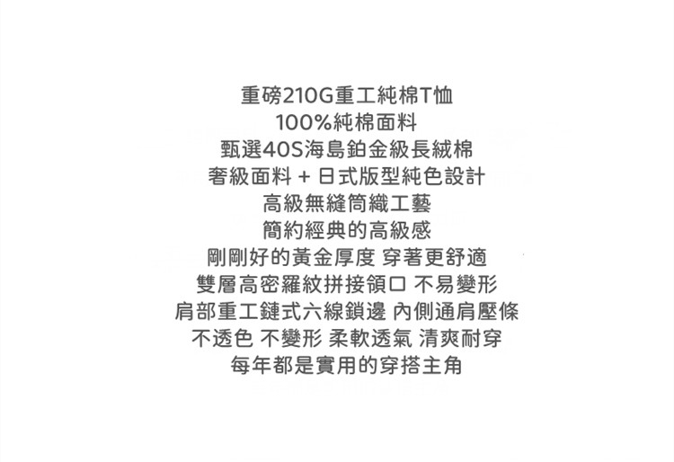 買二送一 | 鉑金級精梳海島長絨棉 | 高級無縫筒織工藝 | 加厚羅紋領口水洗不變形 | 通肩壓條加固 | 工匠級日式重工男女同款時尚版型素T純色T恤